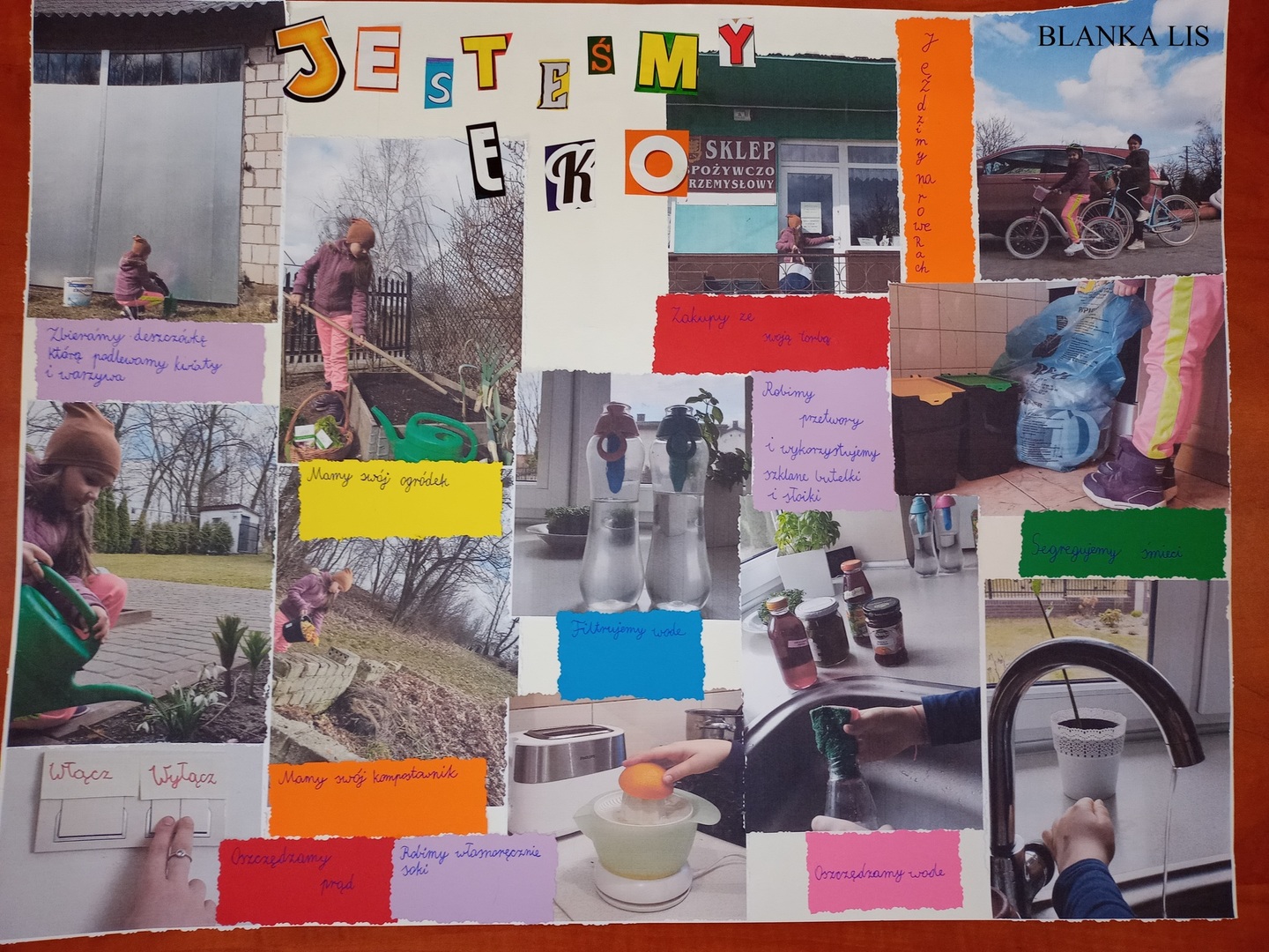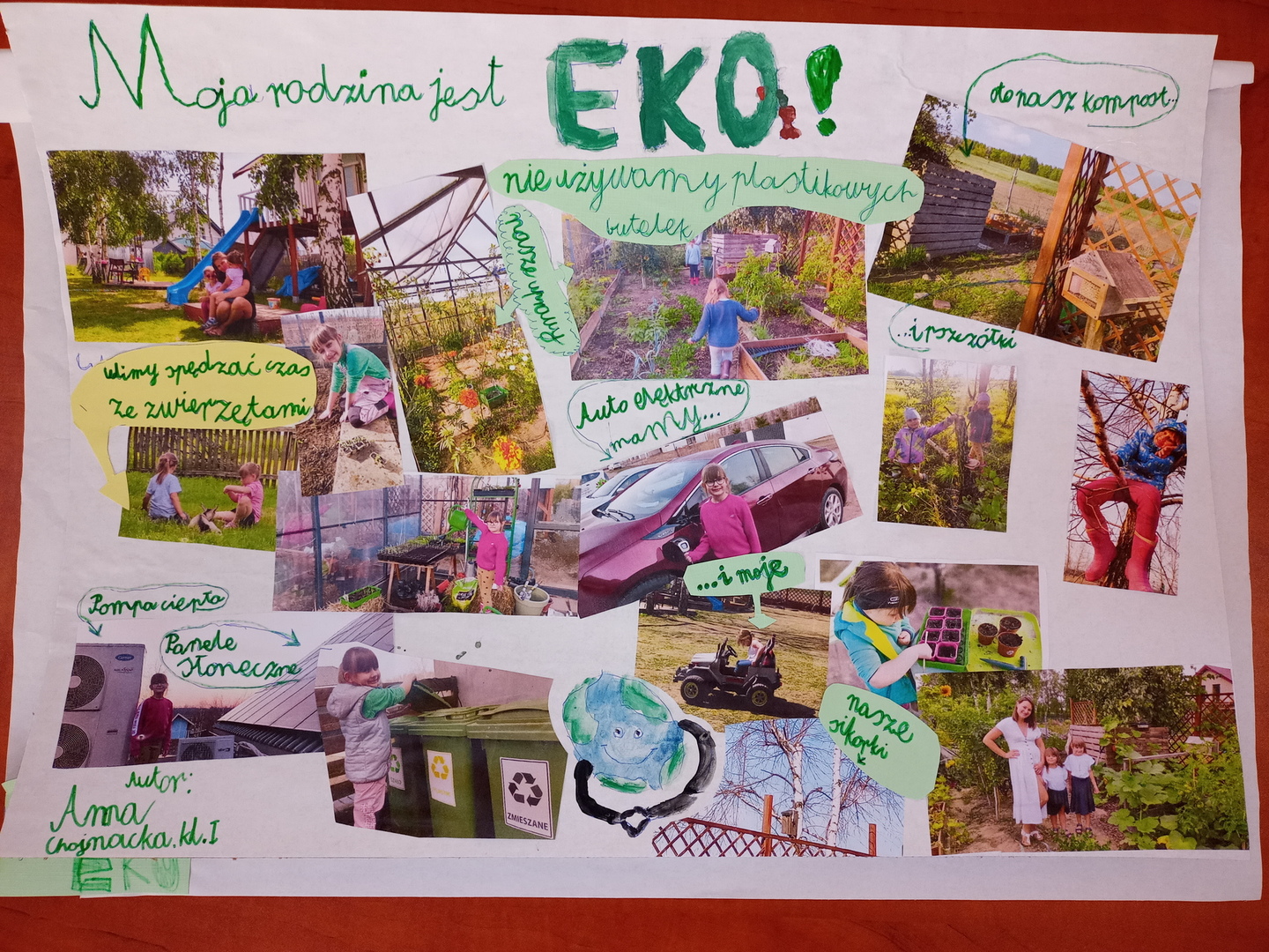 Konkurs polegał na wykonaniu kolażu ze zdjęć pt. „Nasza rodzina jest EKO” i był adresowany do uczniów klas I-III naszej szkoły. Zdjęcia miały przedstawiać jak uczniowie i pozostali członkowie rodziny dbają o środowisko w życiu codziennym. Chętni uczniowie dostarczyli do szkoły swoje prace wykonane na kartonach formatu A2.