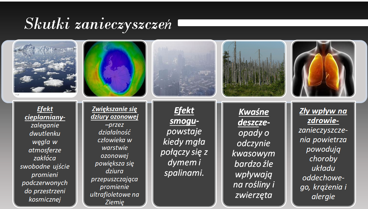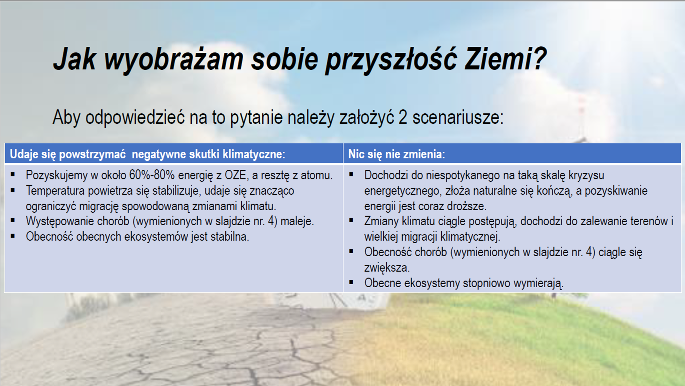 w których poruszali problemy związane z zanieczyszczeniami powietrza: czym są i jak powstają, co to jest smog, jakie są skutki zanieczyszczeń powietrza i jaki mają wpływ na życie ludzi i środowisko, zmiany klimatyczne, alternatywne metody pozyskiwania energii elektrycznej, globalne skutki zanieczyszczenia powietrza. Przy okazji dyskutowali również jak widzą przyszłość naszej planety, analizowali i próbowali rozwiązywać problemy badawcze w oparciu o nabyte wiadomości.
