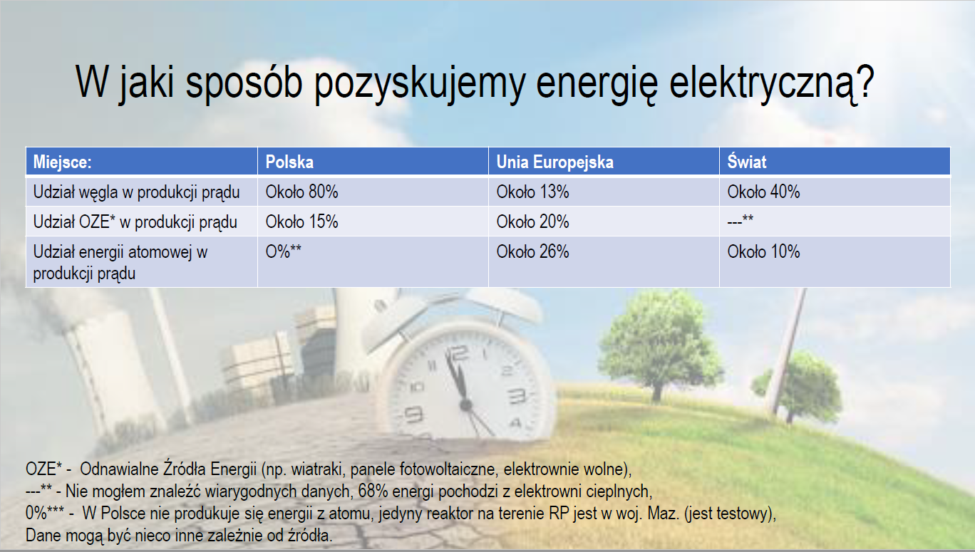 w krajach Europy i w Polsce - gdzie dominują głównie elektrownie cieplne, dyskutowali, jakie warunki panują w Polsce do wykorzystania innych źródeł energii niż tylko węgiel. Omawialiśmy również: jak powstają kwaśne opady, co to są i gdzie się znajdują zielone płuca Ziemi – zwracając uwagę na ekologiczne następstwa wylesiania Amazonii. Czym są porosty