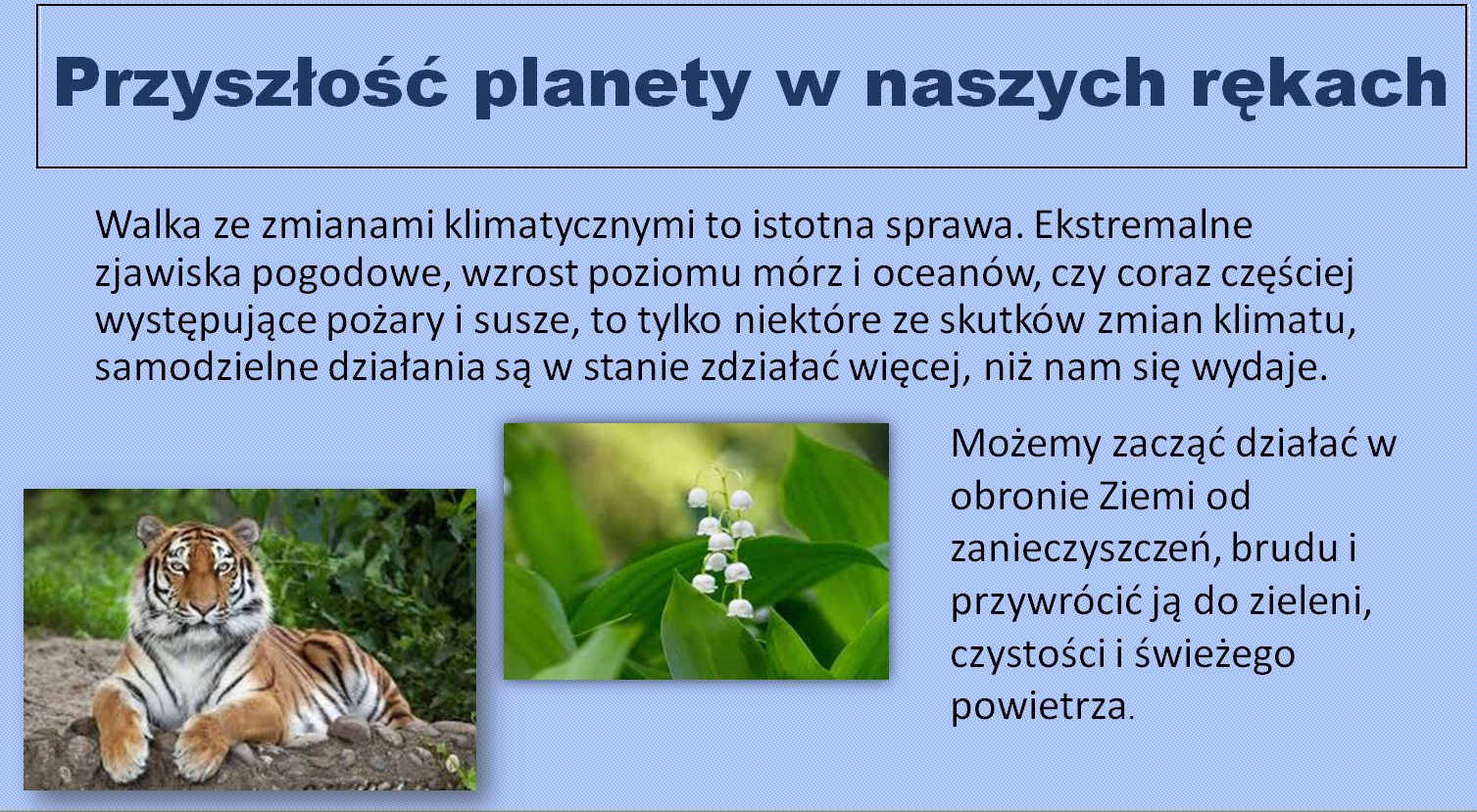 Również podczas codziennych lekcji przyrody, biologii czy geografii uczniowie mogli nawiązywać do tematyki projektu. Omawiali: jak dbać o układ oddechowy, jakie są źródła energii elektrycznej – tu zwrócili uwagę na strukturę produkcji energii elektrycznej
