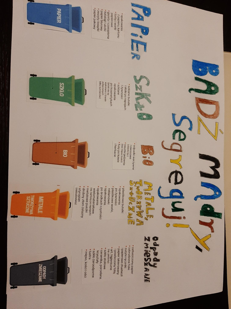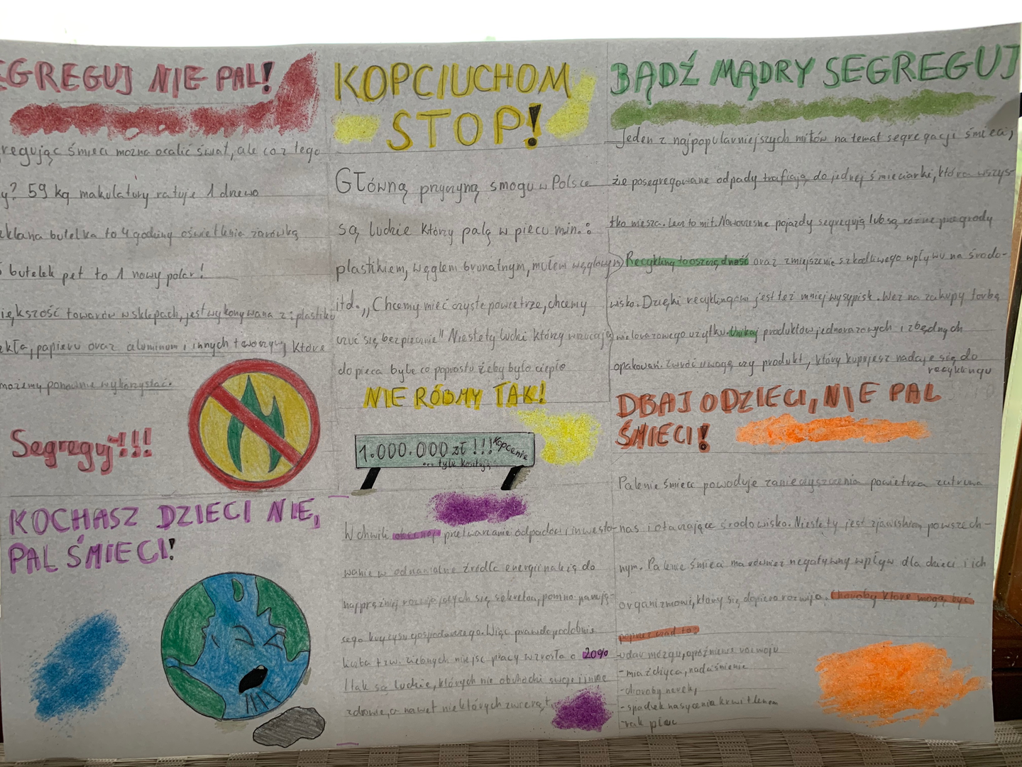 W ramach koła ekologicznego uczniowie przygotowali plakaty przedstawiając hasła: „Kochasz dzieci, nie pal śmieci”, „Kopciuchom STOP”, „Bądź mądry, segreguj”. Stworzyli je jako swój protest przeciwko zanieczyszczaniu i degradacji środowiska i przedstawili, aby promować życie w zgodzie z przyrodą. Chcieli w ten sposób przypomnieć, ze sami decydujemy o przyszłości naszej planety.