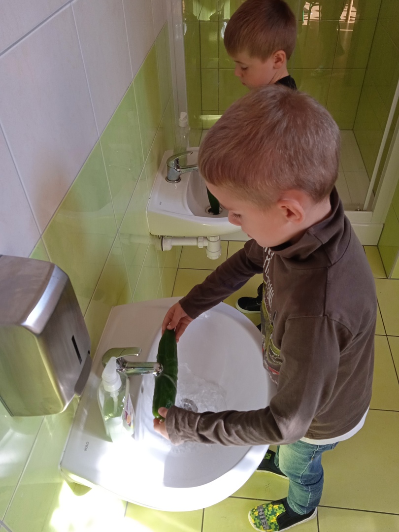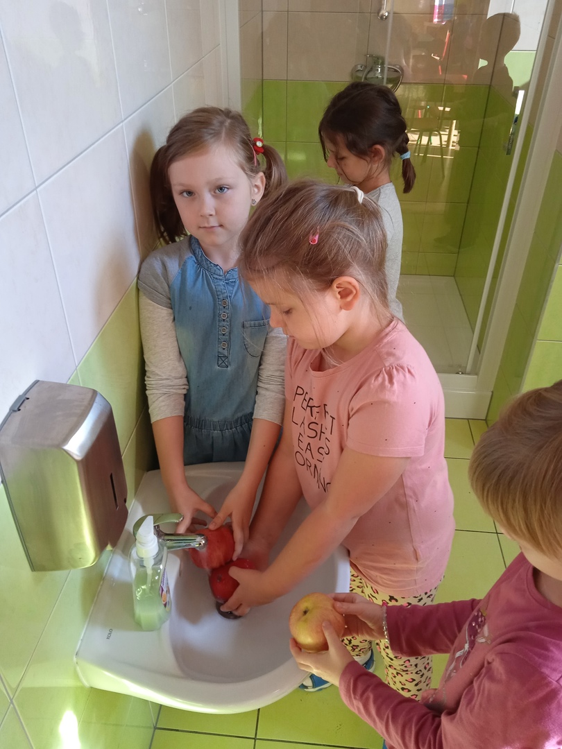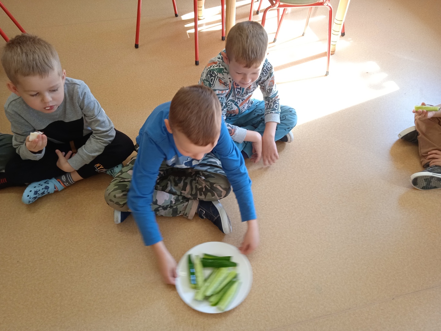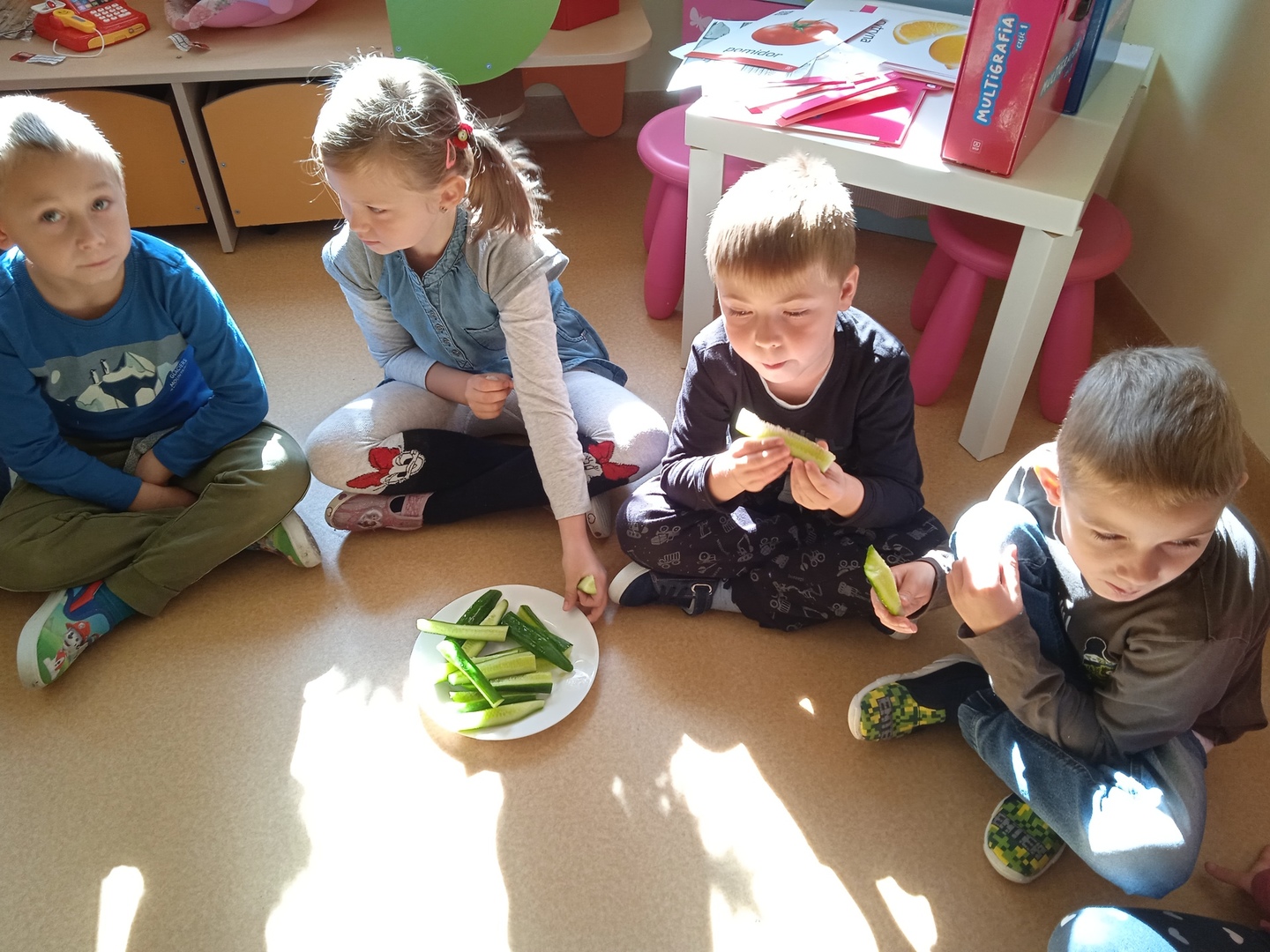 Kupiły pyszne owoce ( jabłka) oraz warzywa (paprykę i ogórki). Po powrocie próbowały kupione przez siebie smakołyki.