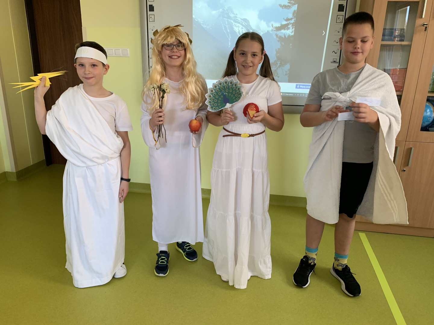 Uczniowie z zaangażowaniem przystąpili do realizacji zadania, wykazując się pomysłowością oraz kreatywnością. Swoje wystąpienia wzbogacili ciekawostkami na temat przedstawianej postaci. Dzięki temu w czasie zajęć mogli bliżej poznać historię Zeusa, Hery, Ateny, Hefajstosa, Hadesa czy Afrodyty.