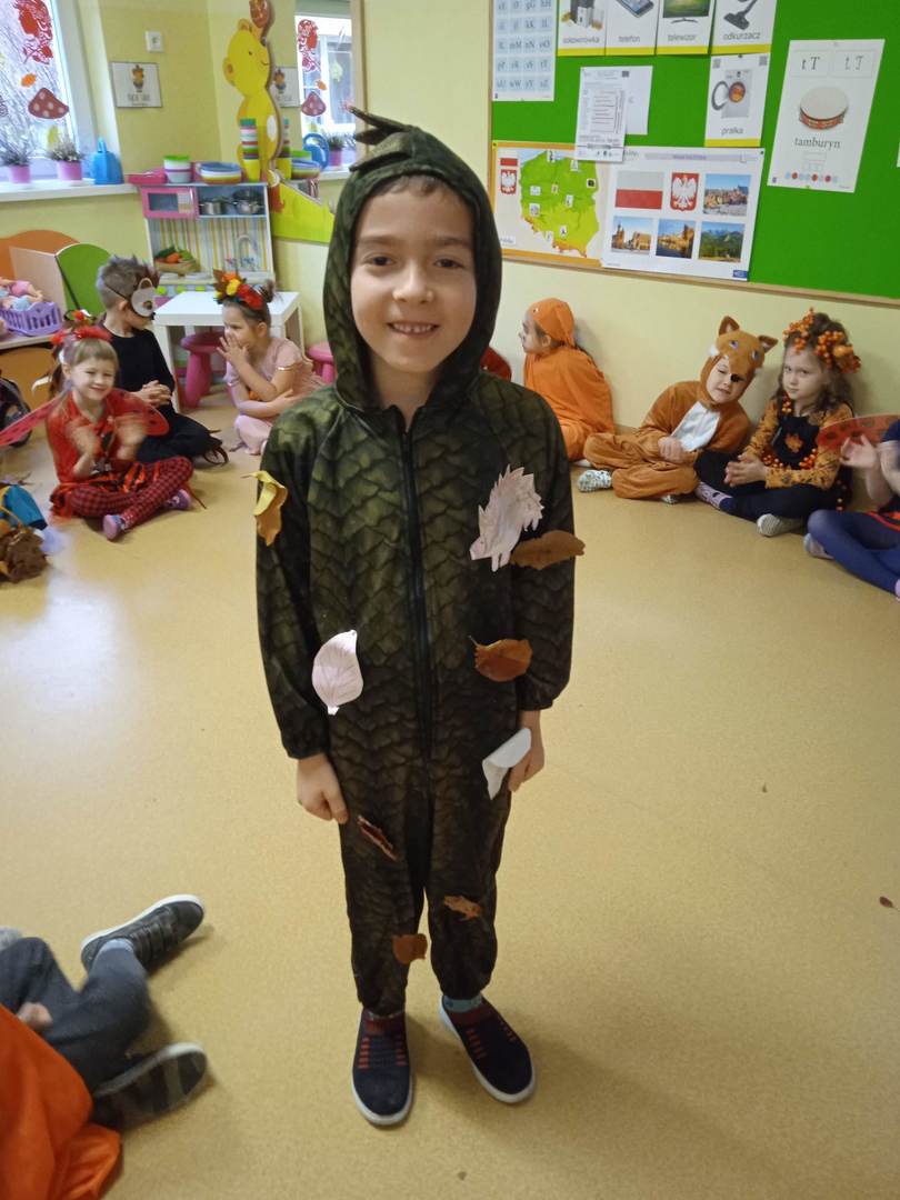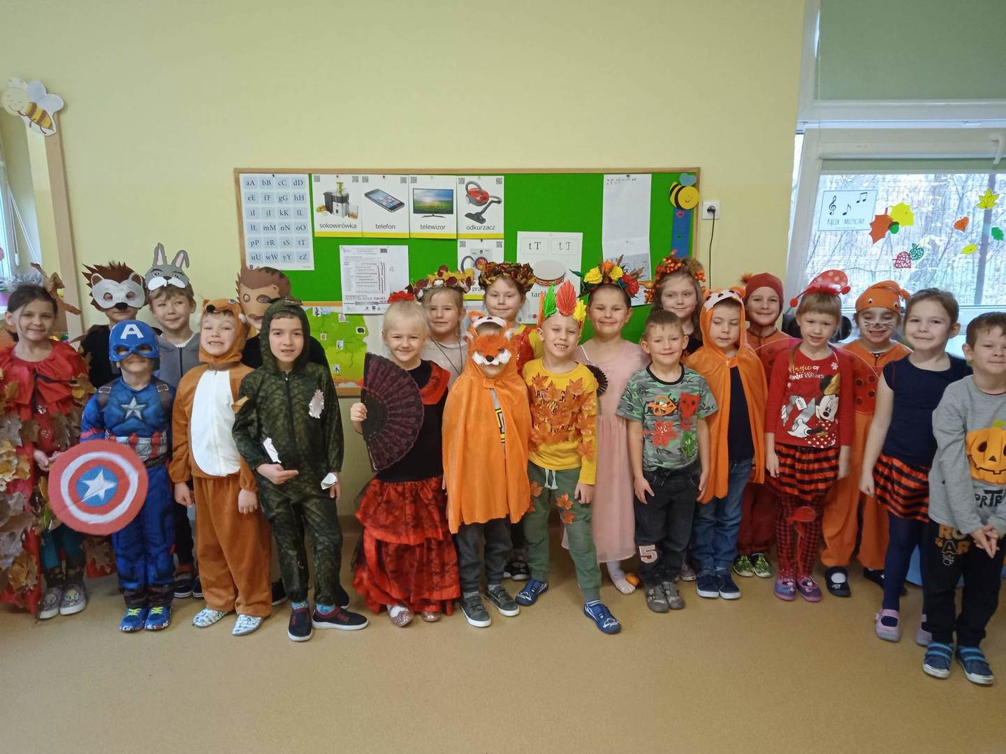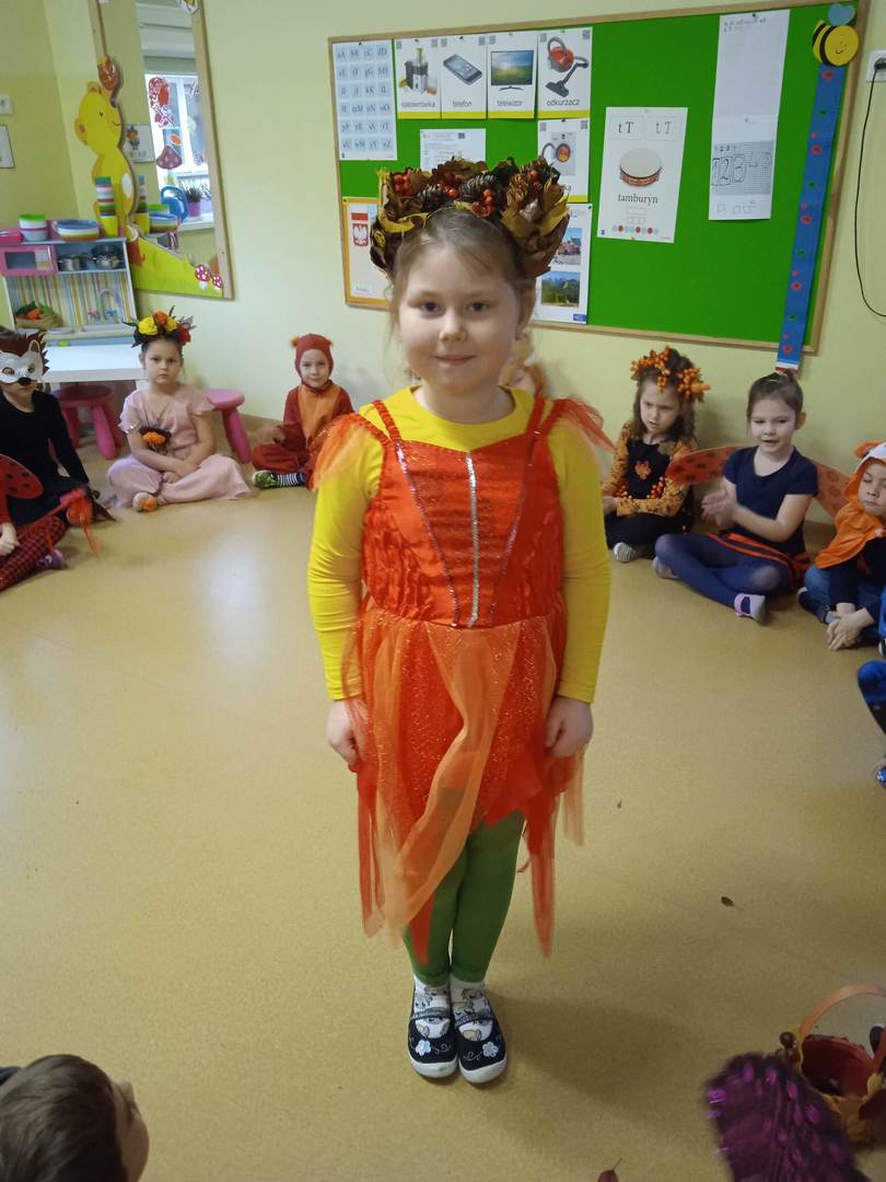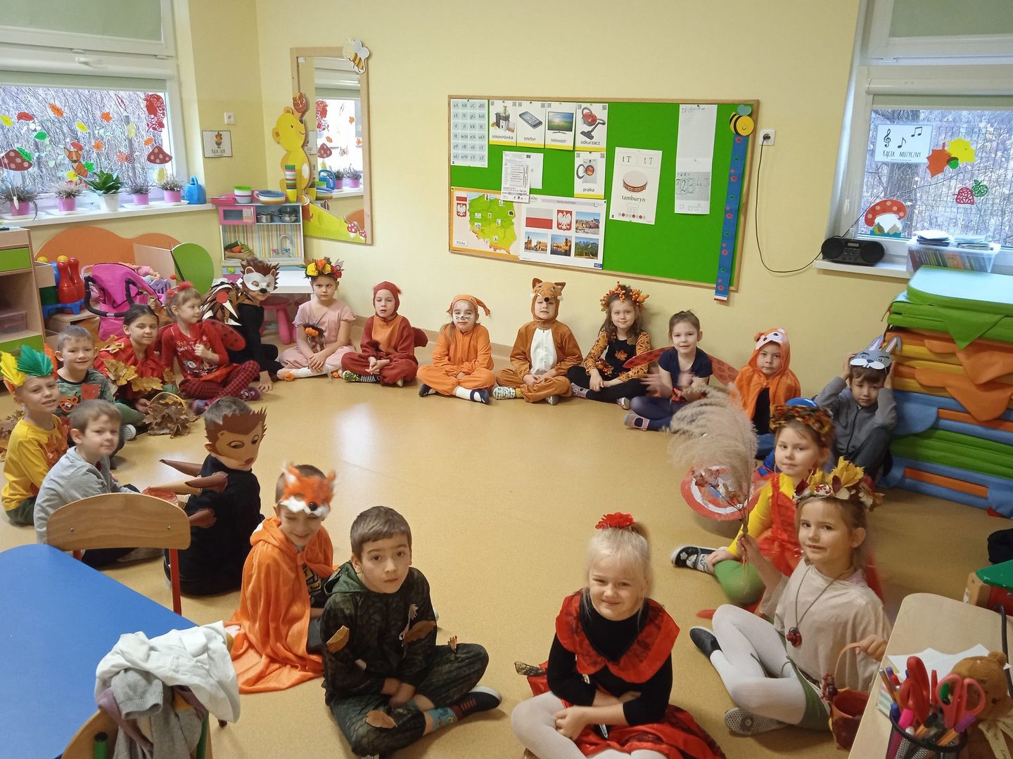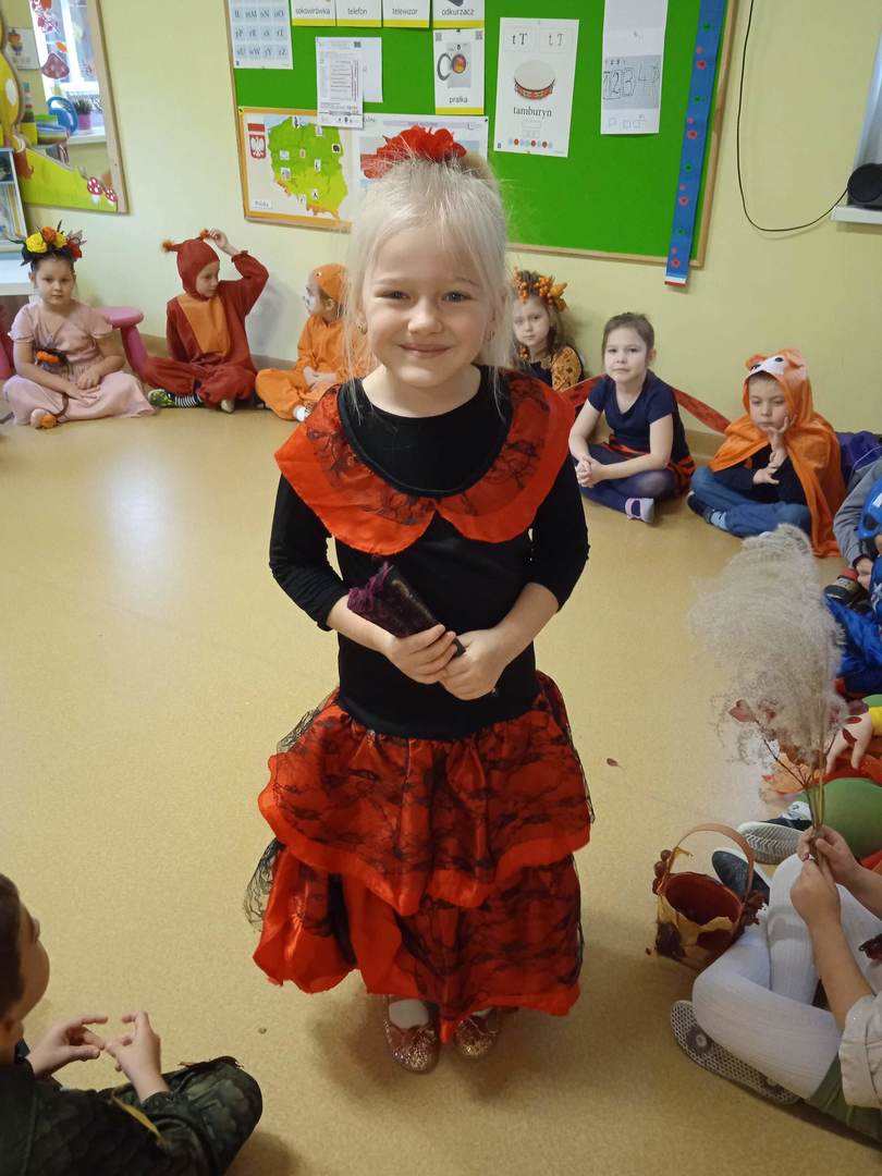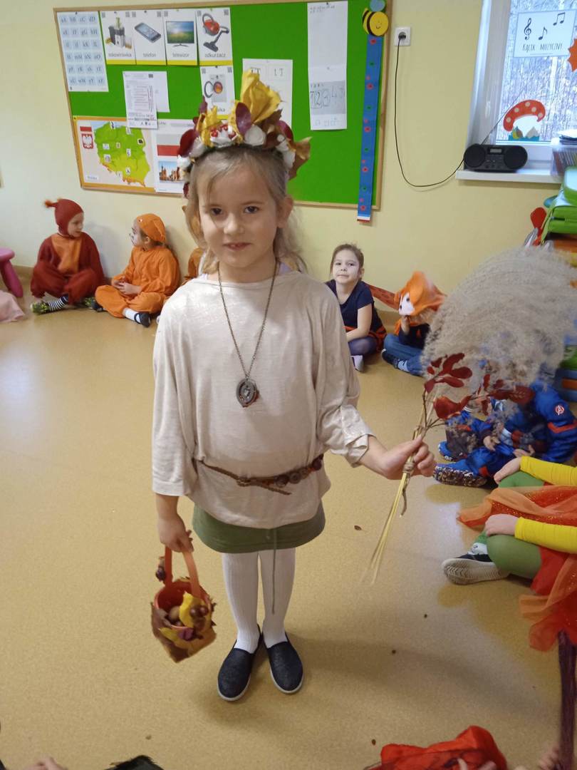 W dniu 15 listopada 2021 r. w Oddziałach Przedszkolnych odbył się ,,Bal Pani Jesieni”. Dzieci tego dnia były przepięknie ubrane w stroje w kolorach jesieni, w koronach z kolorowych liści, w jarzębinowych koralach. Tak przygotowane powitały wyjątkowego gościa - Panią Jesień, która przygotowała dla przedszkolaków moc atrakcji. Zadbała też, by dla wszystkich znalazło się na balu coś ciekawego, była gimnastyka umysłu - dzieci rozwiązywały quiz o tematyce jesiennej, podczas którego utrwalały zdobyte wiadomości. Były również zagadki na rozpoznanie darów jesieni, warzyw i owoców jesiennych.