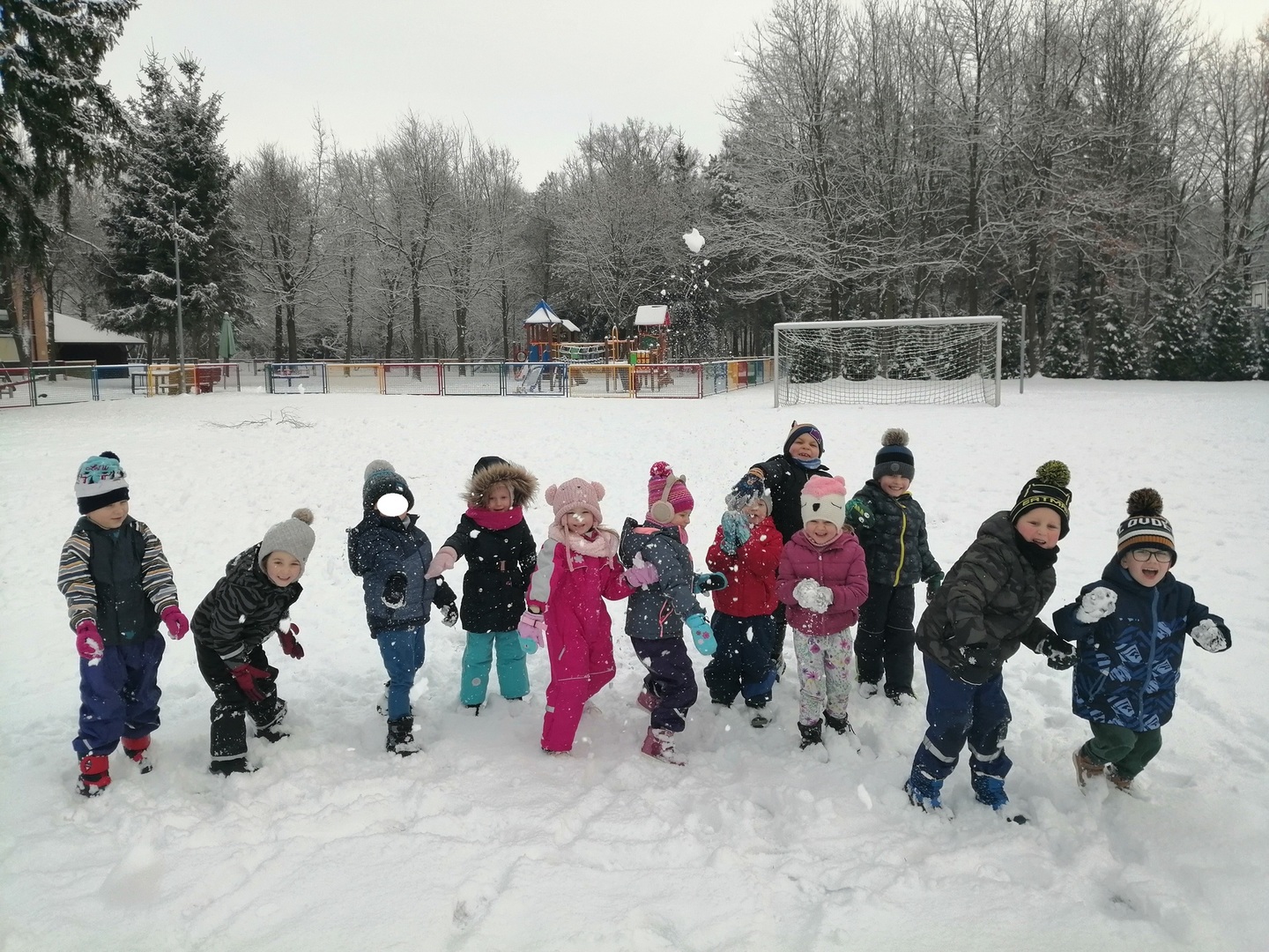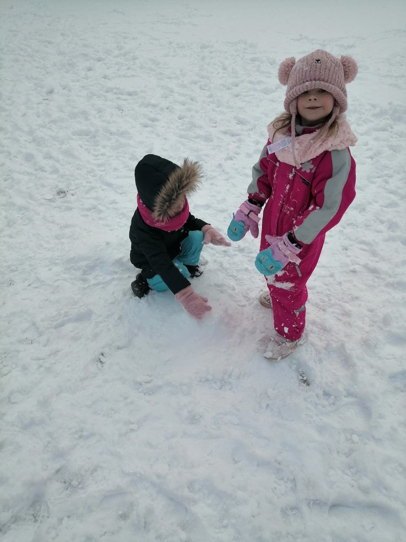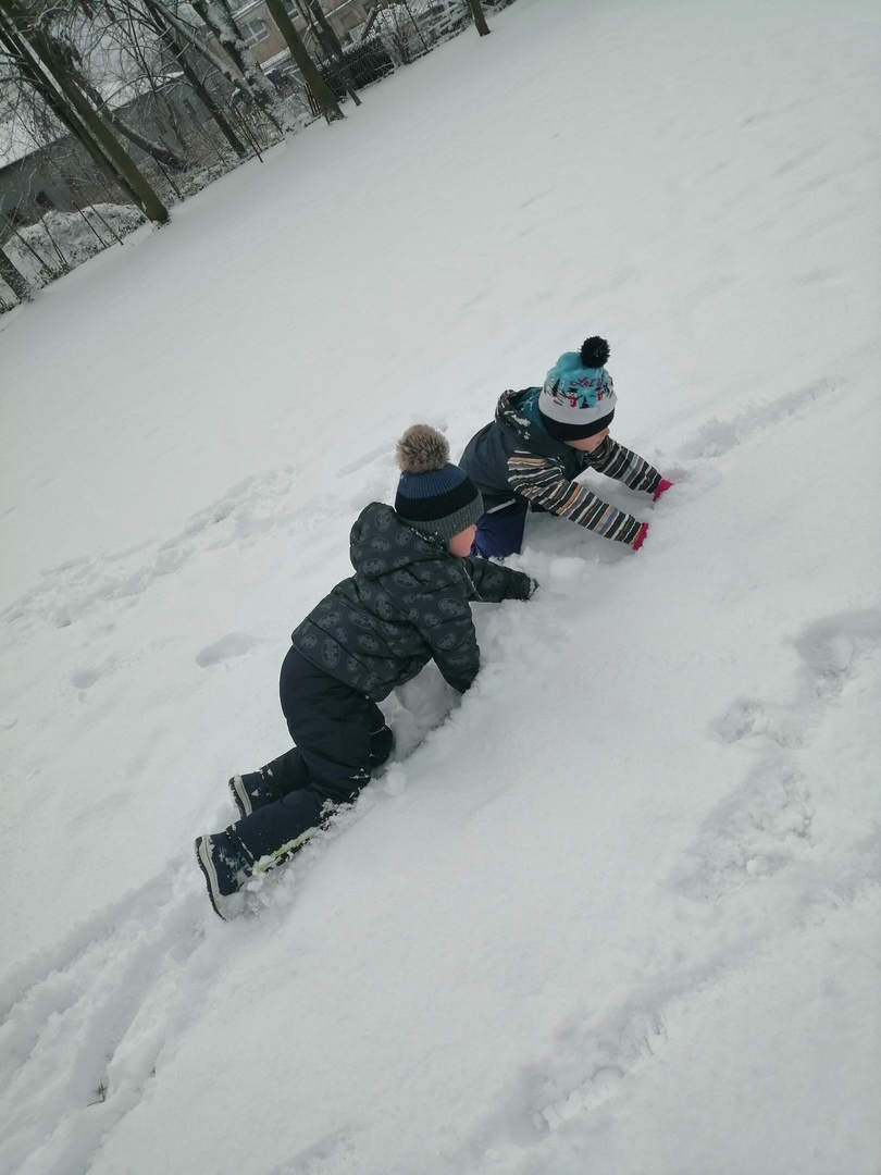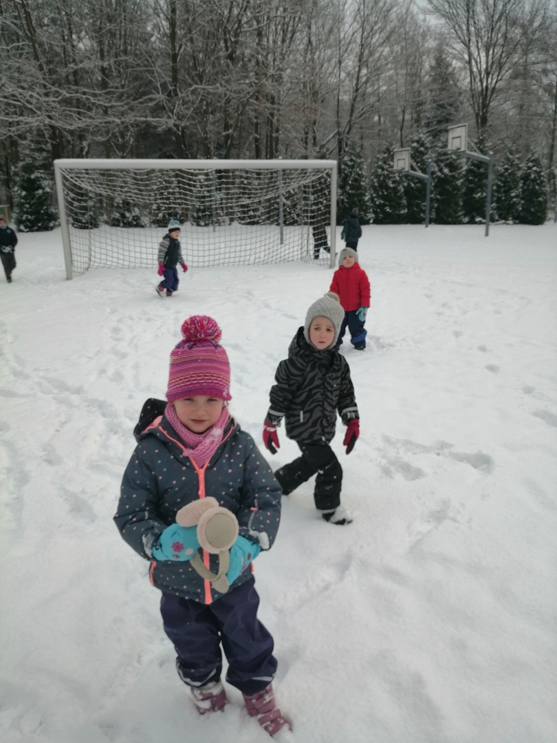 Korzystając z uroków zimy - pięknej, śnieżnej pogody - przedszkolaki wyposażone w rękawiczki i grube spodnie wybrały się na śnieżne szaleństwo. Rzucanie się śnieżkami, chodzenie po śladach, robienie aniołków na śniegu oraz lepienie bałwana sprawiły dzieciom wiele radości. Nieco zmarznięte lecz szczęśliwe i pełne wrażeń dzieci wróciły do swoich zajęć.