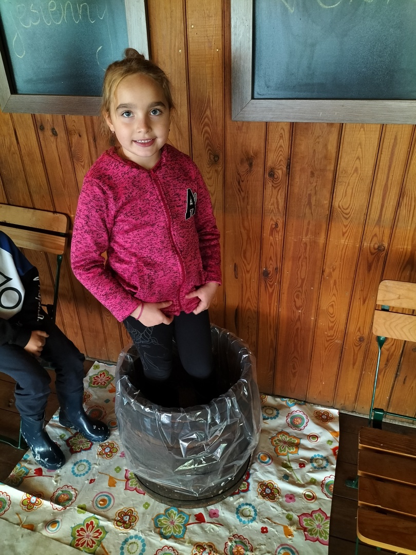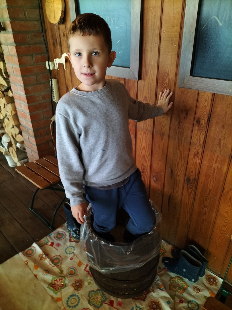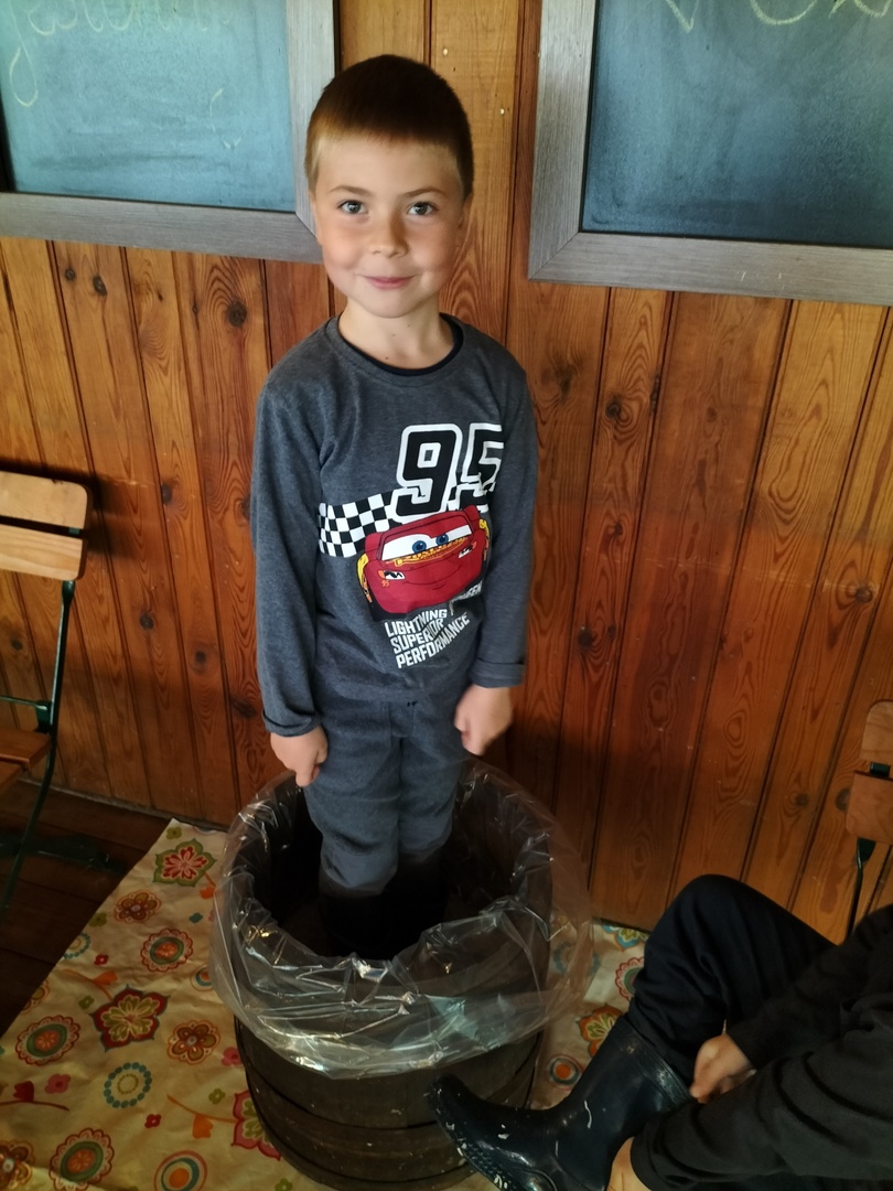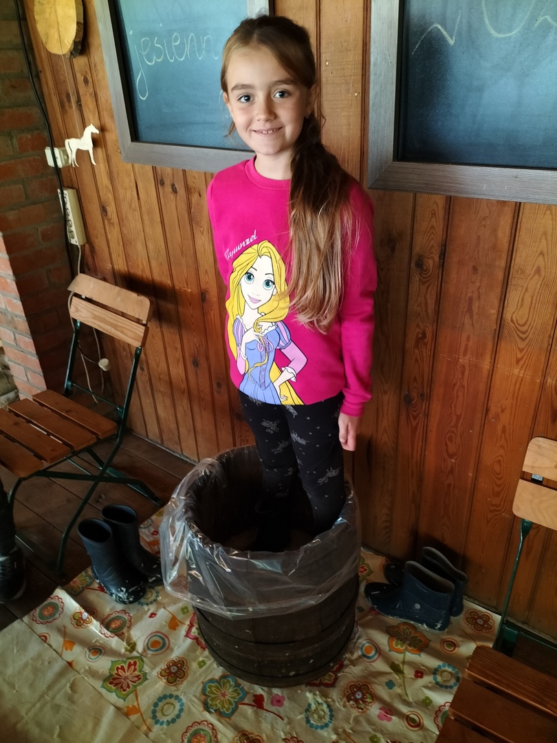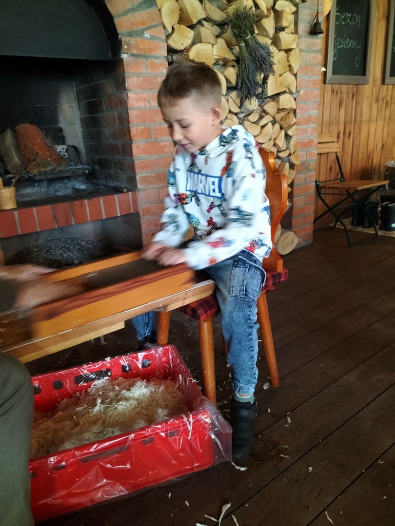 Następnie wszyscy poszli na pole, aby w praktyce zobaczyć, jak zbiera się ziemniaki. Potem pierwszoklasiści szatkowali kapustę i deptali ją w drewnianej beczce.