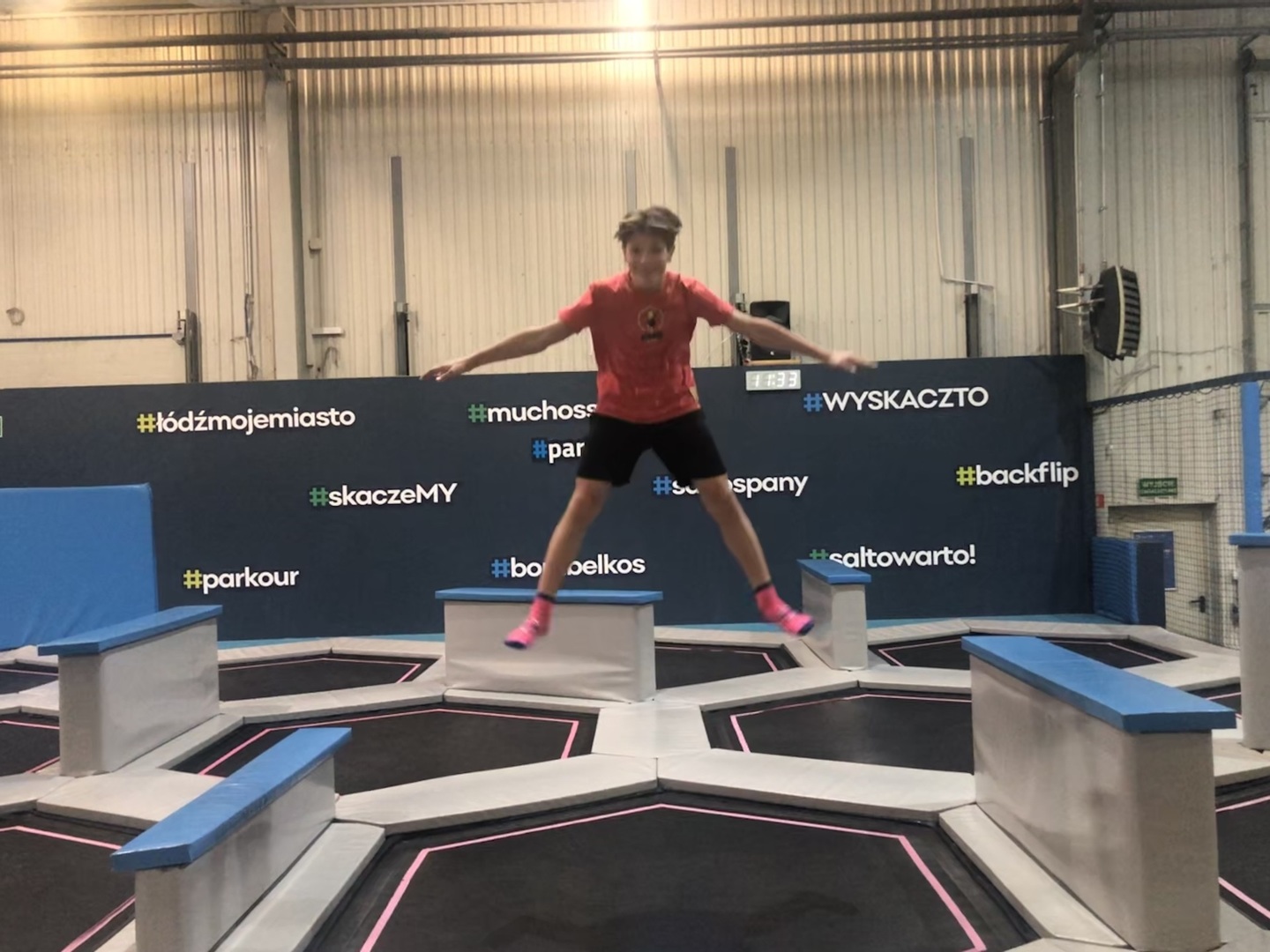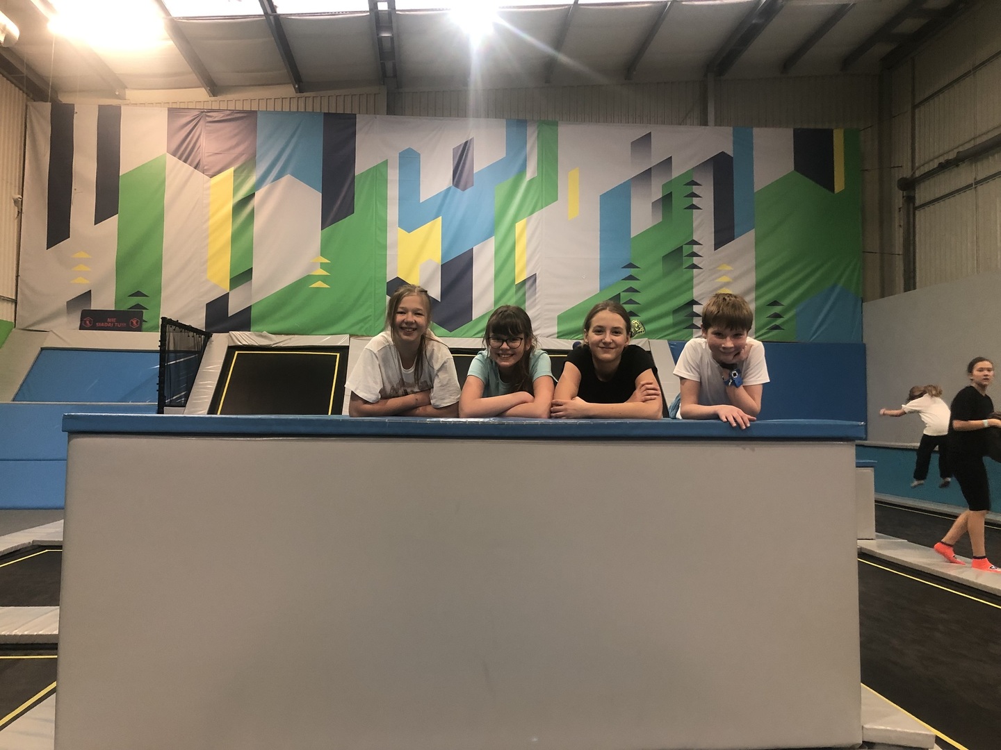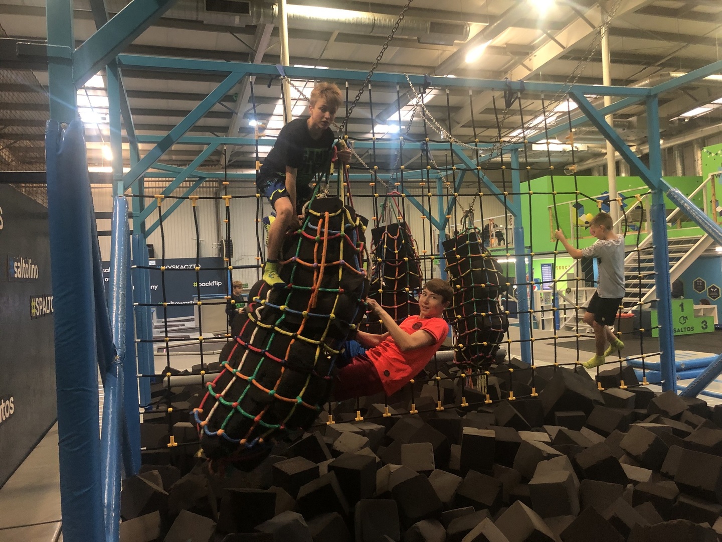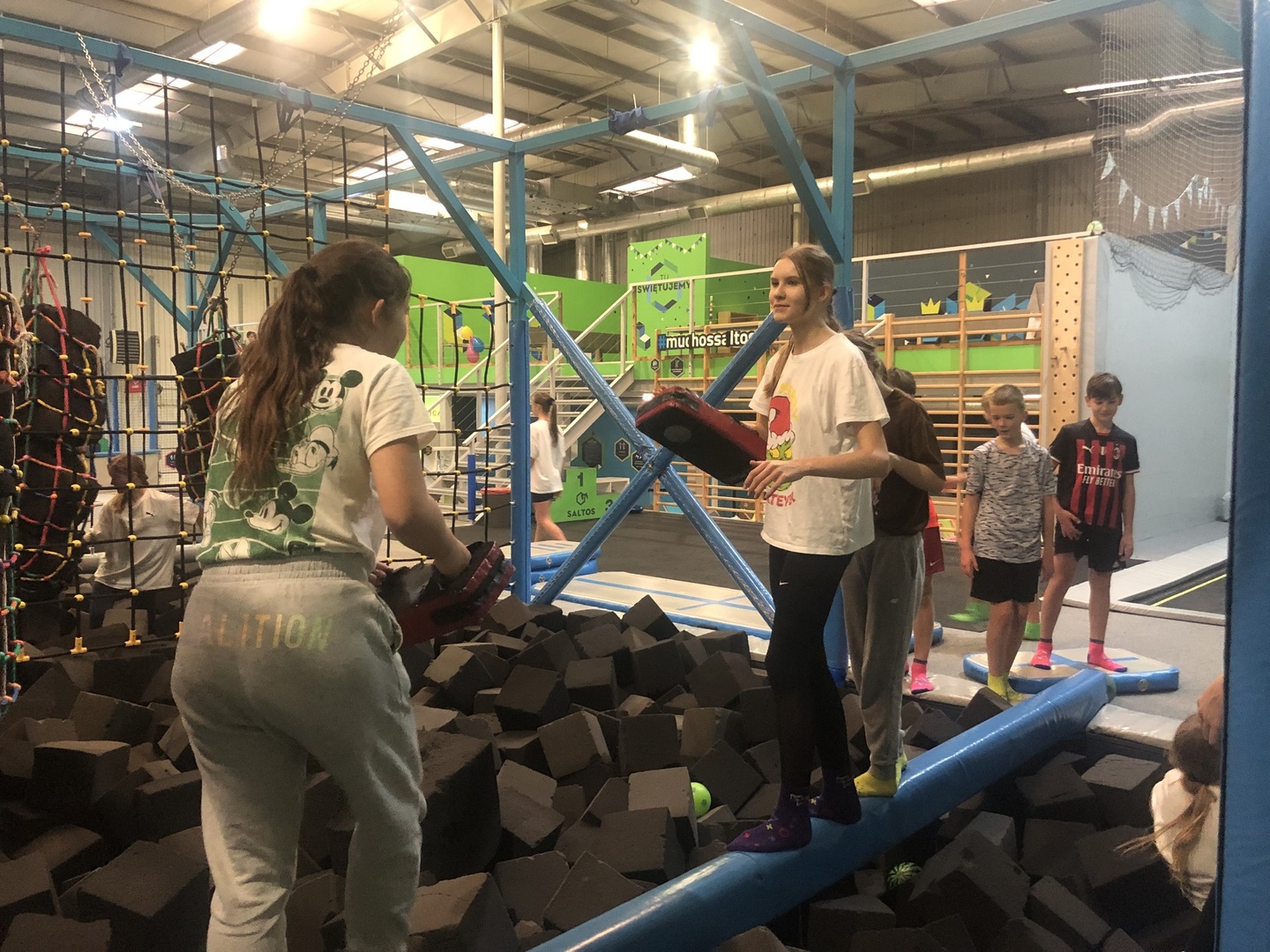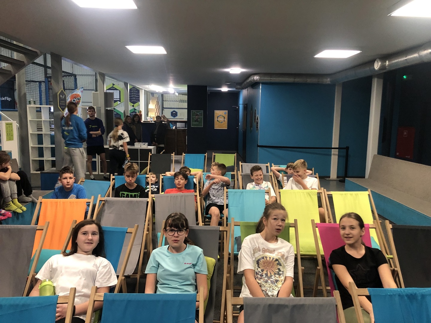 Klasa VI i VIIIA na lekcji w-f na trampolinach.