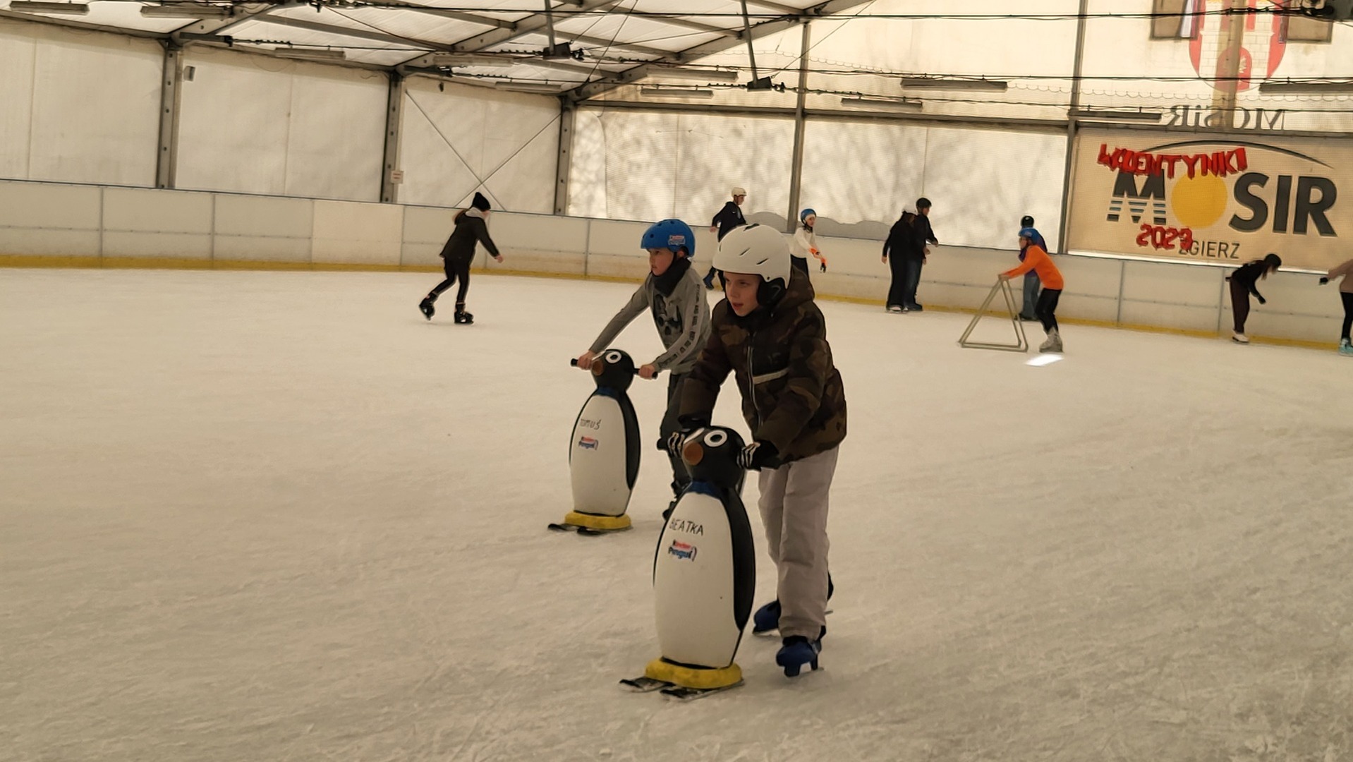 Wyjście na lód zajęło uczniom trochę czasu. Najpierw trzeba było wypożyczyć łyżwy i dopasować do swojego rozmiaru buta, co nie każdemu udało się za pierwszym razem. Gdy wszyscy byli już gotowi, postanowiliśmy wejść na taflę i rozpocząć zabawę. Niektórzy przybyli tu pierwszy raz, ale zapewniali, że nie ostatni, ponieważ frajda jazdy po lodzie była przeogromna. Na tafli można było obserwować odważnych i zaawansowanych łyżwiarzy, ale też bardzo ostrożnych, trzymających się bandy nowicjuszy. Przekrój umiejętności był duży, ale wszystkim towarzyszył uśmiech, dobry humor i poczucie doskonałej zabawy. Nie obyło się bez upadków, czasem przydała się koleżeńska pomoc, ale mimo wszystko była to prawdziwa frajda.