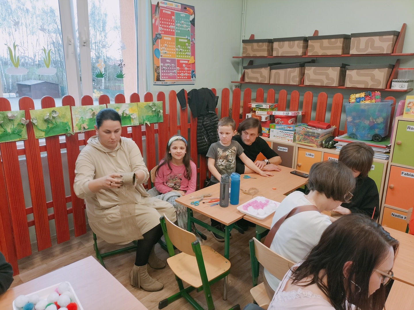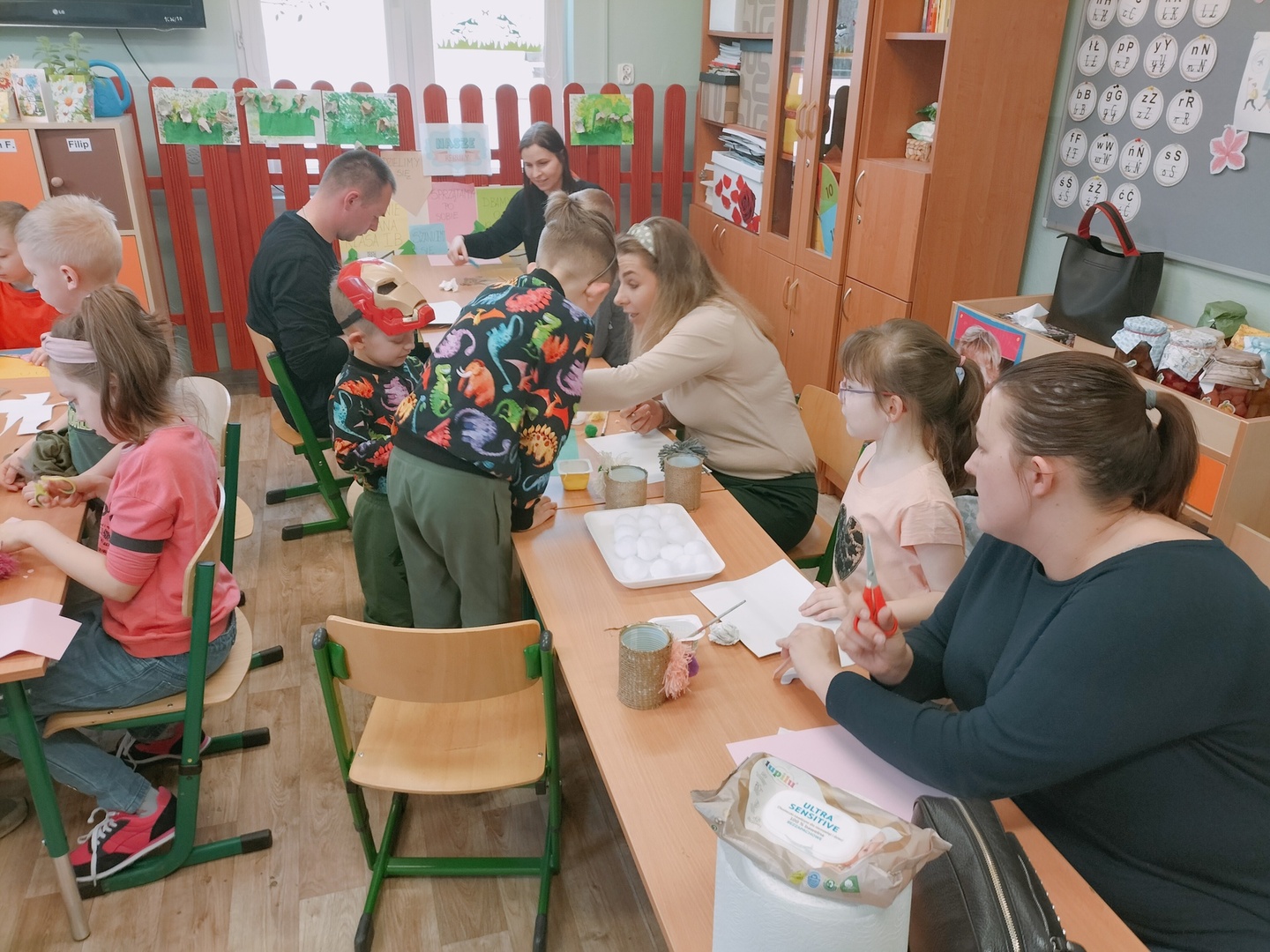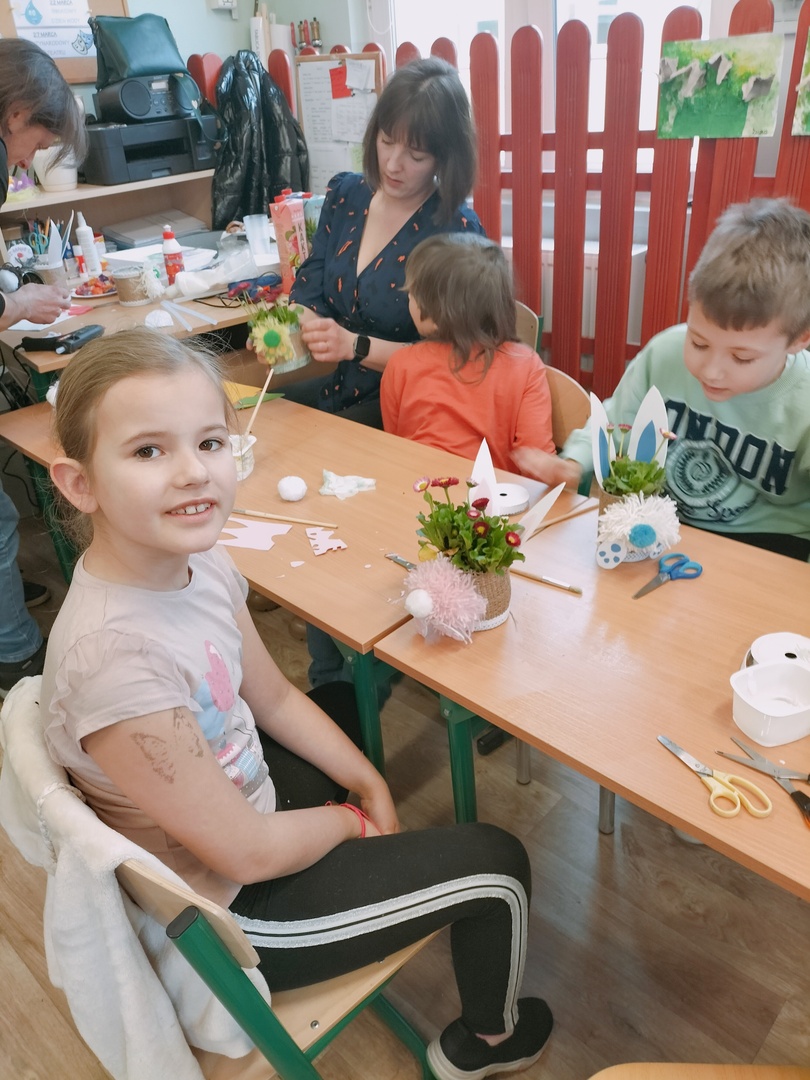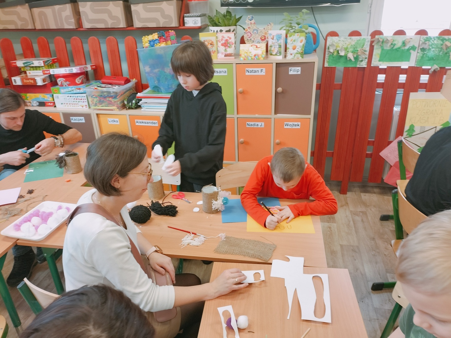 W czasie zajęć na dzieci czekało wiele niespodzianek. Zajączek wielkanocny zostawił jajka z niespodziankami, a uczniowie musieli je odnaleźć i utworzyć z nich obrazek. Szarak prosił uczniów, aby zjadły marchewkę, żeby mieć siłę do zabawy. Następnie dorośli i dzieci wykonali pracę z włóczki i materiałów papierniczych. Jej efektem były wesołe zajączki.