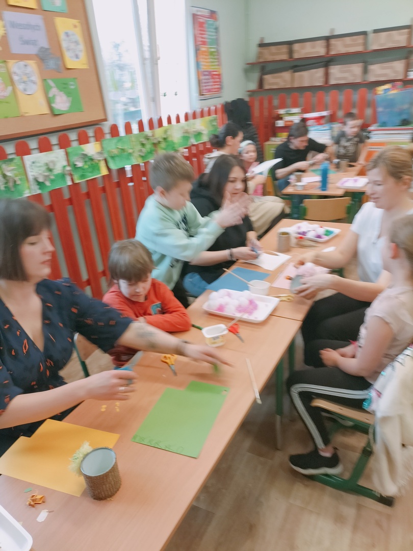 Pierwszoklasiści wraz z rodzicami zamienili salę w pracownię plastyczną.