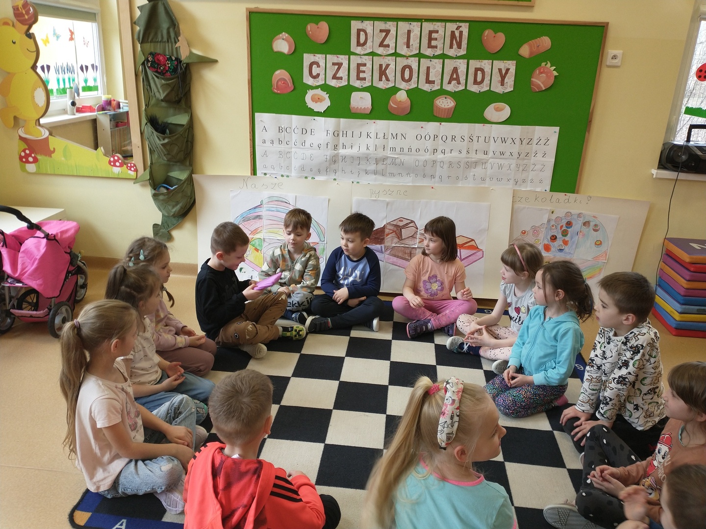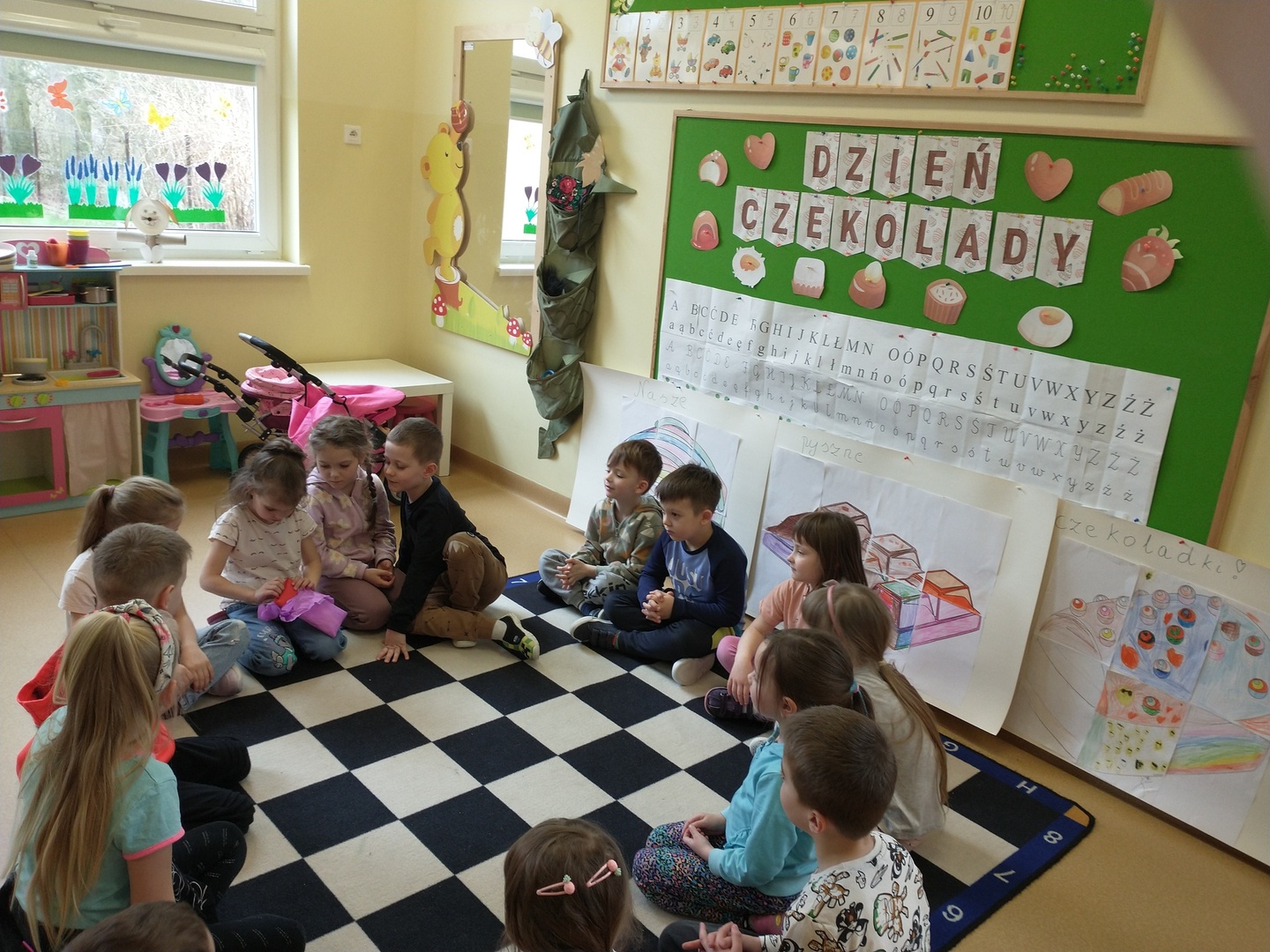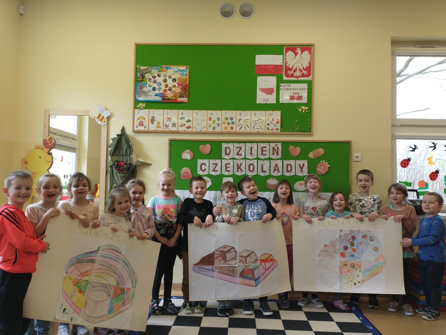 12 kwietnia br. w naszym przedszkolu obchodziliśmy Światowy Dzień Czekolady. Dzieci z grupy ,,Pszczółki” w znakomitym humorze, pełne zapału do zgłębiania wiedzy na temat czekolady, dowiedziały się jak powstaje ich ulubiony przysmak. Stworzyły wspólną kolorowankę przedstawiającą smakowite czekoladki.