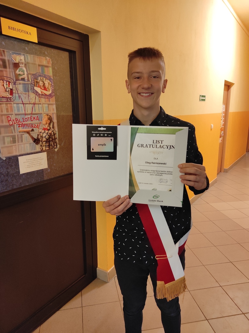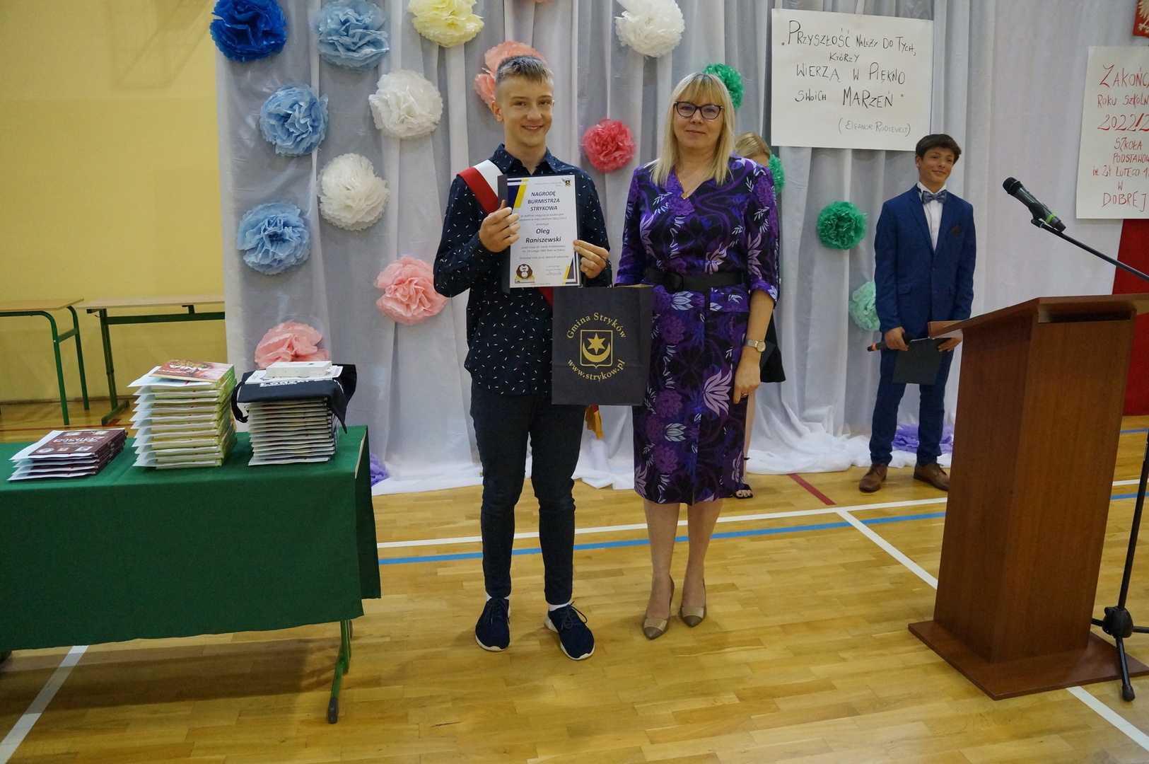 Podczas uroczystego zakończenia roku szkolnego Pani Dyrektor, gratulując wszystkim sukcesów, wręczyła wyróżnienia i nagrody tym spośród uczniów, którzy osiągnęli wysokie wyniki w nauce. Nagrodę Burmistrza Strykowa Witolda Kosmowskiego oraz Łódzkiego Banku Spółdzielczego otrzymał uczeń klasy siódmej Oleg Raniszewski, który uzyskał średnią 5,71.