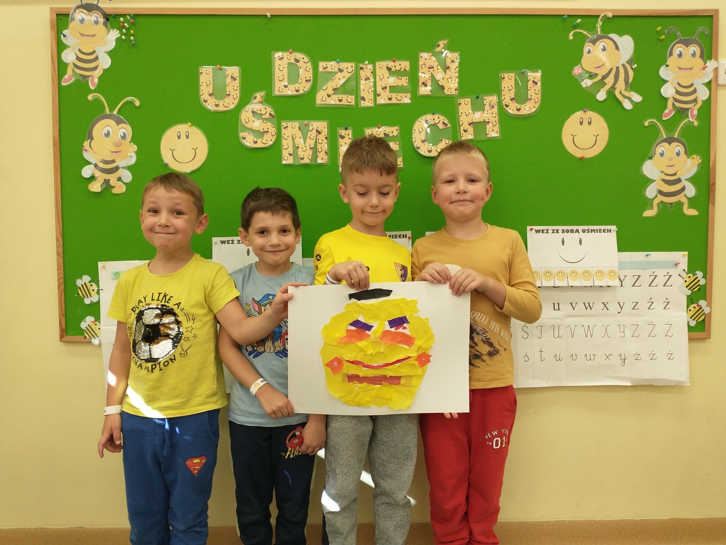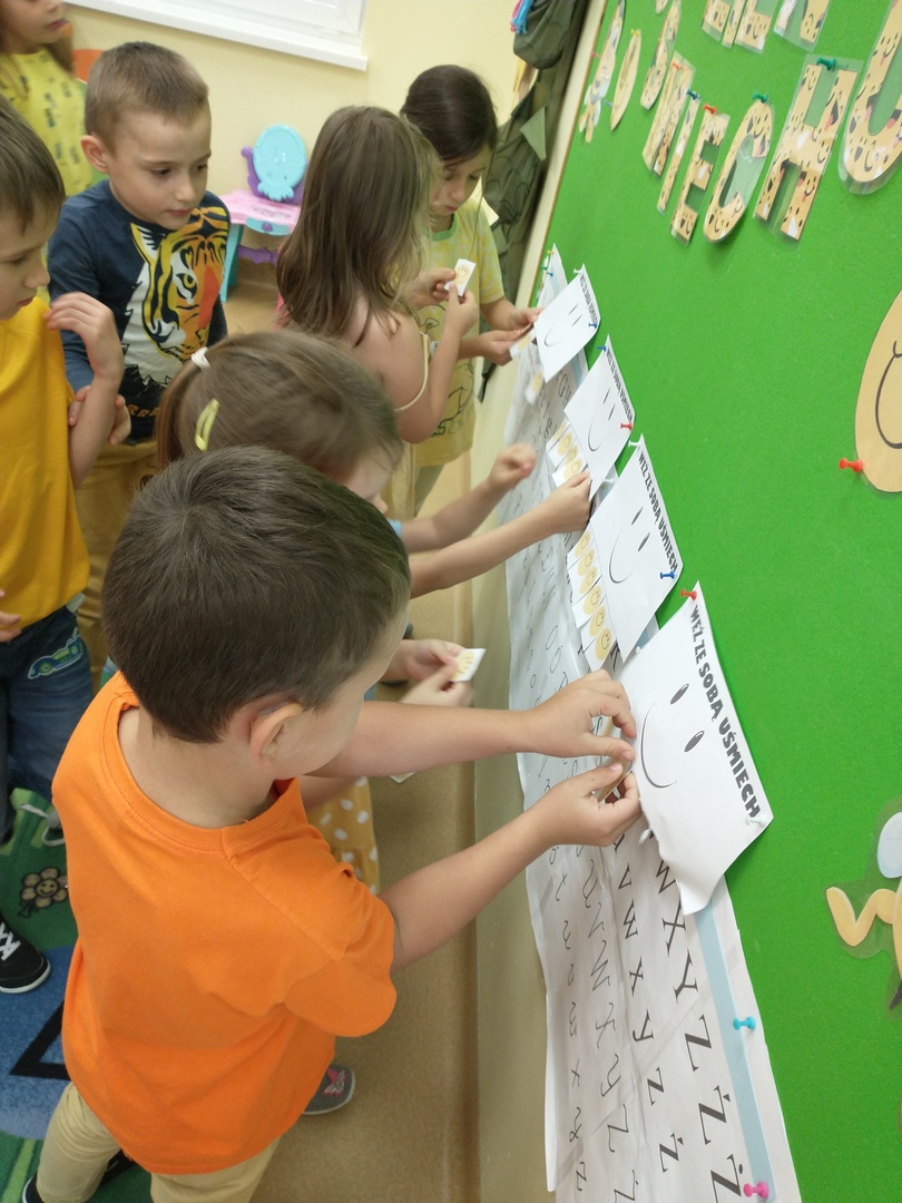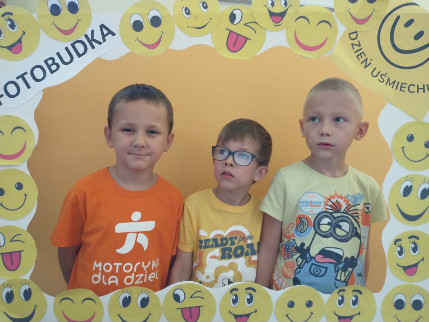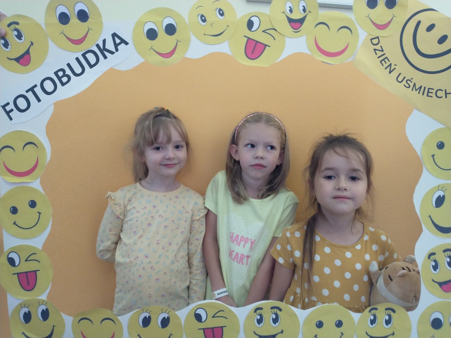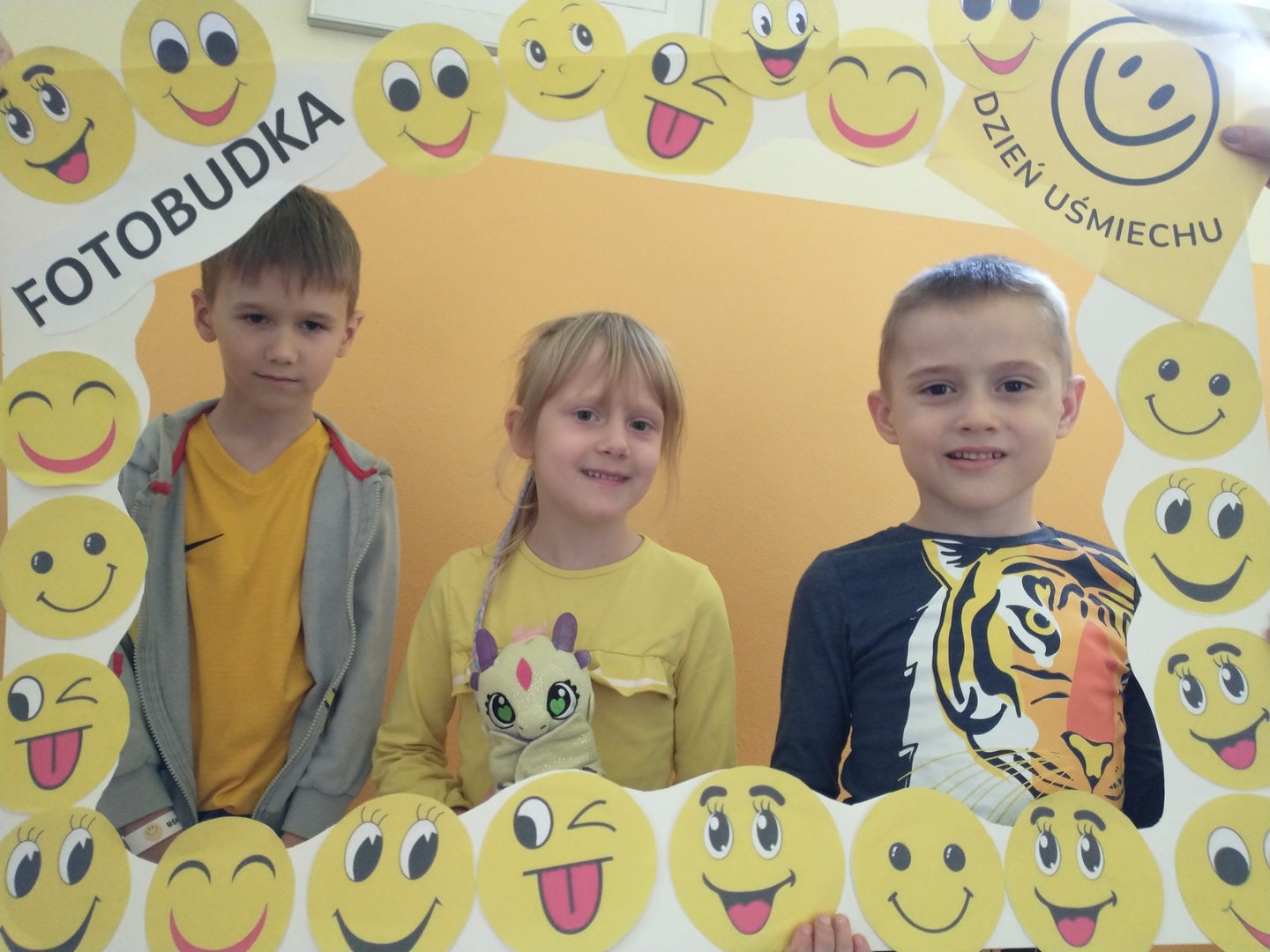 Światowy Dzień Uśmiechu to święto obchodzone corocznie w pierwszy piątek października, którego symbolem jest żółta uśmiechnięta buzia. Tego dnia dzieci podzieliły się tym, co sprawia, że się uśmiechają oraz sposobami, aby uśmiech pojawiał się na twarzach kolegów, koleżanek i ich najbliższych. Dzieci otrzymały opaski na rękę z uśmiechniętą buzią i w czteroosobowych grupach wyklejały bibułą uśmiechniętą twarz. Powstały interesujące prace, które można podziwiać na wystawie w przedszkolnej szatni. Nasza grupa wybrała się także do foto budki, aby zrobić wesołe zdjęcia. Przedszkolaki udały się także na plac zabaw.
