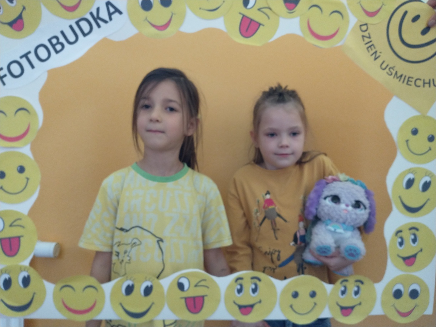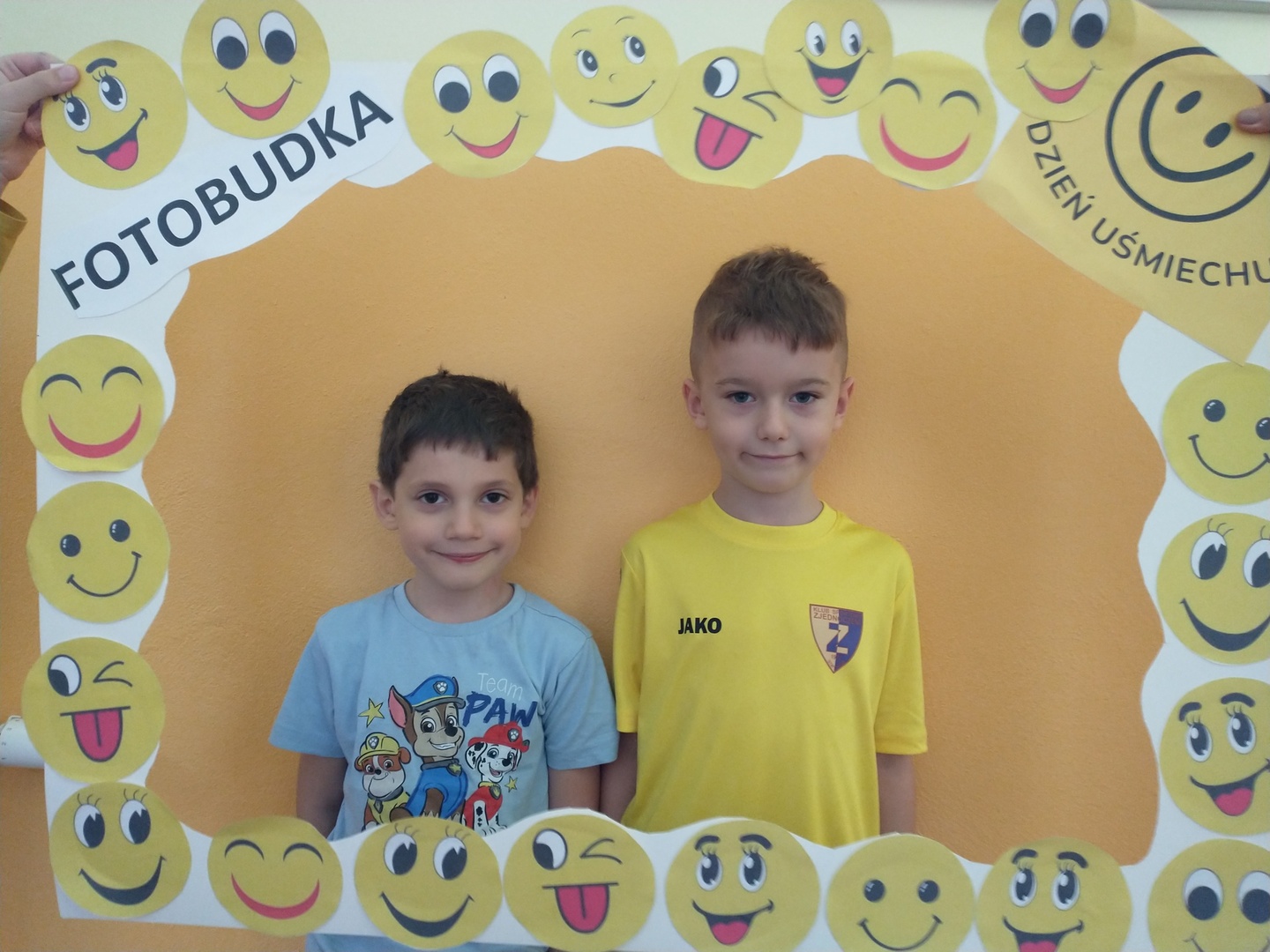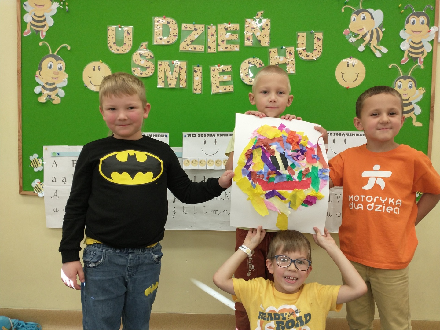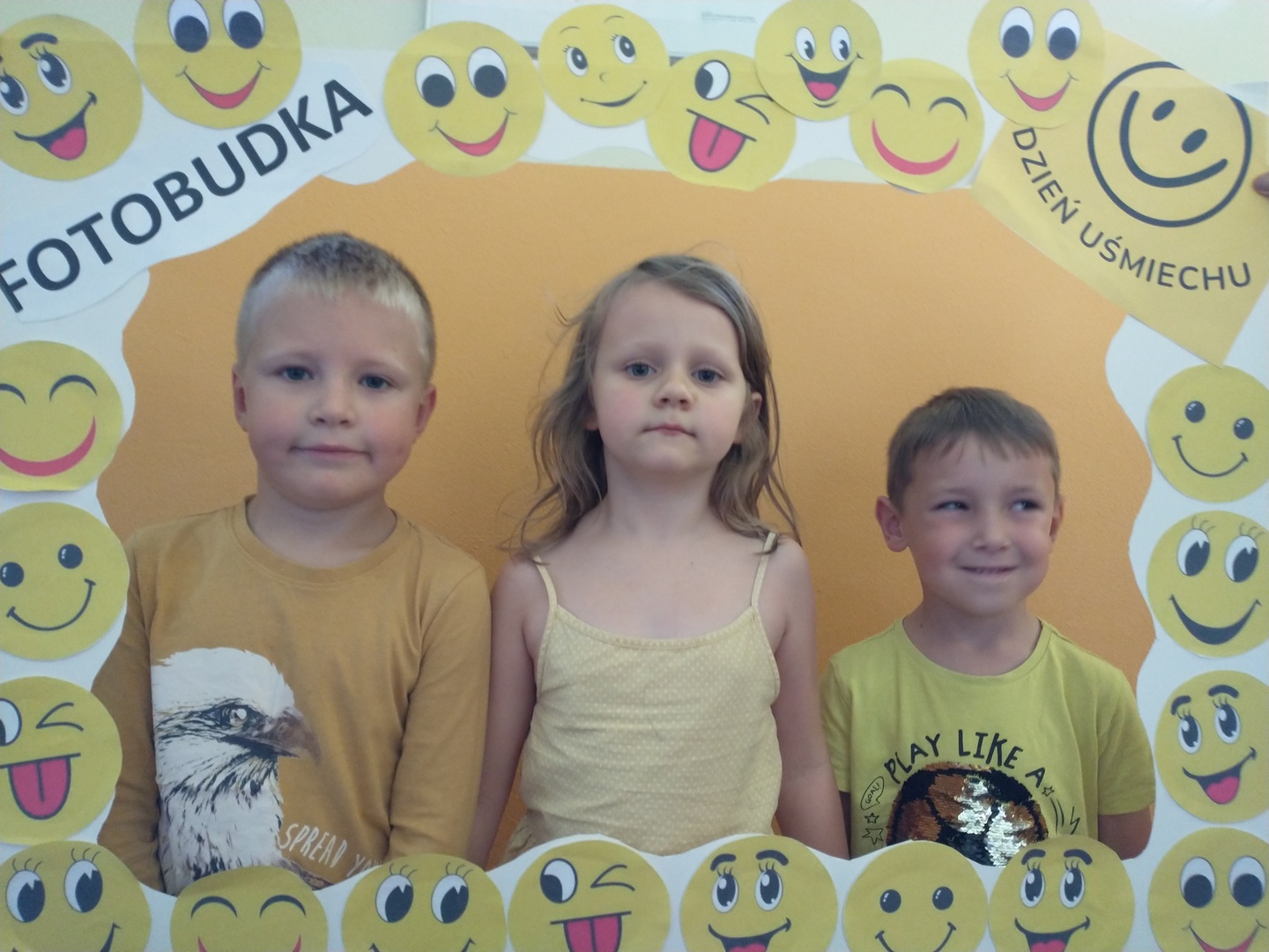 Światowy Dzień Uśmiechu to święto obchodzone corocznie w pierwszy piątek października, którego symbolem jest żółta uśmiechnięta buzia. Tego dnia dzieci podzieliły się tym, co sprawia, że się uśmiechają oraz sposobami, aby uśmiech pojawiał się na twarzach kolegów, koleżanek i ich najbliższych. Dzieci otrzymały opaski na rękę z uśmiechniętą buzią i w czteroosobowych grupach wyklejały bibułą uśmiechniętą twarz. Powstały interesujące prace, które można podziwiać na wystawie w przedszkolnej szatni. Nasza grupa wybrała się także do foto budki, aby zrobić wesołe zdjęcia. Przedszkolaki udały się także na plac zabaw.