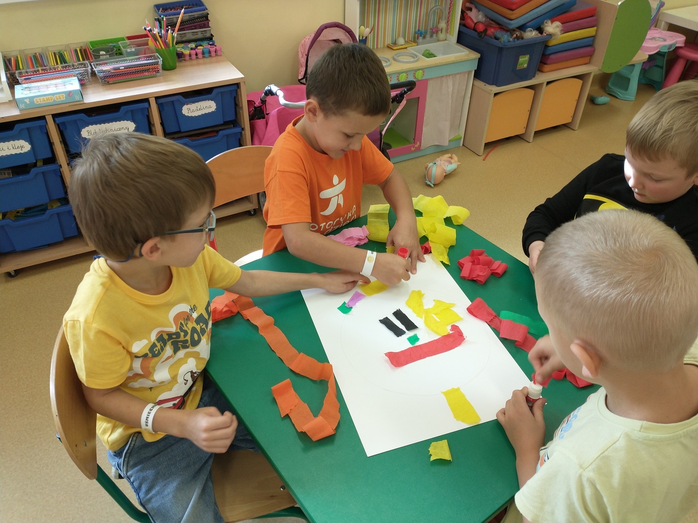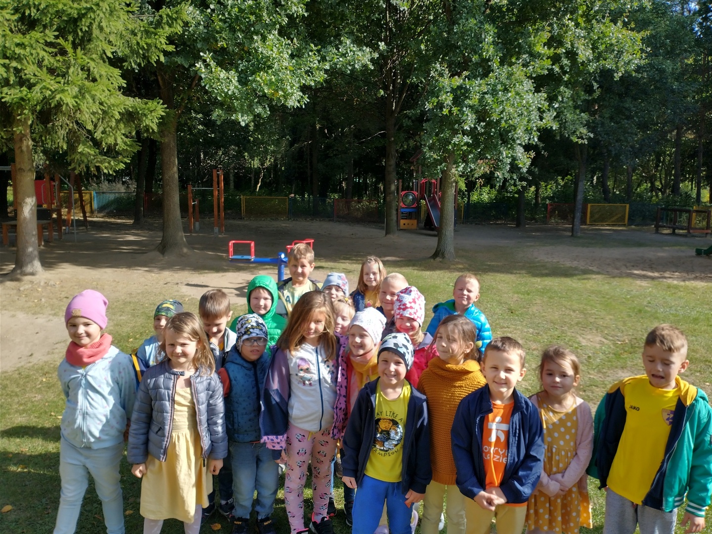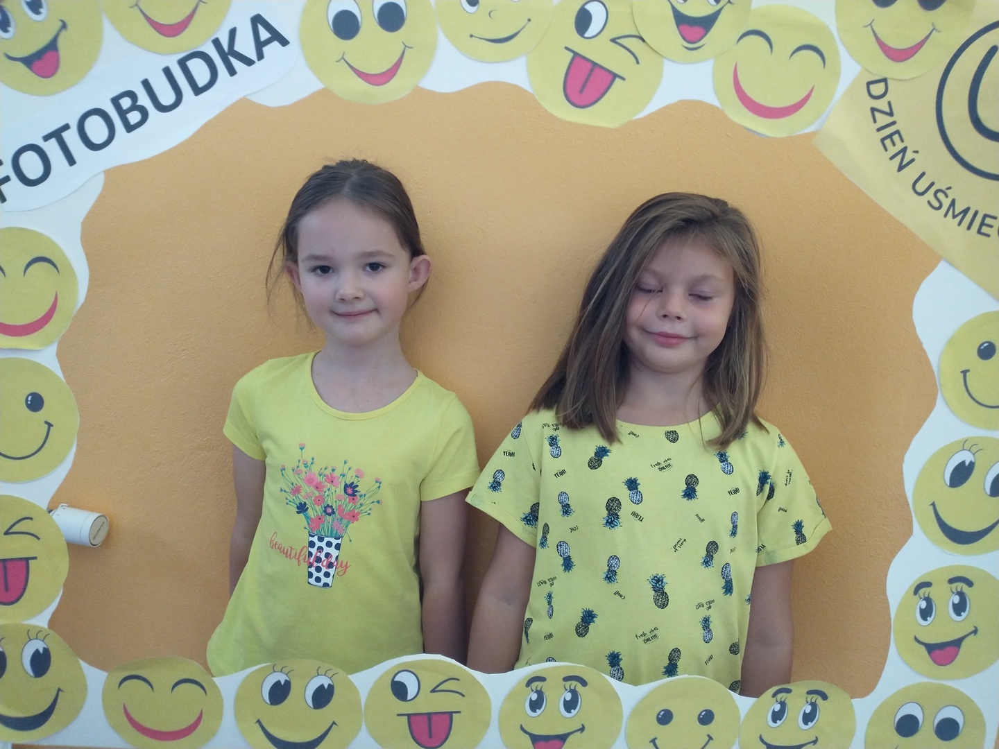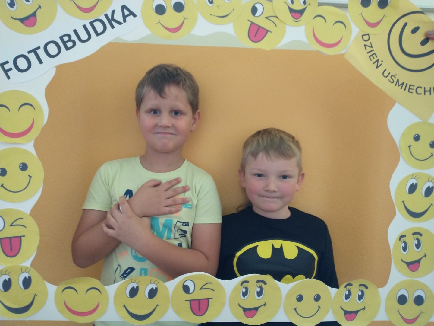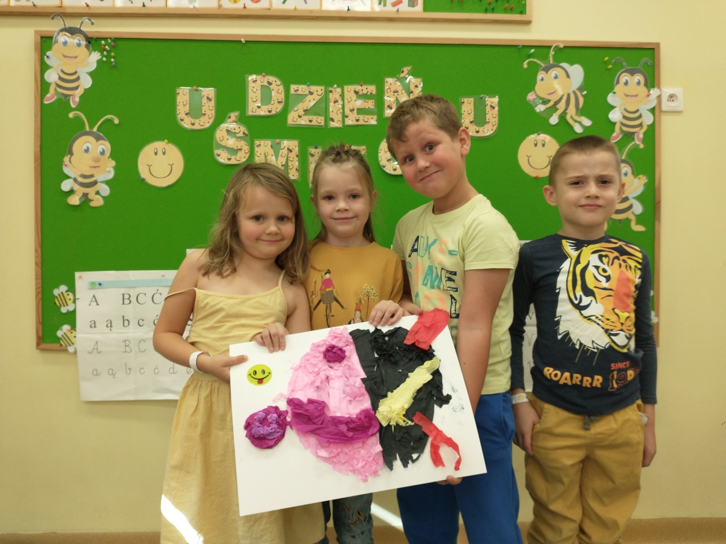 Światowy Dzień Uśmiechu to święto obchodzone corocznie w pierwszy piątek października, którego symbolem jest żółta uśmiechnięta buzia. Tego dnia dzieci podzieliły się tym, co sprawia, że się uśmiechają oraz sposobami, aby uśmiech pojawiał się na twarzach kolegów, koleżanek i ich najbliższych. Dzieci otrzymały opaski na rękę z uśmiechniętą buzią i w czteroosobowych grupach wyklejały bibułą uśmiechniętą twarz. Powstały interesujące prace, które można podziwiać na wystawie w przedszkolnej szatni. Nasza grupa wybrała się także do foto budki, aby zrobić wesołe zdjęcia. Przedszkolaki udały się także na plac zabaw.