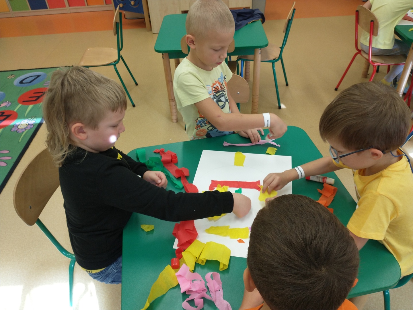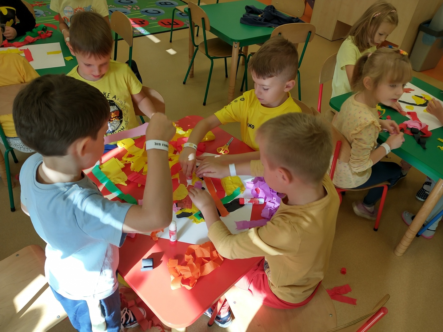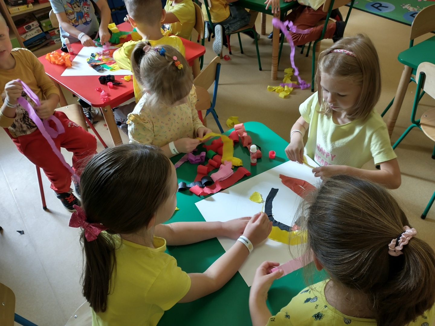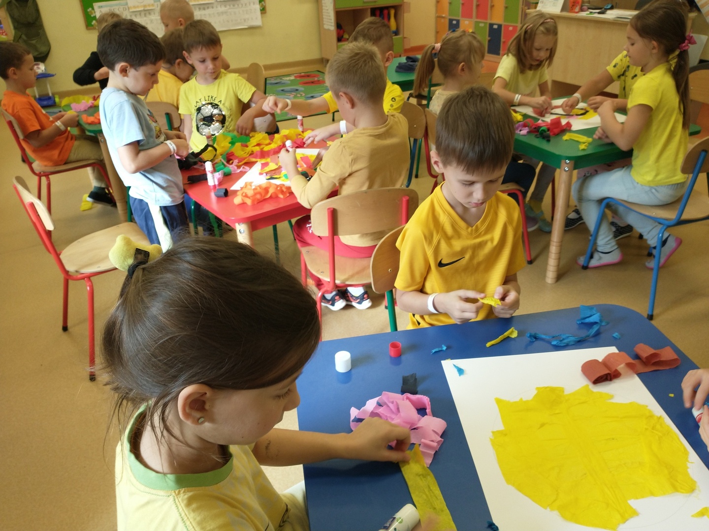Światowy Dzień Uśmiechu to święto obchodzone corocznie w pierwszy piątek października, którego symbolem jest żółta uśmiechnięta buzia. Tego dnia dzieci podzieliły się tym, co sprawia, że się uśmiechają oraz sposobami, aby uśmiech pojawiał się na twarzach kolegów, koleżanek i ich najbliższych. Dzieci otrzymały opaski na rękę z uśmiechniętą buzią i w czteroosobowych grupach wyklejały bibułą uśmiechniętą twarz. Powstały interesujące prace, które można podziwiać na wystawie w przedszkolnej szatni. Nasza grupa wybrała się także do foto budki, aby zrobić wesołe zdjęcia. Przedszkolaki udały się także na plac zabaw.