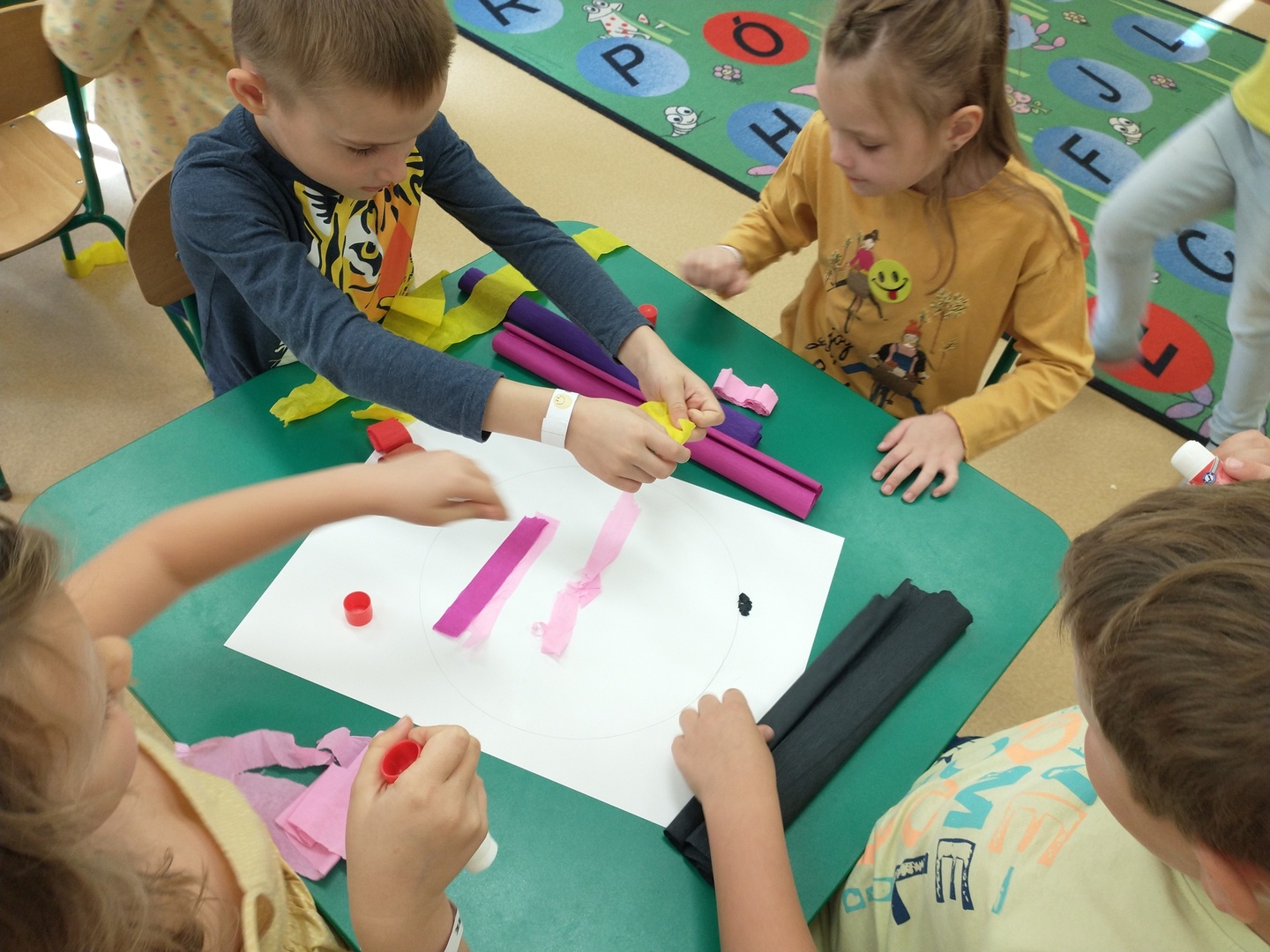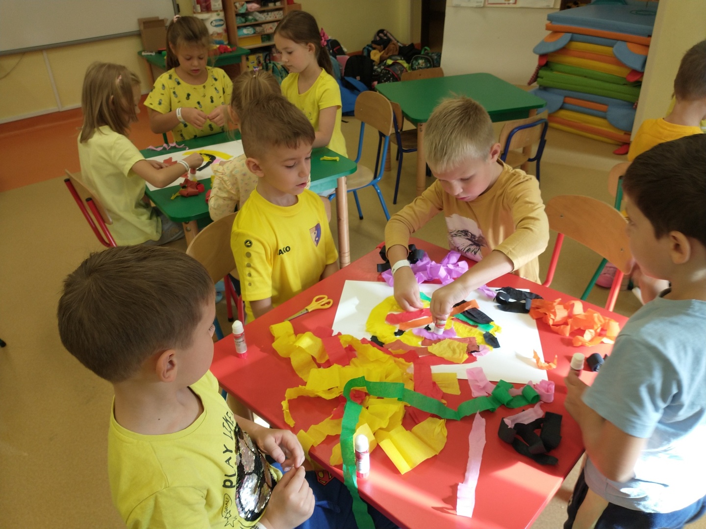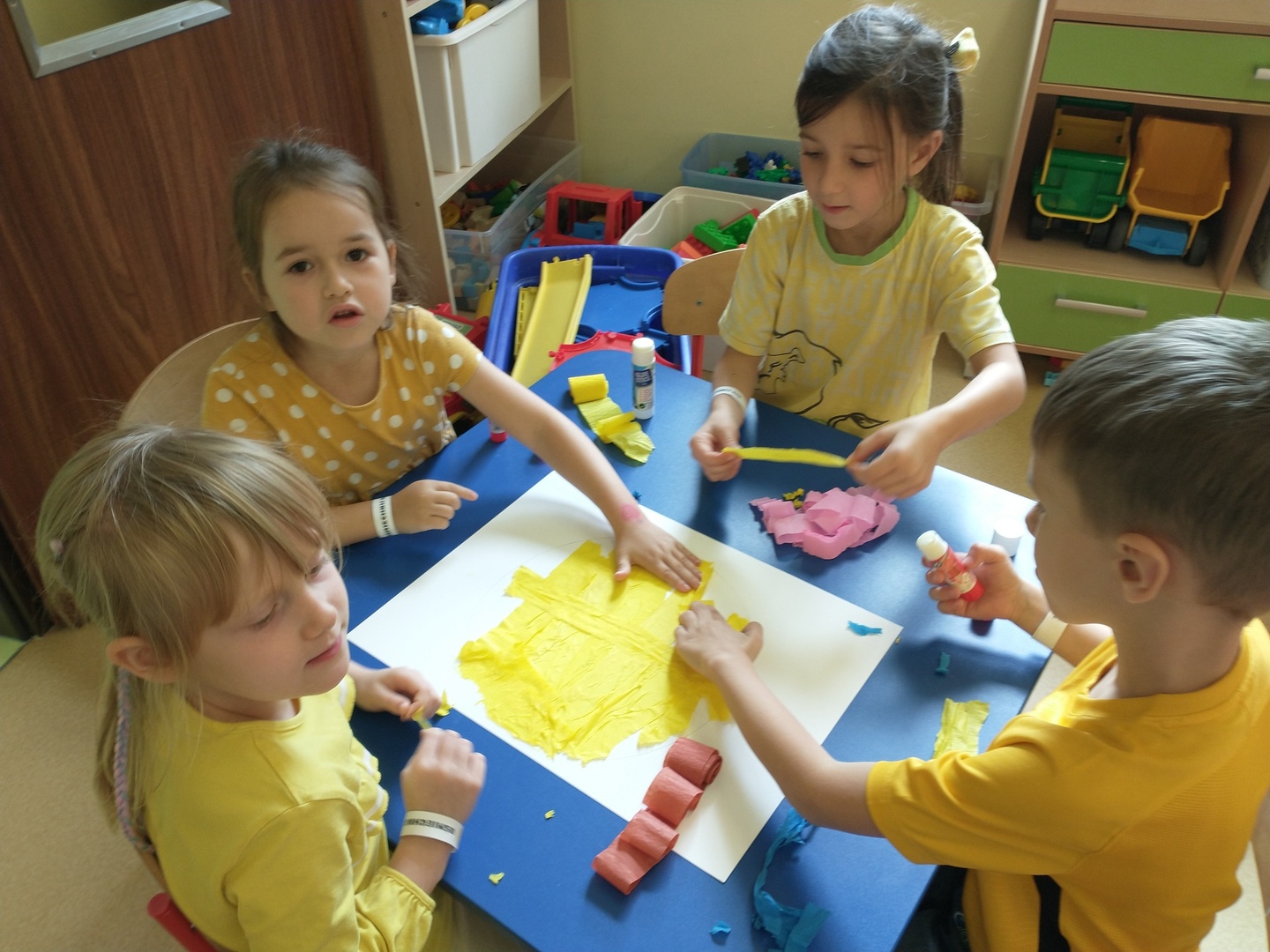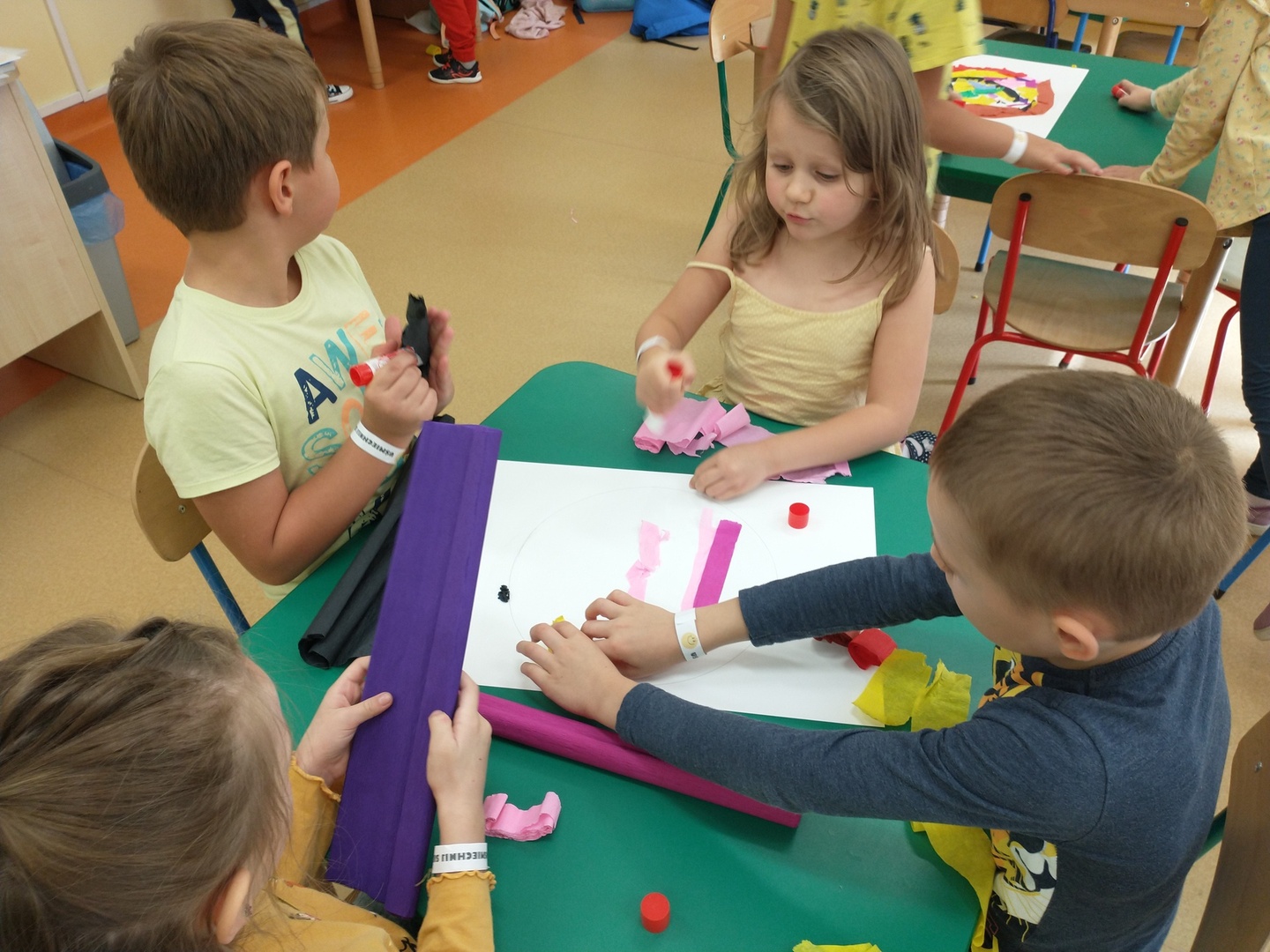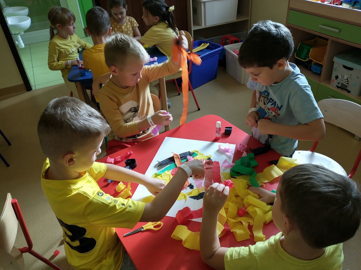 Światowy Dzień Uśmiechu to święto obchodzone corocznie w pierwszy piątek października, którego symbolem jest żółta uśmiechnięta buzia. Tego dnia dzieci podzieliły się tym, co sprawia, że się uśmiechają oraz sposobami, aby uśmiech pojawiał się na twarzach kolegów, koleżanek i ich najbliższych. Dzieci otrzymały opaski na rękę z uśmiechniętą buzią i w czteroosobowych grupach wyklejały bibułą uśmiechniętą twarz. Powstały interesujące prace, które można podziwiać na wystawie w przedszkolnej szatni. Nasza grupa wybrała się także do foto budki, aby zrobić wesołe zdjęcia. Przedszkolaki udały się także na plac zabaw.