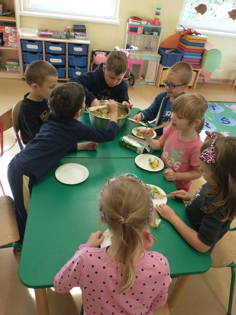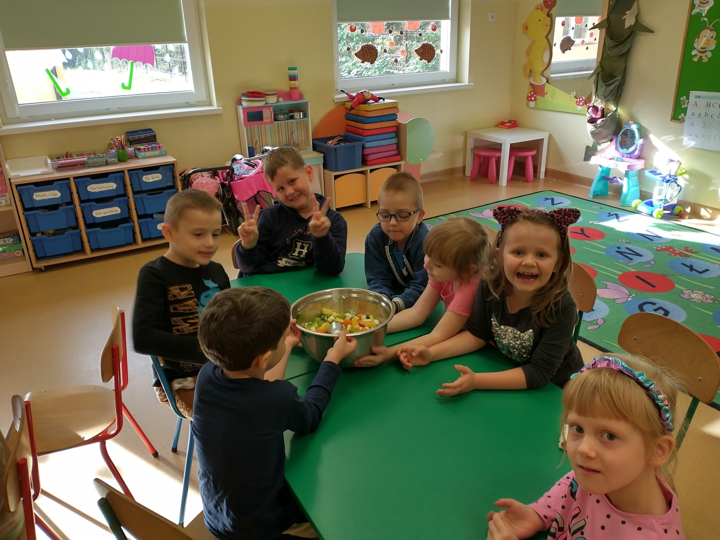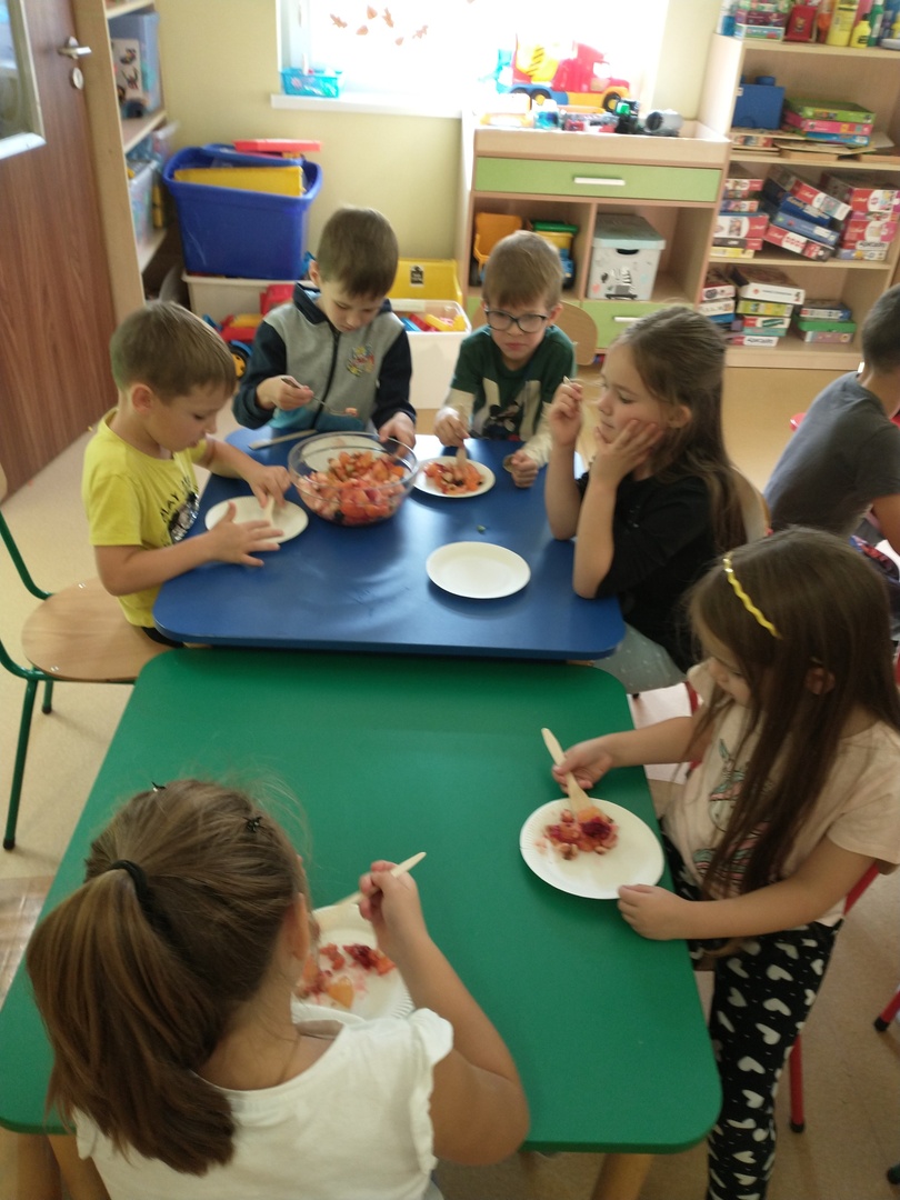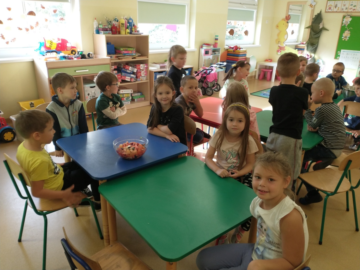 W środę, 11 października, dzieci z grupy ,,Pszczółki” przygotowały pyszne sałatki owocowe. Po rozmowie o zdrowym odżywianiu, przygotowaniu sali oraz umyciu rąk, przedszkolaki podzielone na trzy grupy przystąpiły do przyrządzania sałatek owocowych. Każda z potraw miała swój niepowtarzalny charakter i smak.