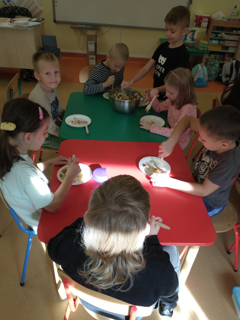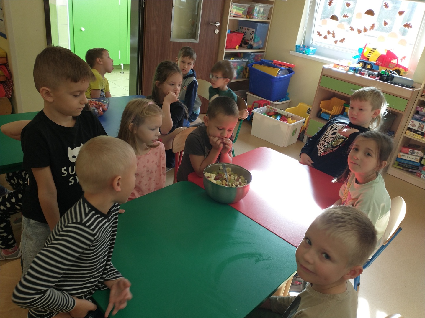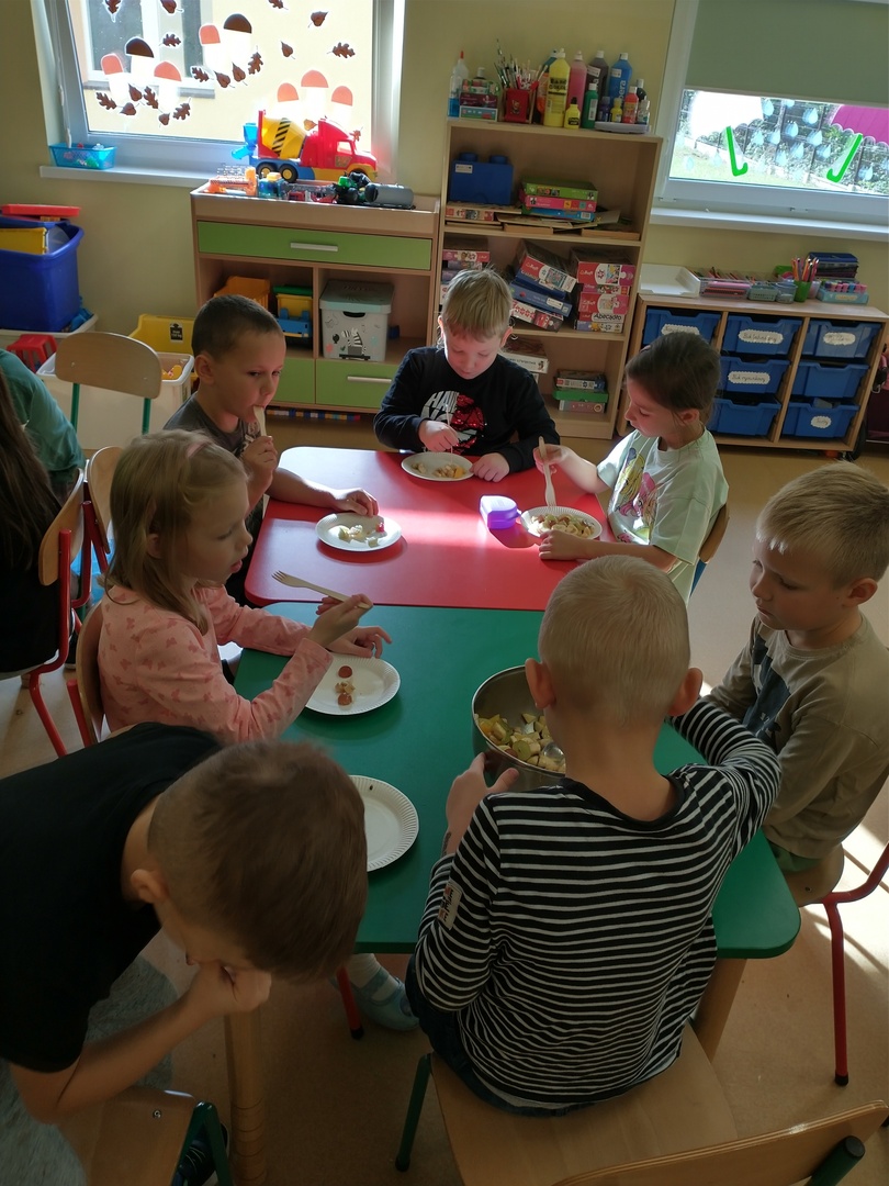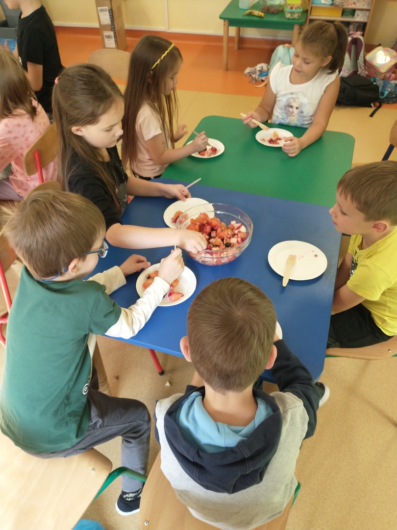W środę, 11 października, dzieci z grupy ,,Pszczółki” przygotowały pyszne sałatki owocowe. Po rozmowie o zdrowym odżywianiu, przygotowaniu sali oraz umyciu rąk, przedszkolaki podzielone na trzy grupy przystąpiły do przyrządzania sałatek owocowych. Każda z potraw miała swój niepowtarzalny charakter i smak.
