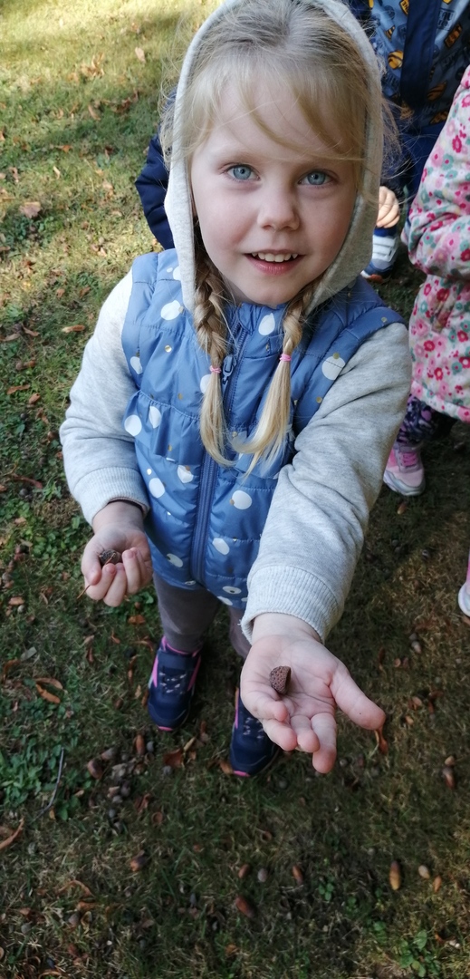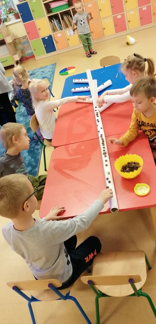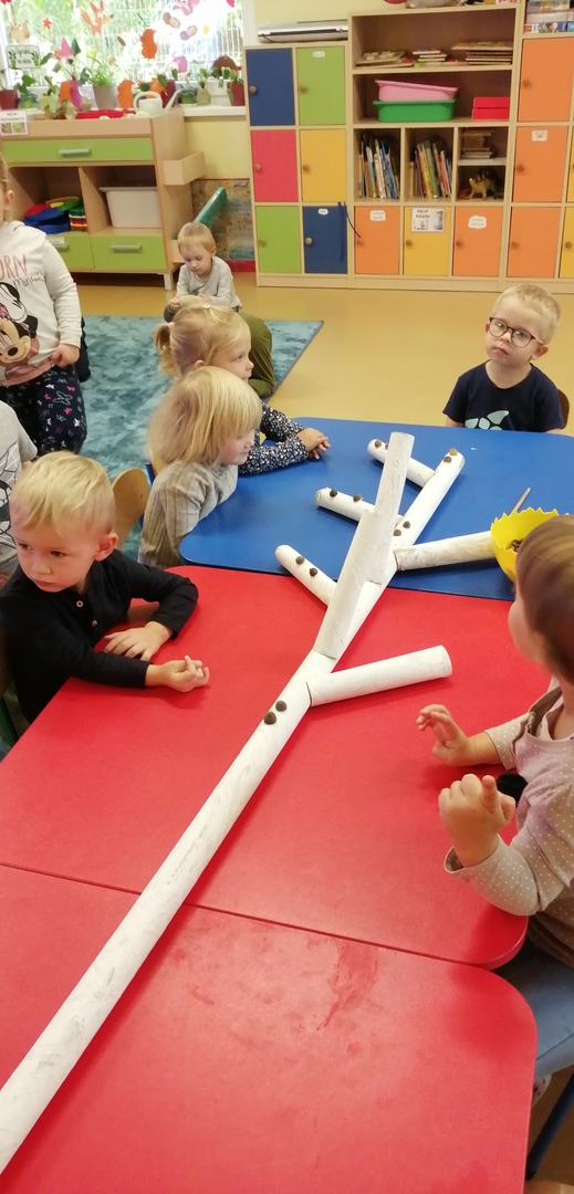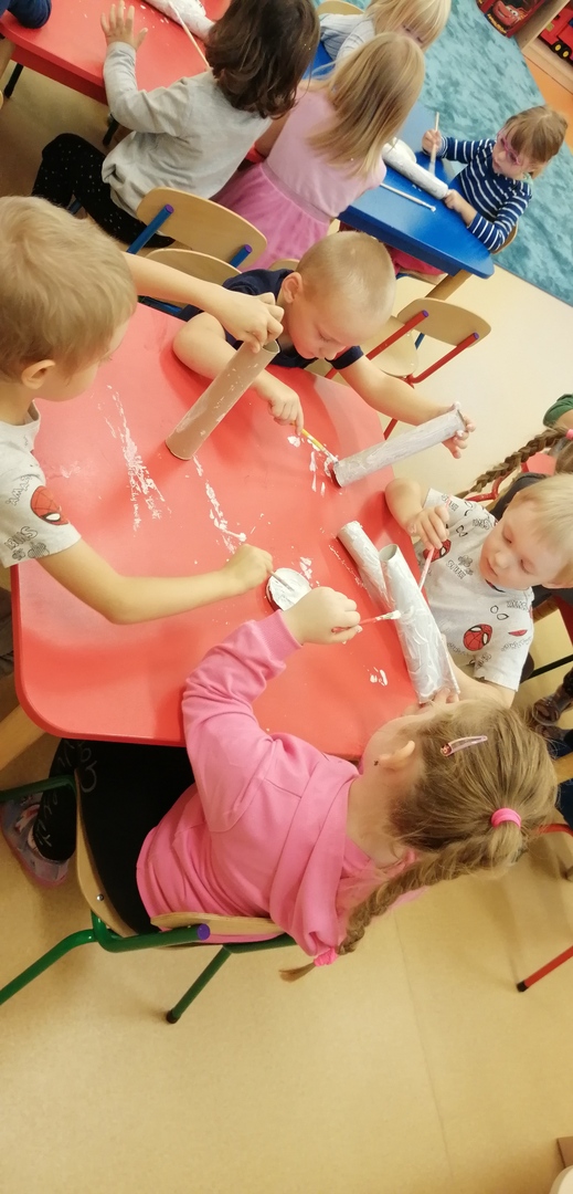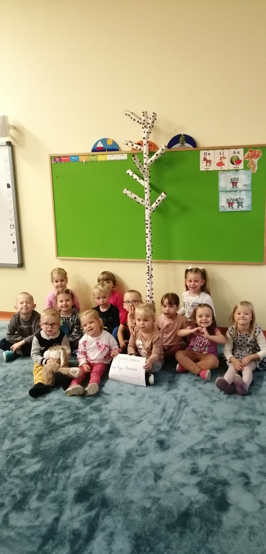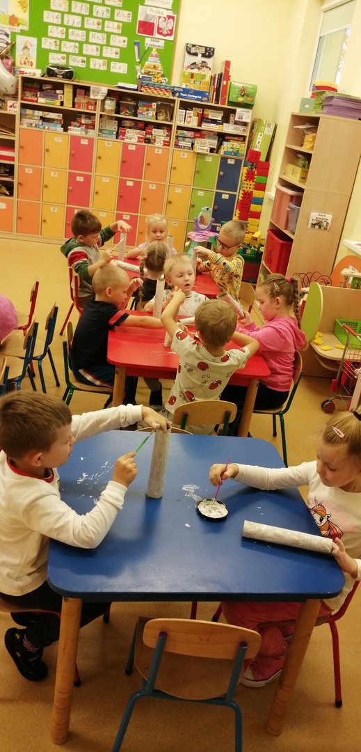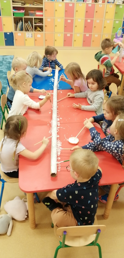Dzieci z młodszej grupy przedszkolnej w ramach projektu edukacyjnego "Zabawa sztuką" wykonały prace polegające na wykonaniu instalacji inspirowanej pracami projektantki Yayoi Kusama, która stworzyła m.in. drzewo pełne kropek, pumpkin czy butterfly. Przedszkolaki, inspirując się pracami artystki, stworzyły drzewo. Wykonały je, malując rolki po ręcznikach papierowych na biało, a następnie przy pomocy nauczyciela skleiły je, formując pień i gałęzie oraz przykleiły ,,kapelusze" od żołędzi, które wcześniej zebrały na spacerze.