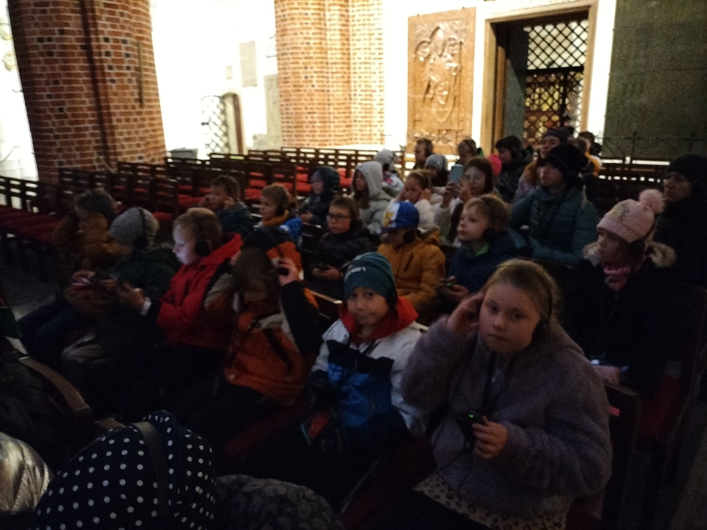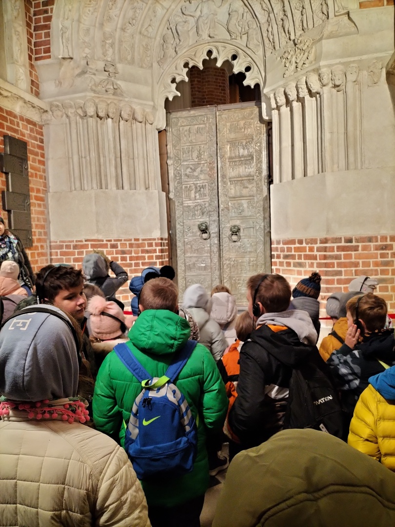 Pierwszym punktem wycieczki było Gniezno. Nowością dla uczniów było wykorzystaniem systemu słuchawkowego. Zwiedzanie rozpoczęliśmy od poznania historii Mieszka I oraz jego syna Bolesława Chrobrego, obejrzenia Katedry Gnieźnieńskiej, z ciekawymi organami i 14 kaplicami. Świątynia ta była miejscem koronacji pierwszych królów polskich. Następnie udaliśmy się do drzwi gnieźnieńskich, na których były przedstawione najważniejsze sceny z życia św. Wojciecha. Pani przewodnik bardzo ciekawie opowiadała historię życia tego misjonarza.