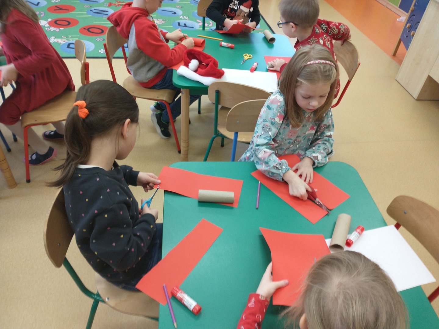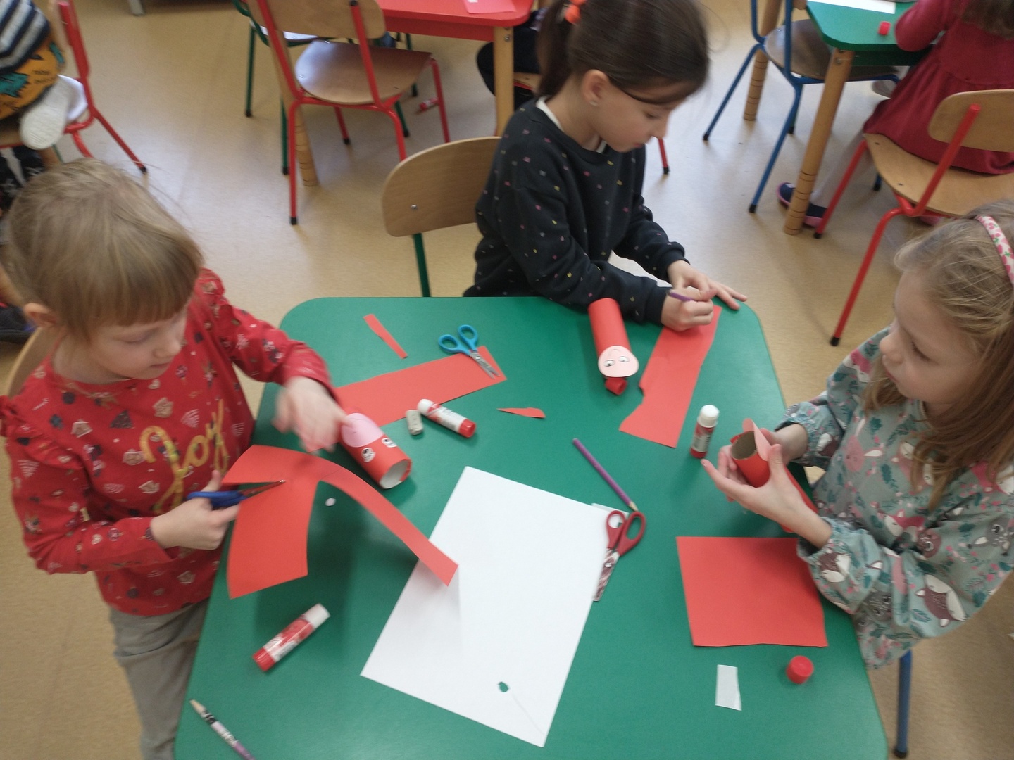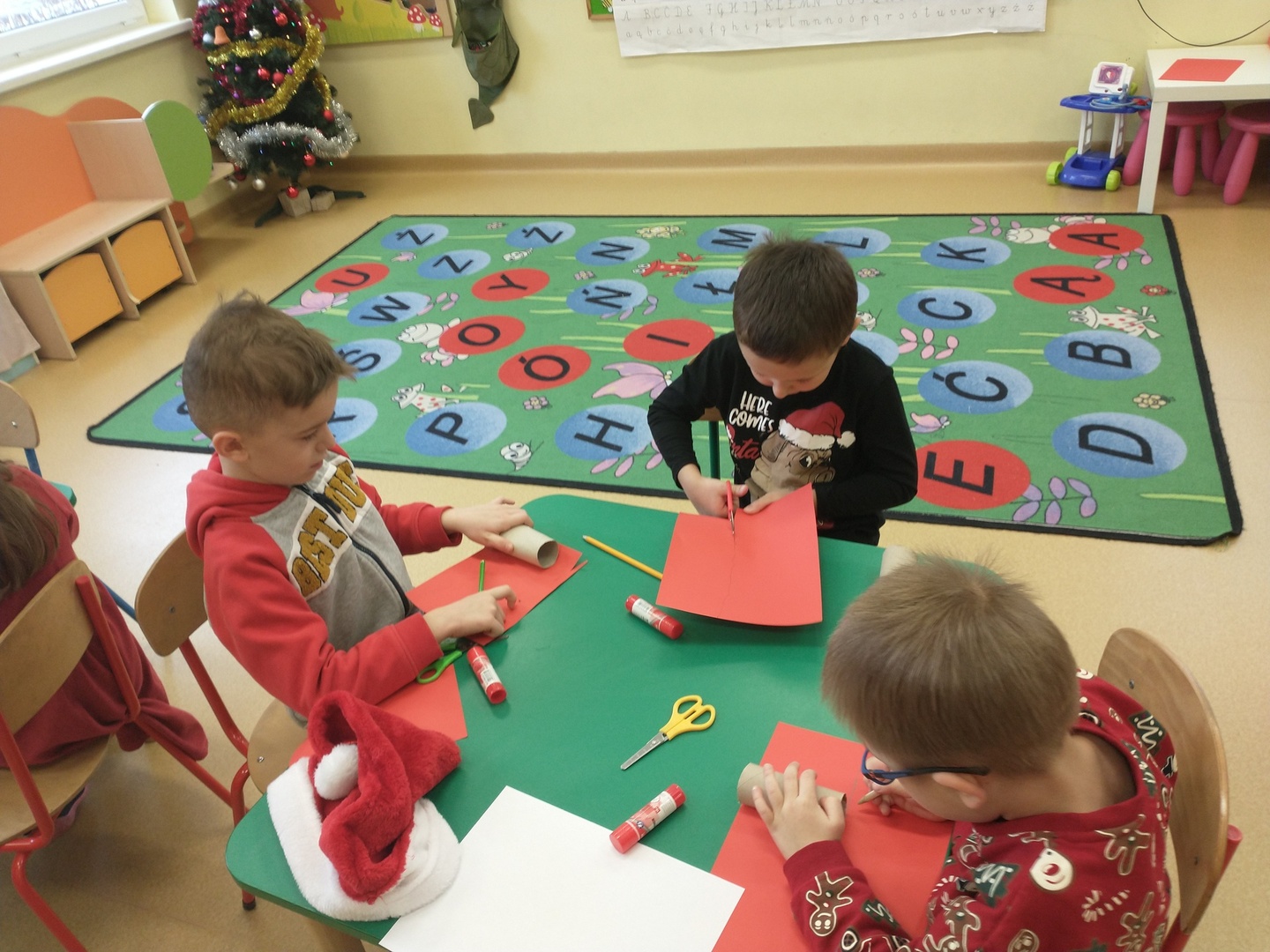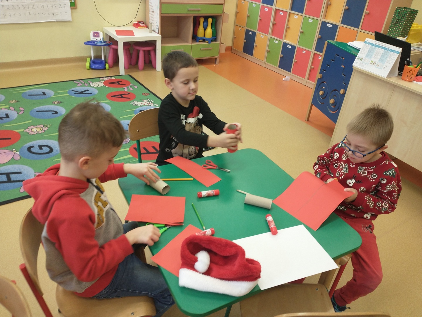 Następnie dzieci narysowały swoje świąteczne marzenia, a powstałe prace zostały zaprezentowane na wystawie. W końcu grupę ,,Pszczółki” odwiedził długo wyczekiwany gość. Po upewnieniu się , że dzieci były grzeczne, Mikołaj rozdał im prezenty. Po jego wizycie dzieci wykonały śliczne Mikołaje z papieru.
