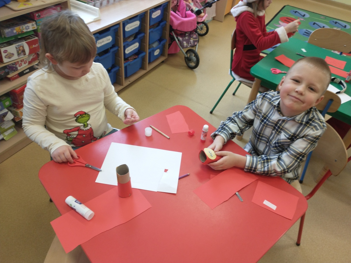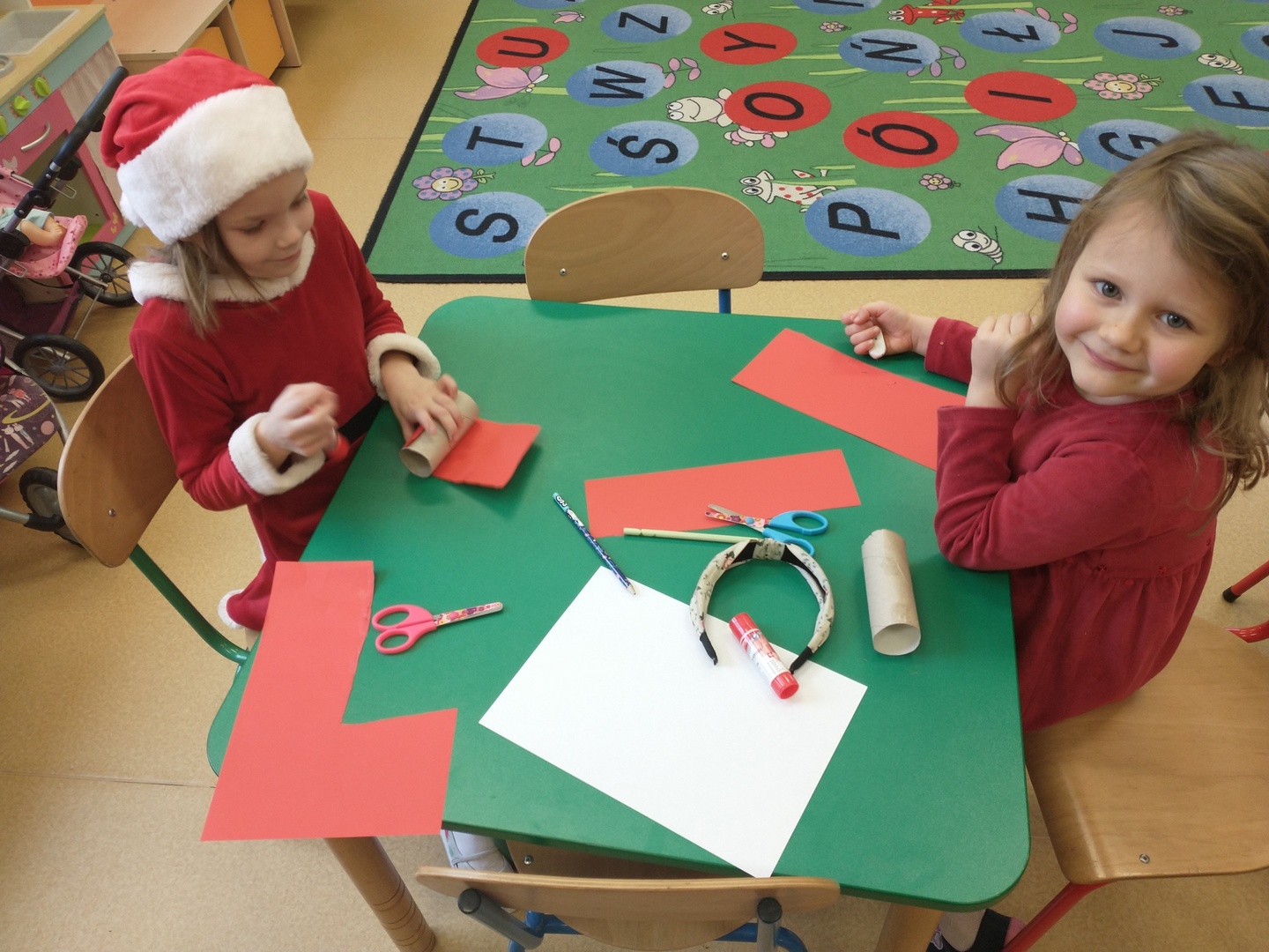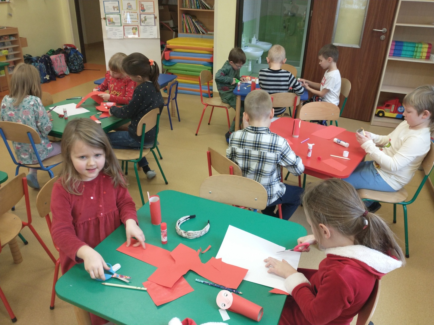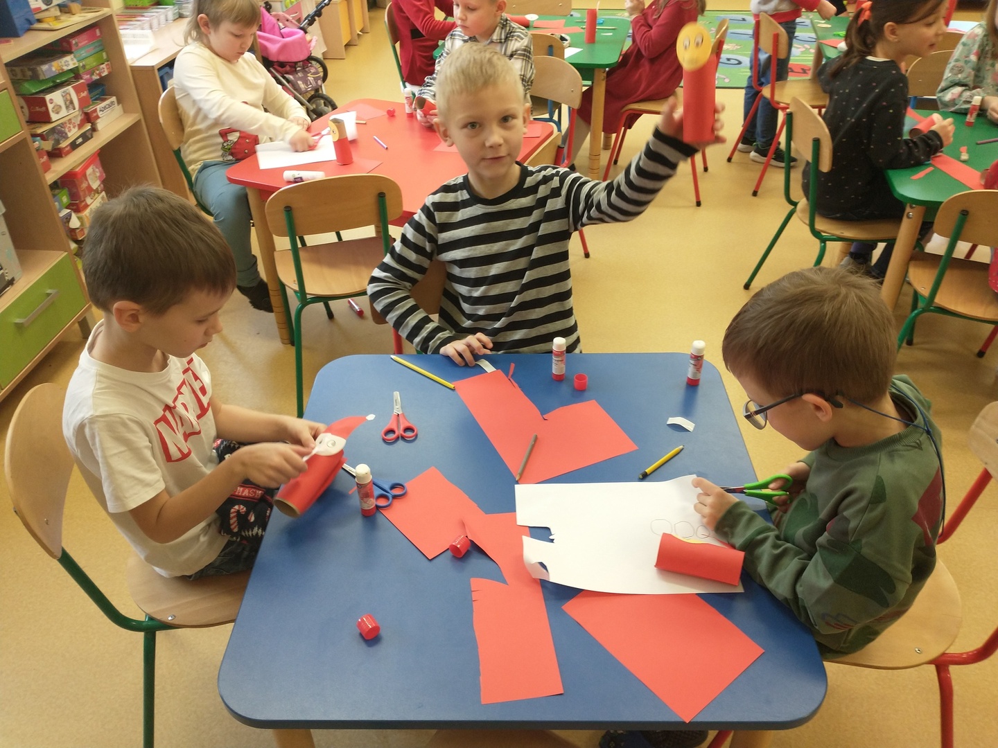 Następnie dzieci narysowały swoje świąteczne marzenia, a powstałe prace zostały zaprezentowane na wystawie. W końcu grupę ,,Pszczółki” odwiedził długo wyczekiwany gość. Po upewnieniu się , że dzieci były grzeczne, Mikołaj rozdał im prezenty. Po jego wizycie dzieci wykonały śliczne Mikołaje z papieru.
