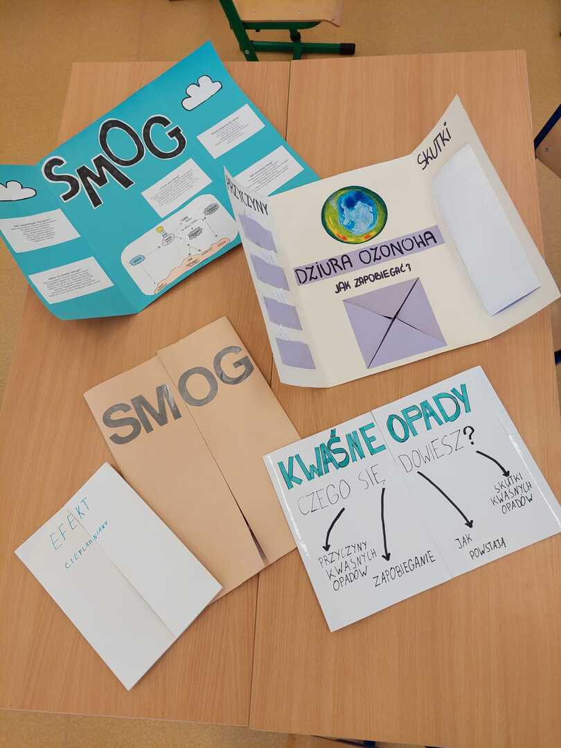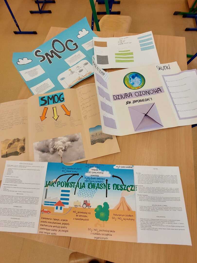 Uczniowie klasy VIII podczas zajęć chemii realizowali projekt ,,Zanieczyszczenia powietrza", którego głównym celem było kształtowanie świadomości ekologicznej w zakresie wpływu zanieczyszczeń powietrza na życie i zdrowie człowieka, funkcjonowanie roślin i zwierząt, a także ustalenie sposobów ochrony powietrza. Zadanie uczniów polegało na wyszukaniu i opracowaniu informacji w formie lapbooka. Zebrane materiały zostały przedstawione w trzech kategoriach: przyczyny, skutki, zapobieganie.