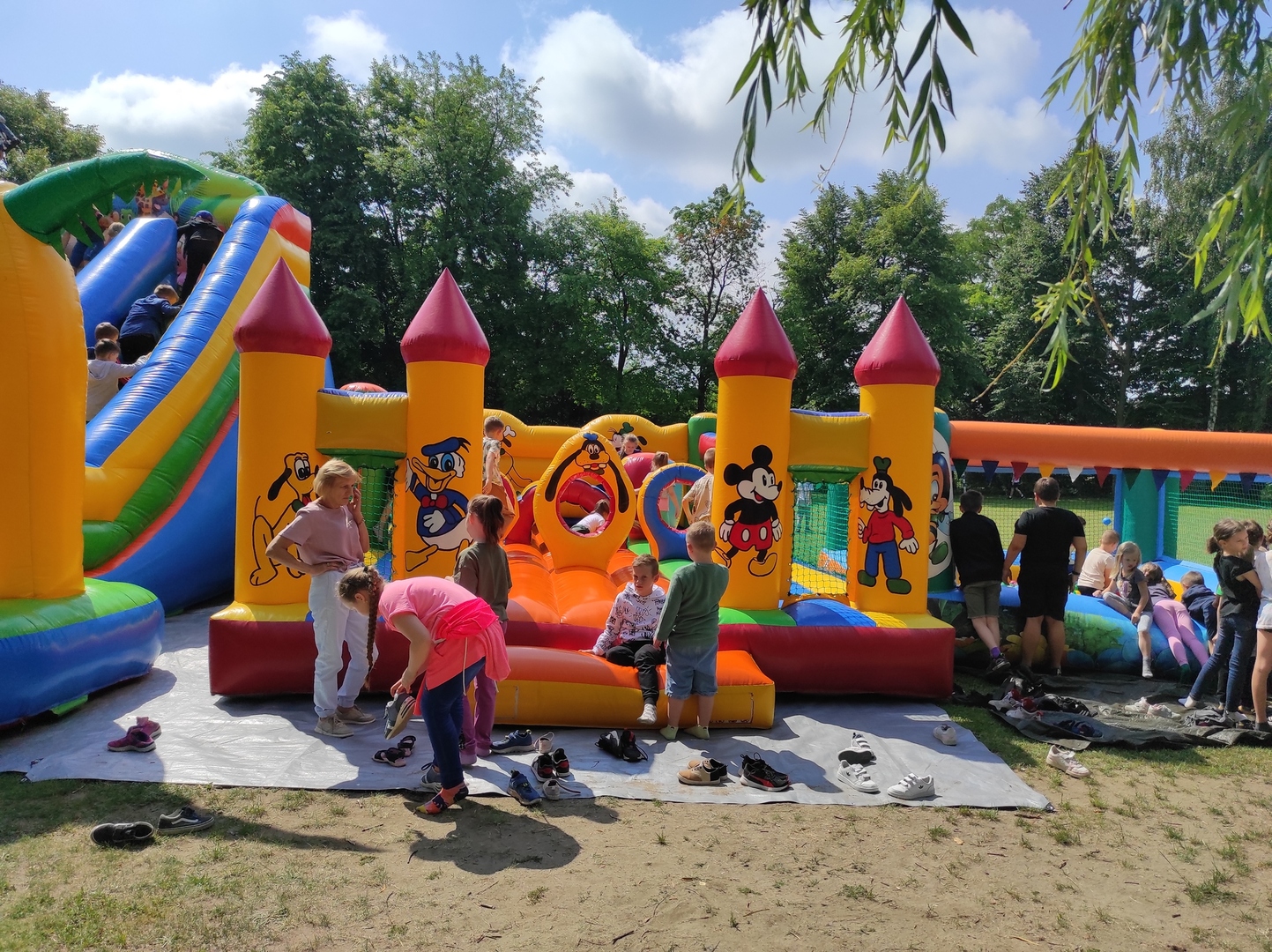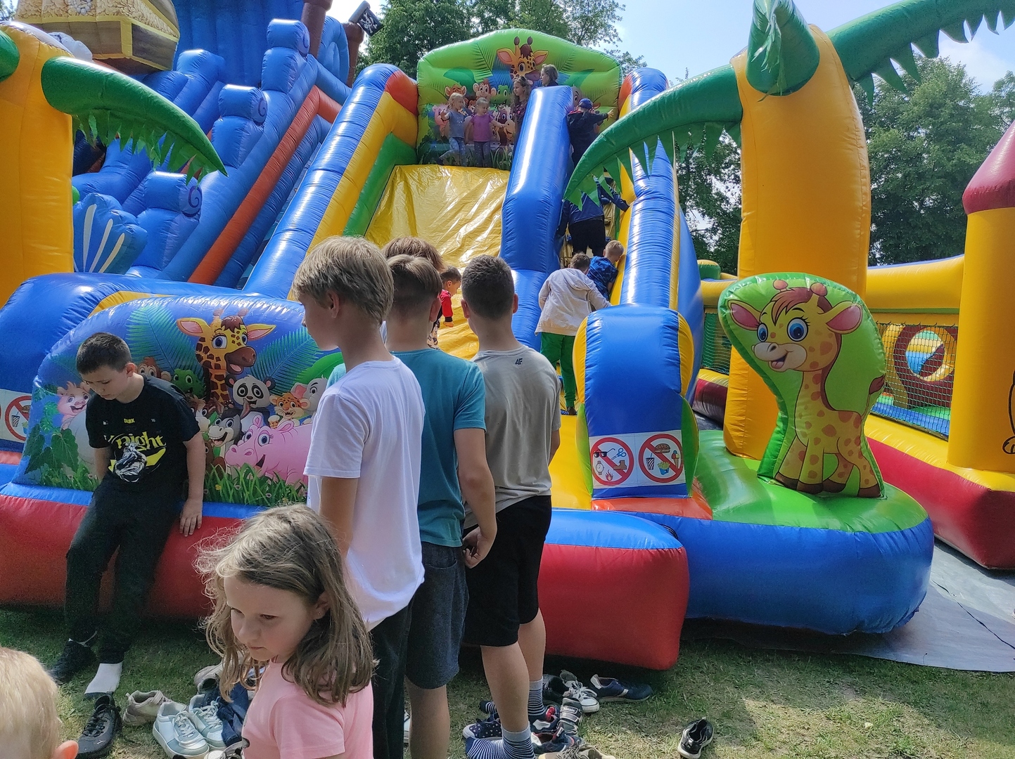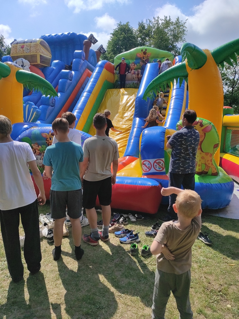3 czerwca obchodziliśmy w szkole święto wszystkich dzieci. W tym dniu wszyscy mogli poczuć się jak najmłodsi, a to za sprawą przygotowanych atrakcji. Uczniowie spędzali czas na boisku szkolnym, bawiąc się na dmuchanych zjeżdżalniach oraz uczestnicząc w różnorodnych grach sportowych. Na zmęczone, ale zadowolone dzieci czekały porcje aromatycznego pop cornu, słodycze oraz odpoczynek na świeżym powietrzu. Był to także czas na wspólne spędzanie czasu, swobodne rozmowy i relaks.