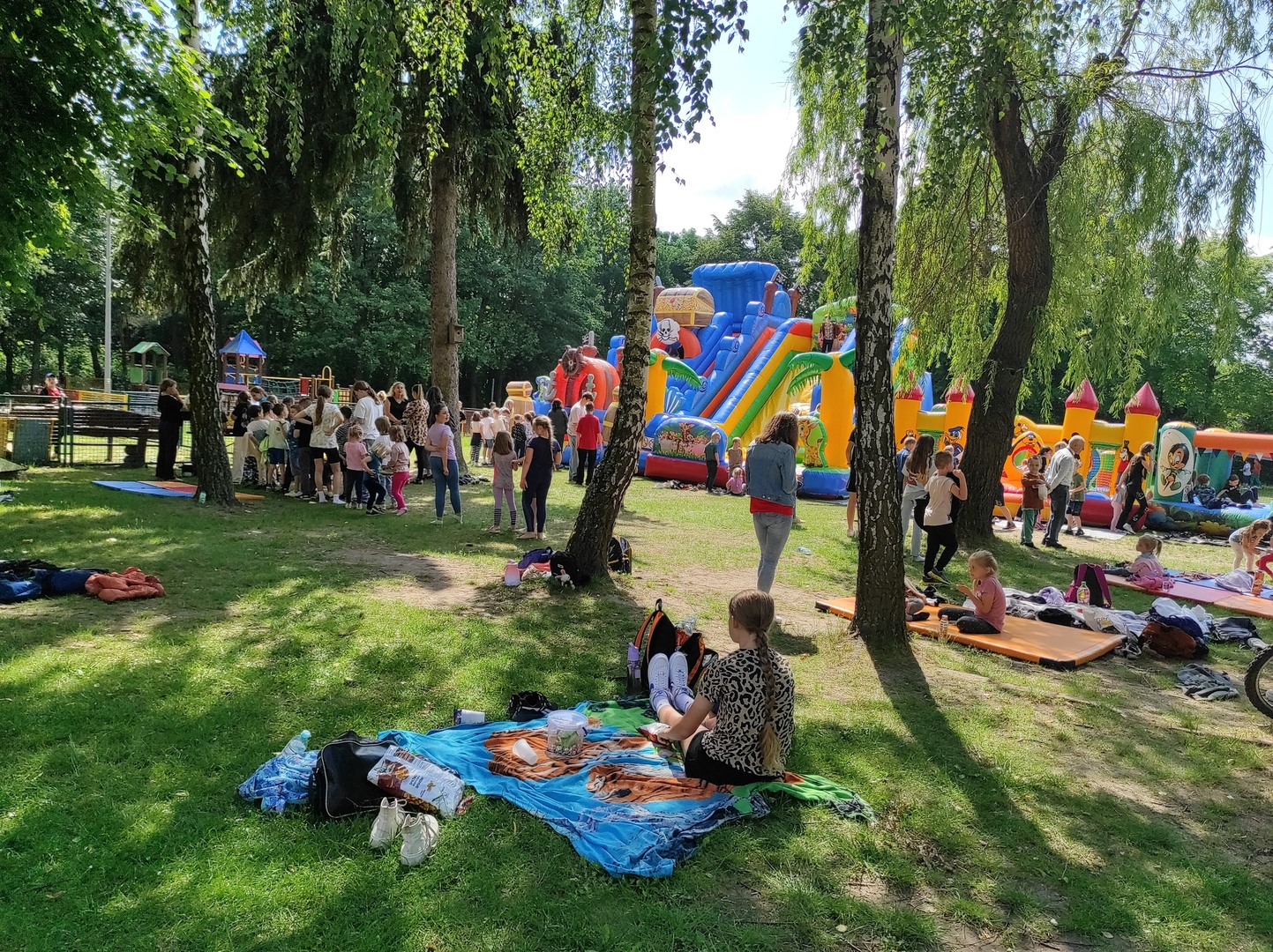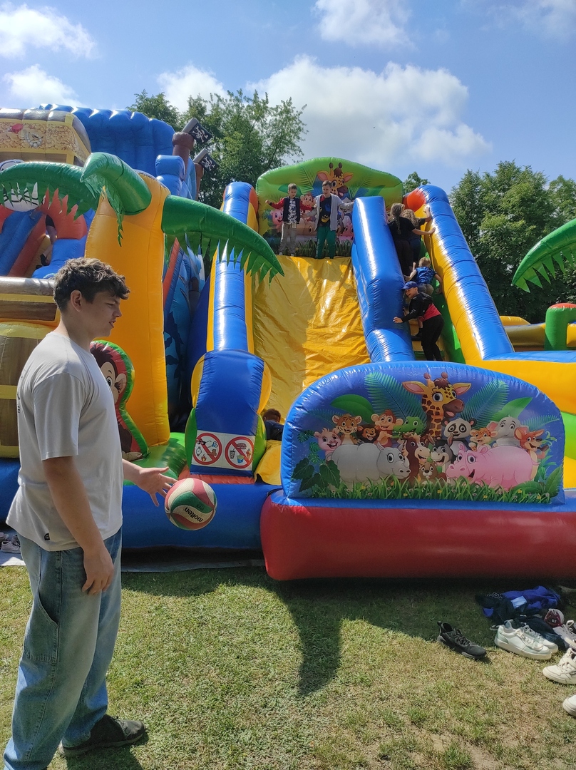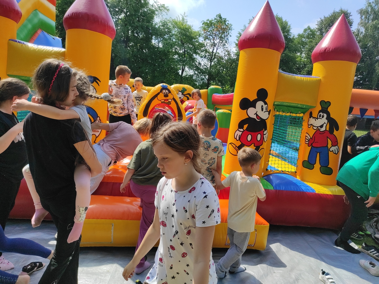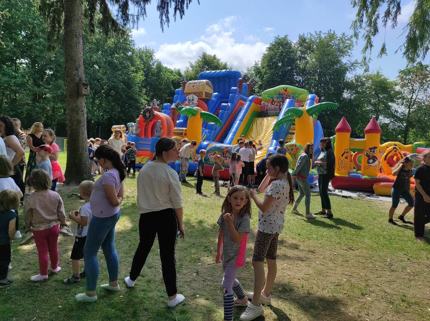 3 czerwca obchodziliśmy w szkole święto wszystkich dzieci. W tym dniu wszyscy mogli poczuć się jak najmłodsi, a to za sprawą przygotowanych atrakcji. Uczniowie spędzali czas na boisku szkolnym, bawiąc się na dmuchanych zjeżdżalniach oraz uczestnicząc w różnorodnych grach sportowych. Na zmęczone, ale zadowolone dzieci czekały porcje aromatycznego pop cornu, słodycze oraz odpoczynek na świeżym powietrzu. Był to także czas na wspólne spędzanie czasu, swobodne rozmowy i relaks.