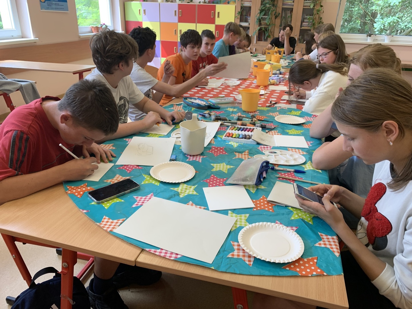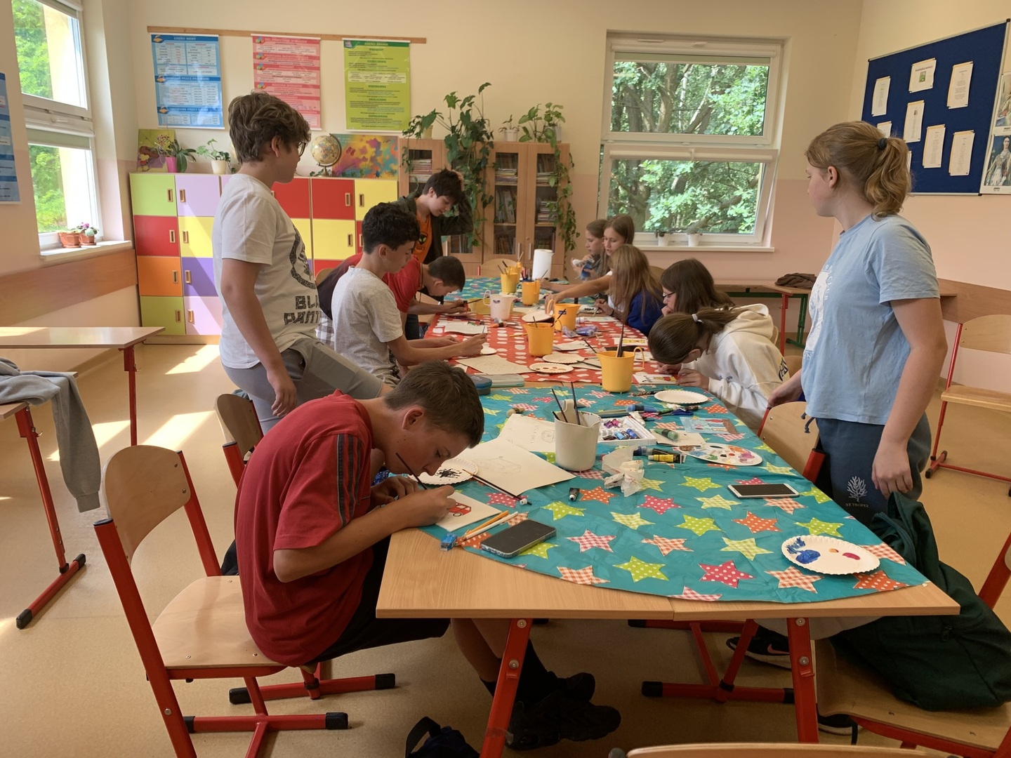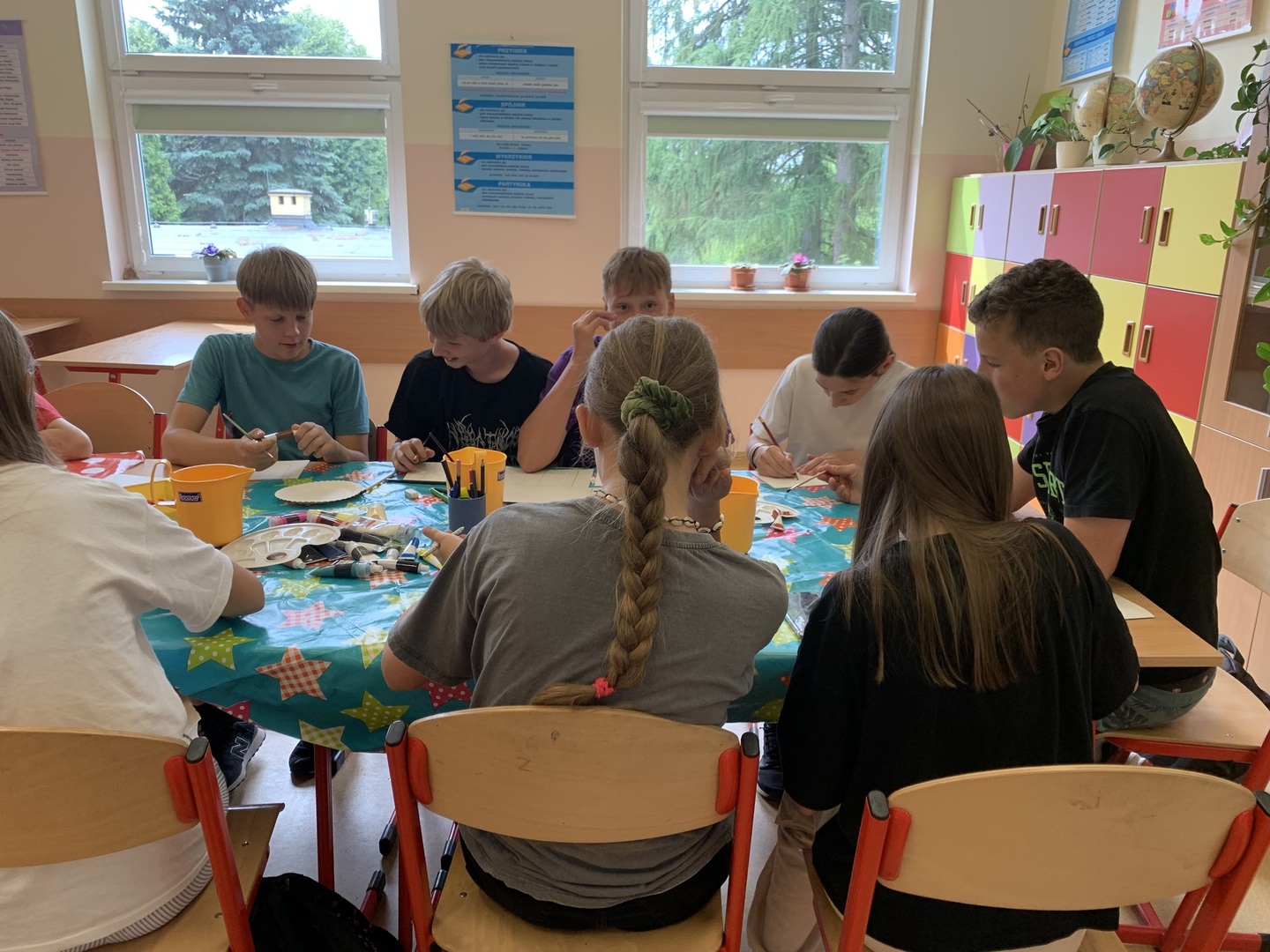 14 czerwca uczniowie klasy szóstej uczestniczyli w warsztatach plastycznych prowadzonych przez Panią Roksanę Habigier. Zadaniem uczniów było stworzenie obrazów na płótnie, które miały prezentować zainteresowania uczniów. Dzieci wykazały się niezwykłą inwencją plastyczną, pomysłowością i kreatywnością. Po dwóch godzinach pracy powstał wspólny obraz pt. ,,Co lubimy”, który stanie się ozdobą sali lekcyjnej i pamiątką wspólnej pracy.
