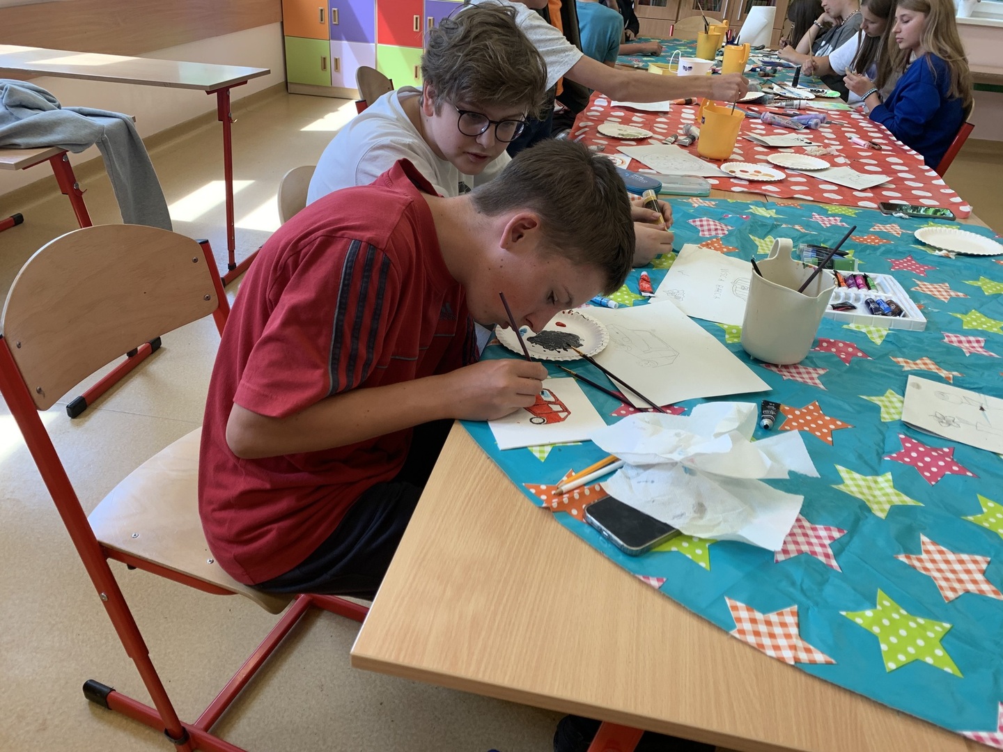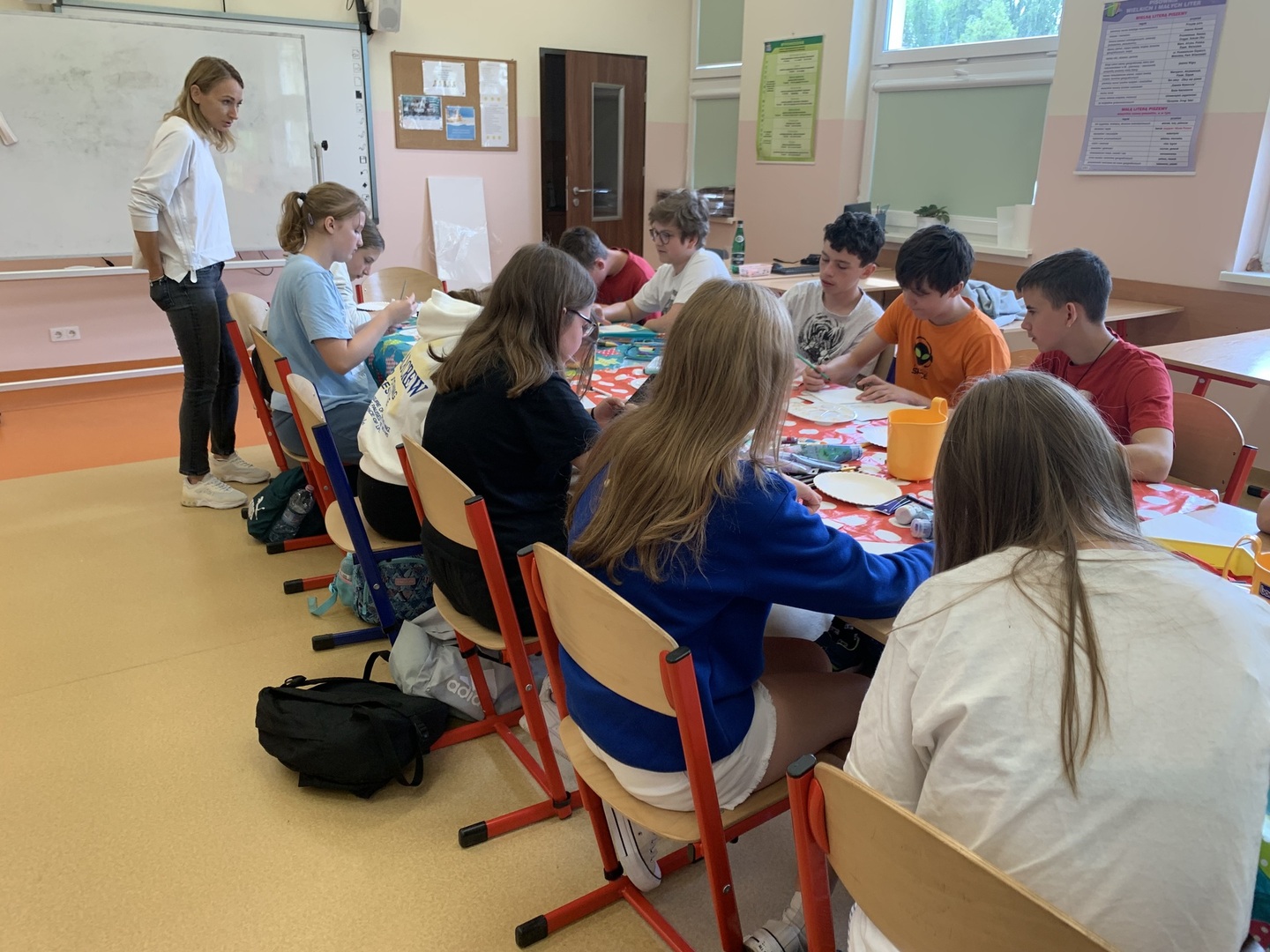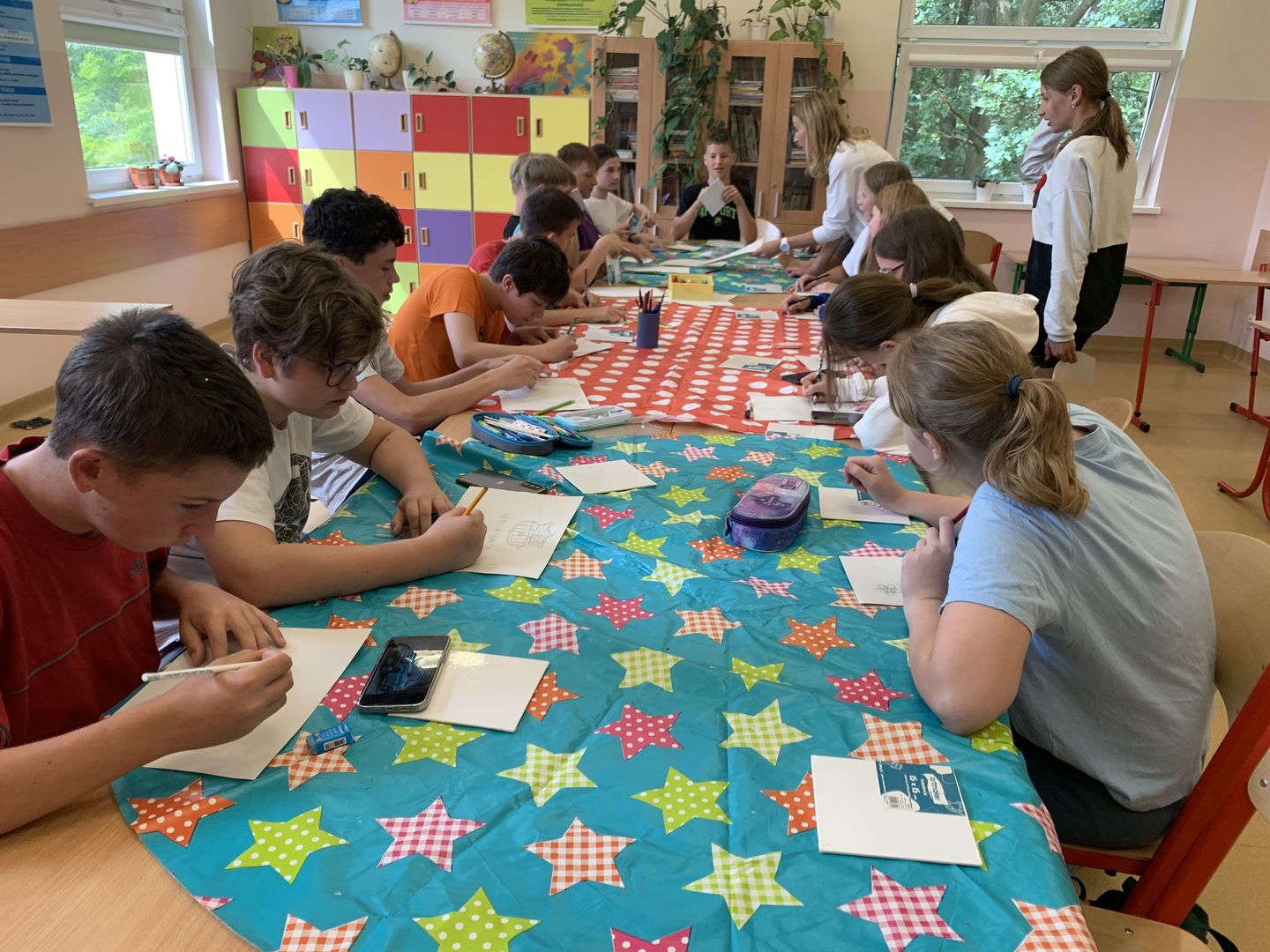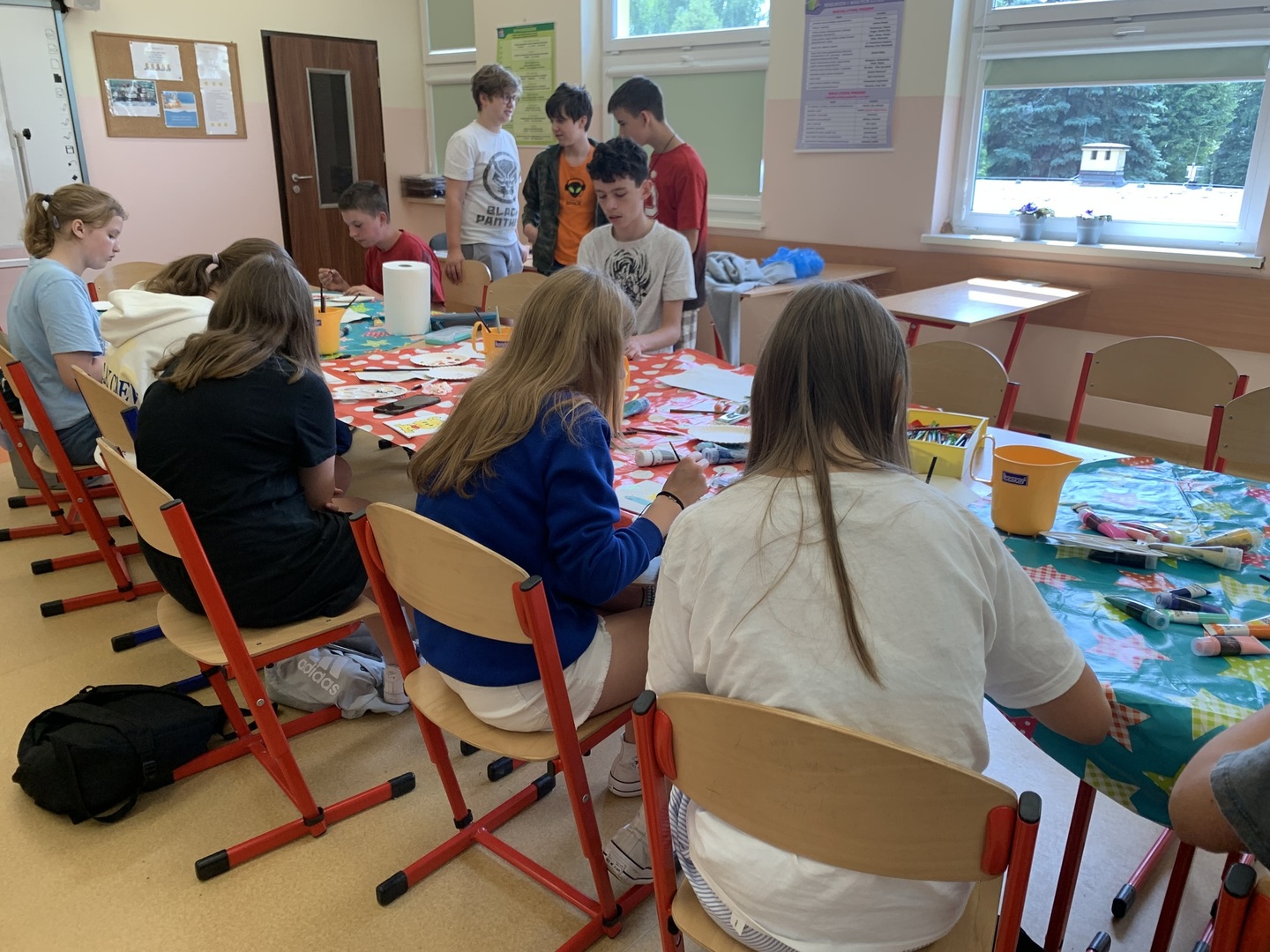 14 czerwca uczniowie klasy szóstej uczestniczyli w warsztatach plastycznych prowadzonych przez Panią Roksanę Habigier. Zadaniem uczniów było stworzenie obrazów na płótnie, które miały prezentować zainteresowania uczniów. Dzieci wykazały się niezwykłą inwencją plastyczną, pomysłowością i kreatywnością. Po dwóch godzinach pracy powstał wspólny obraz pt. ,,Co lubimy”, który stanie się ozdobą sali lekcyjnej i pamiątką wspólnej pracy.