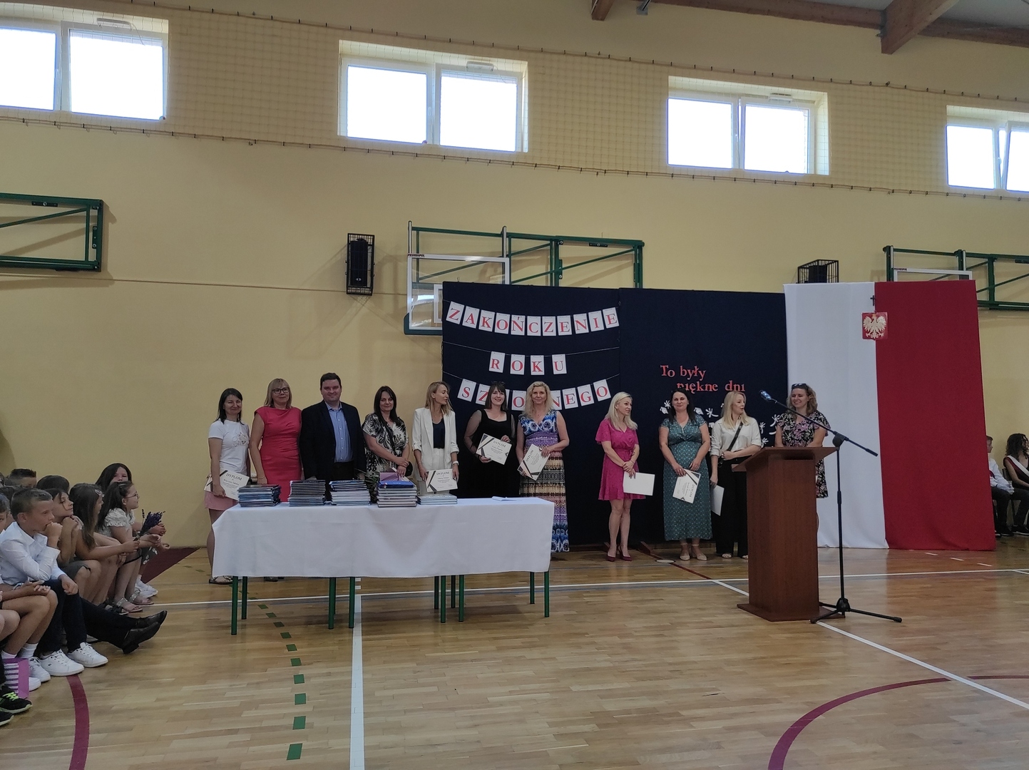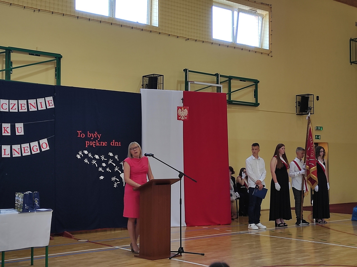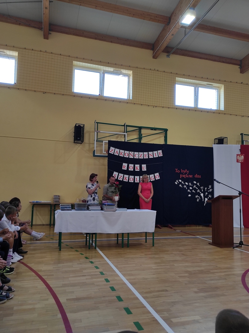 Uroczystość rozpoczęła się od spotkania w sali gimnastycznej. Pani Dyrektor - Małgorzata Wielgus - po przywitaniu zaproszonych gości: burmistrza - Piotra Ślęzaka, proboszczów miejscowych parafii, radnego Rady Miejskiej - Tomasza Habigiera - nauczycieli i rodziców, podziękowała wszystkim dzieciom za sumienną pracę i zaangażowanie oraz podsumowała najważniejsze działania oraz sukcesy osiągane przez uczniów.