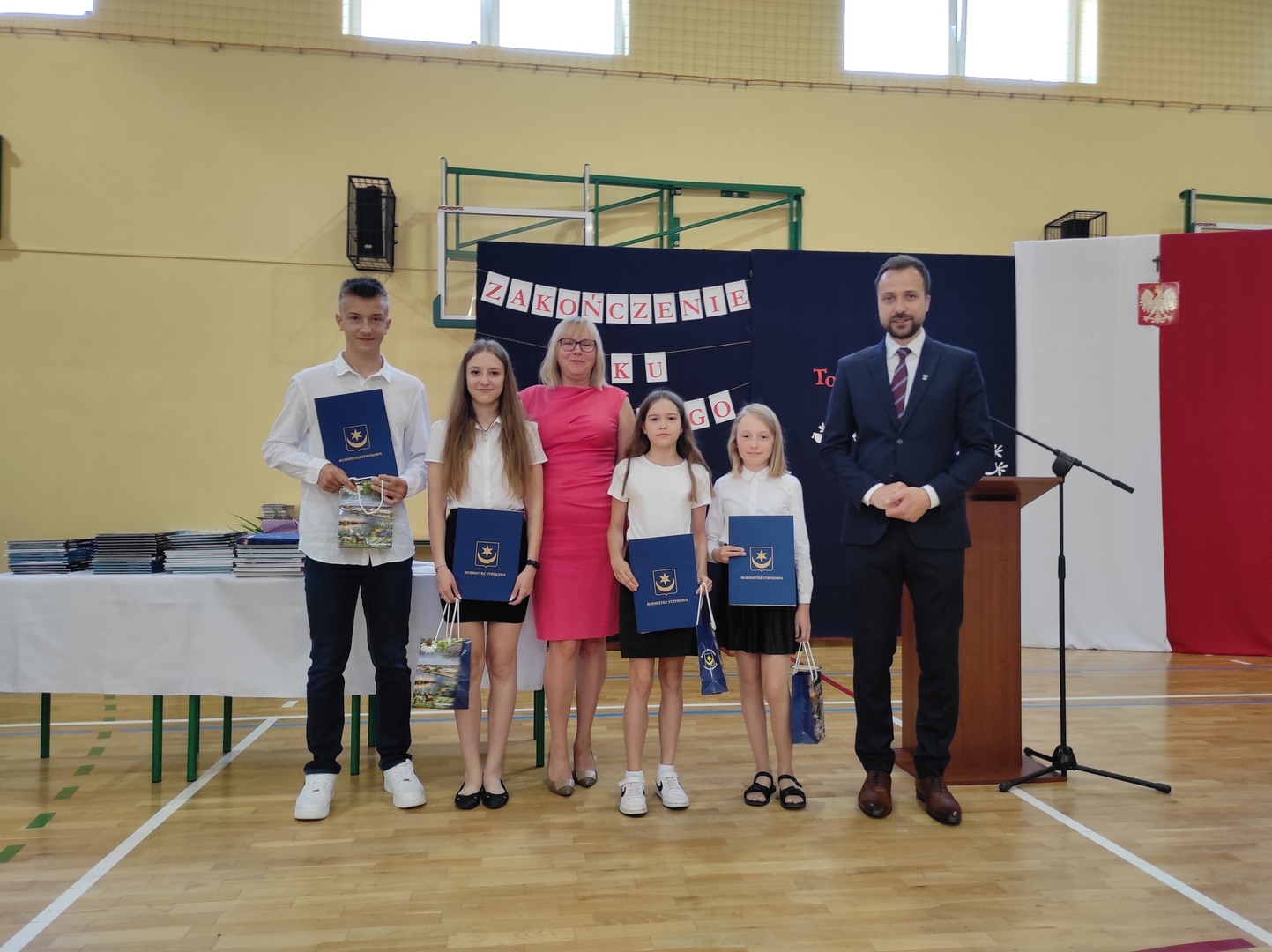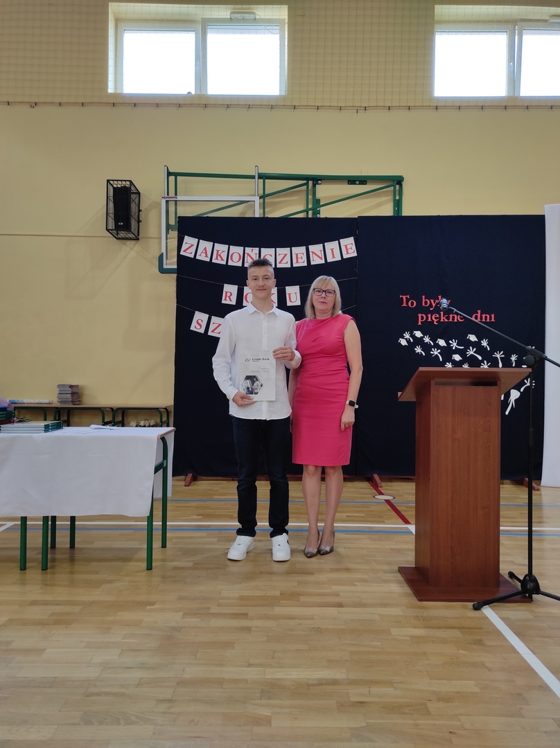 Następnie burmistrz Strykowa - Piotr Ślęzak - wręczył nagrody najlepszym uczniom: Olegowi Raniszewskiemu, Laurze Majdzie, Zuzannie Nowackiej i Krystynie Opalskiej. Nagrodę Łódzkiego Banku Spółdzielczego otrzymał uczeń klasy siódmej Oleg Raniszewski, który uzyskał najwyższą średnią w szkole.