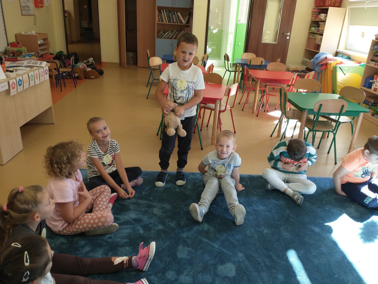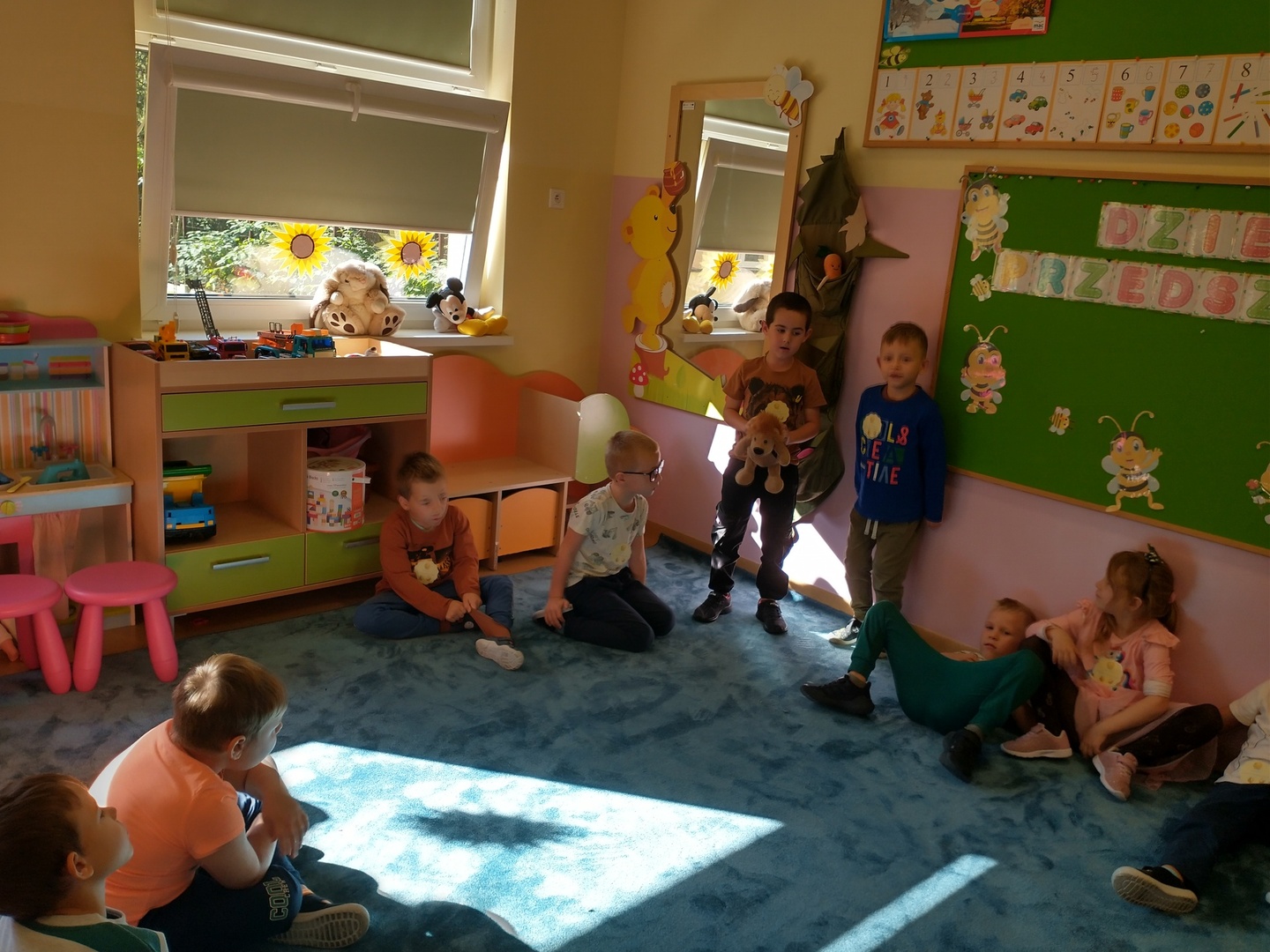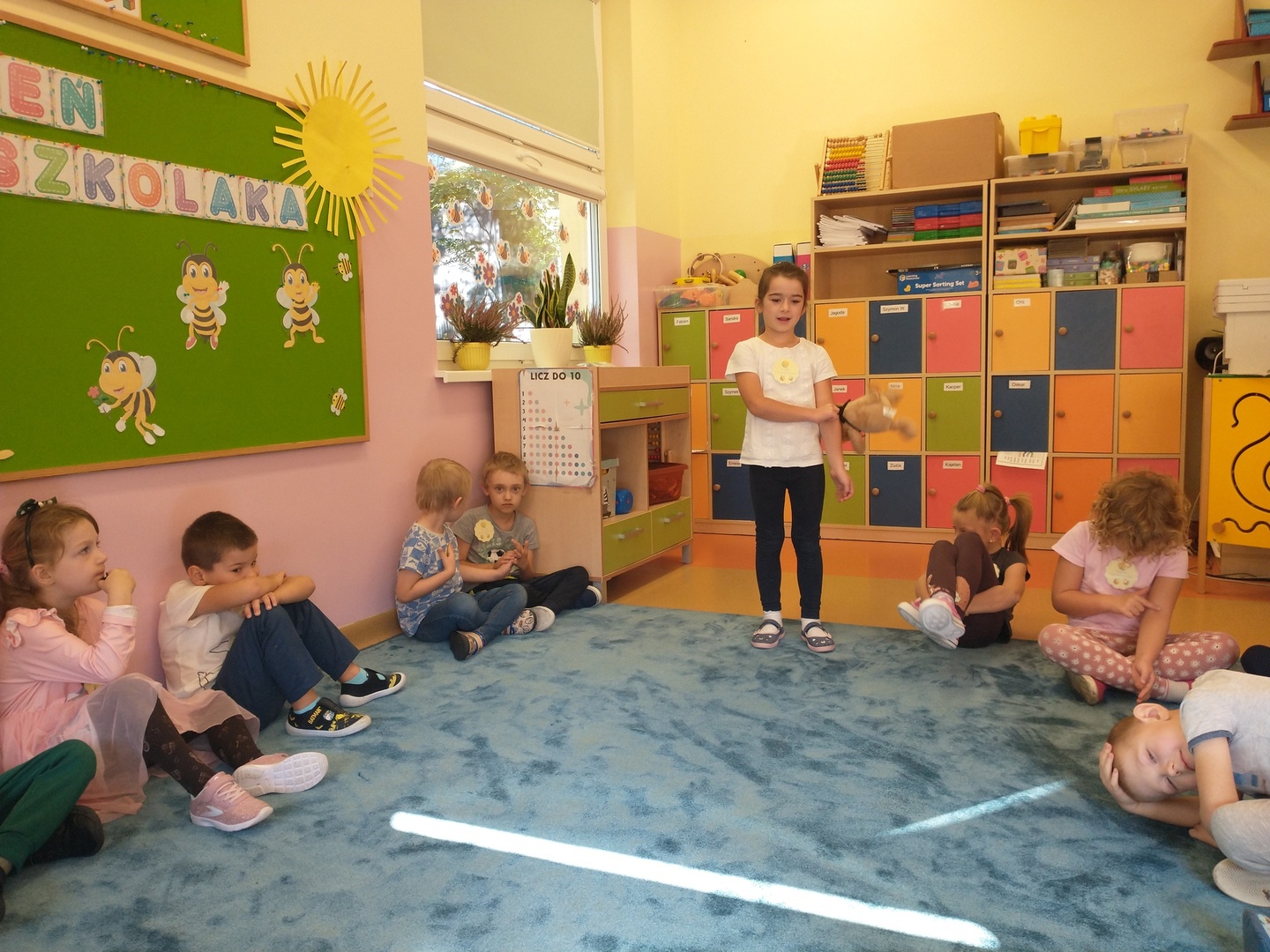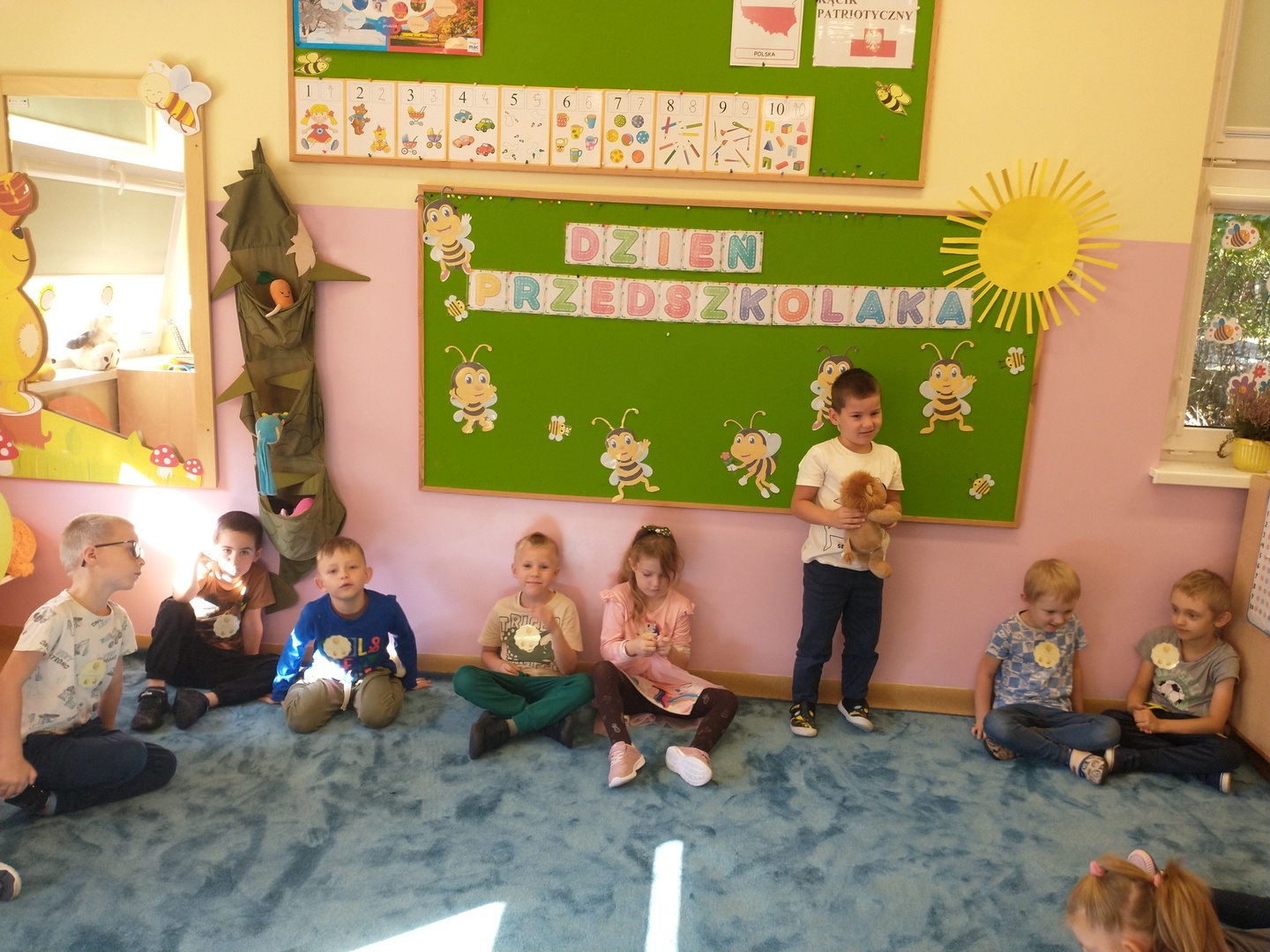 W przedszkolnej grupie ,,Pszczółki” 20 września przebiegał pod hasłem wspólnej zabawy. Na przywitanie dzieci otrzymały odznakę super przedszkolaka. Każdy miał okazję dokonać autoprezentacji (podać swoje imię, ulubioną zabawę i potrawę). Następnie dzieci wspólnie szukały sposobów na nudę, aby pomóc Krzysiowi – bohaterowi wiersza. Zostało zaprezentowanych wiele ciekawych pomysłów.