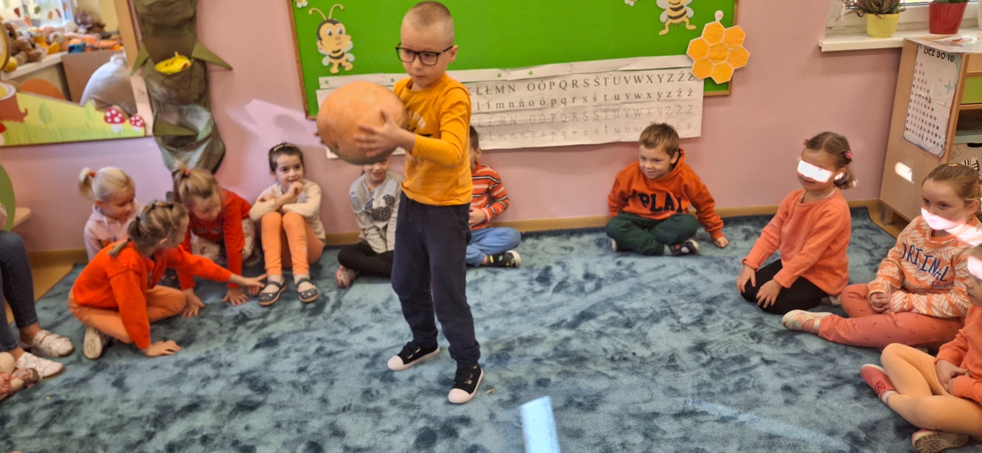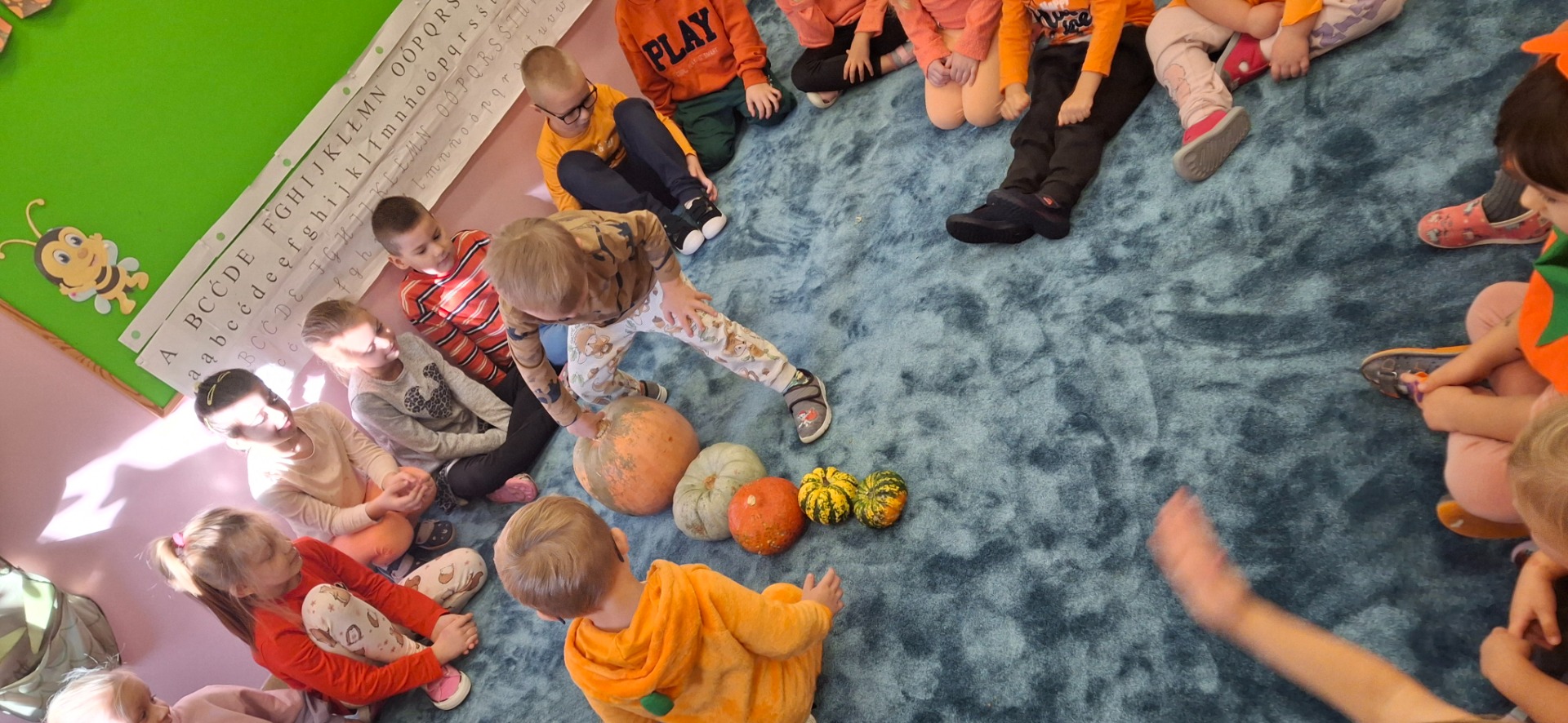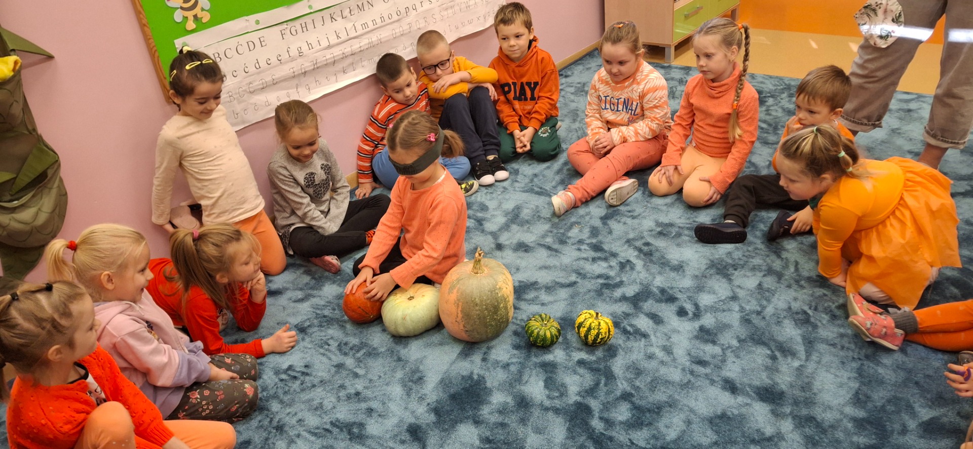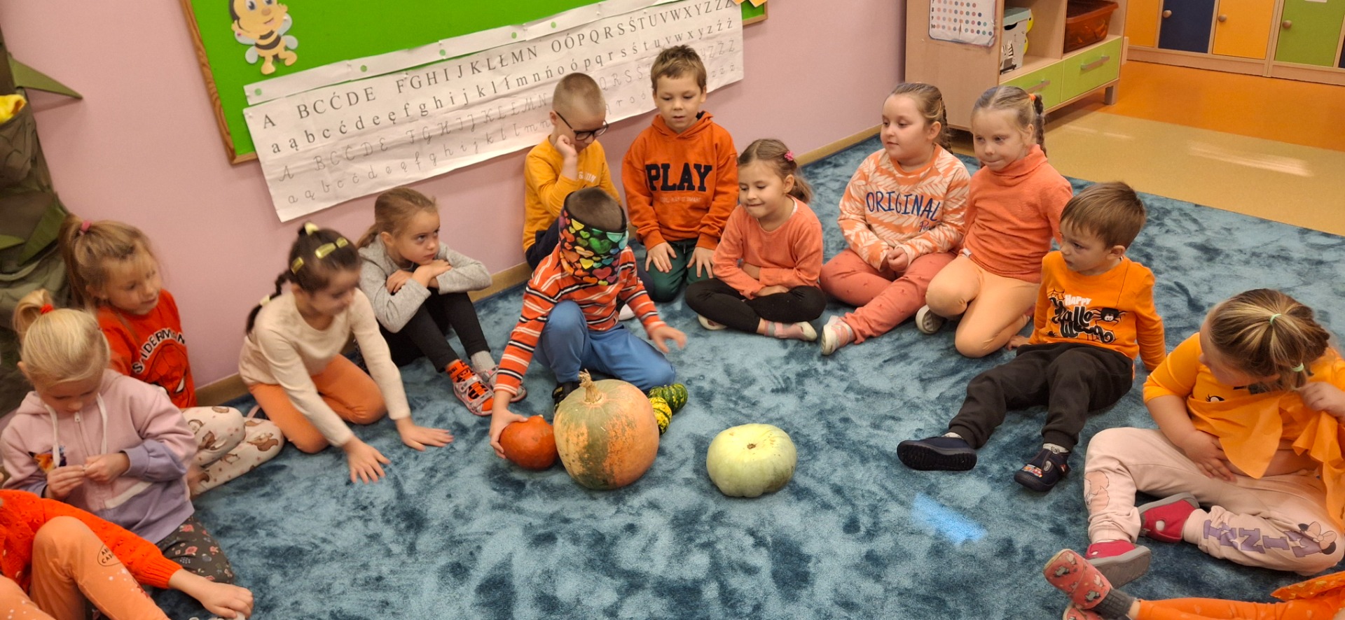 Przedszkolaki z grupy ,,Misie” i ,,Pszczółki” tego dnia przyszły ubrane w kolorze pomarańczowym. Niektóre z dzieci przebrały się za dynie, co było wspaniałym wstępem do rozmów, czy dynia to owoc, czy warzywo. Dzieci otrzymały różne odmiany dyń i porównywały je pod względem wielkości, koloru i kształtu, następnie z zawiązanymi oczami układały je od najmniejszej do największej, co było nie lada wyzwaniem. Nie zabrakło też kart pracy, w których dopasowywały cienie do dyń, łączyły warzywa od najmniejszego do największego, kolorowały dynie wg wielkości.