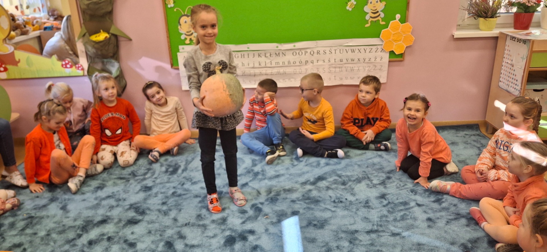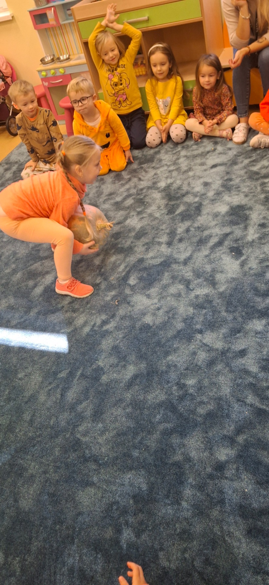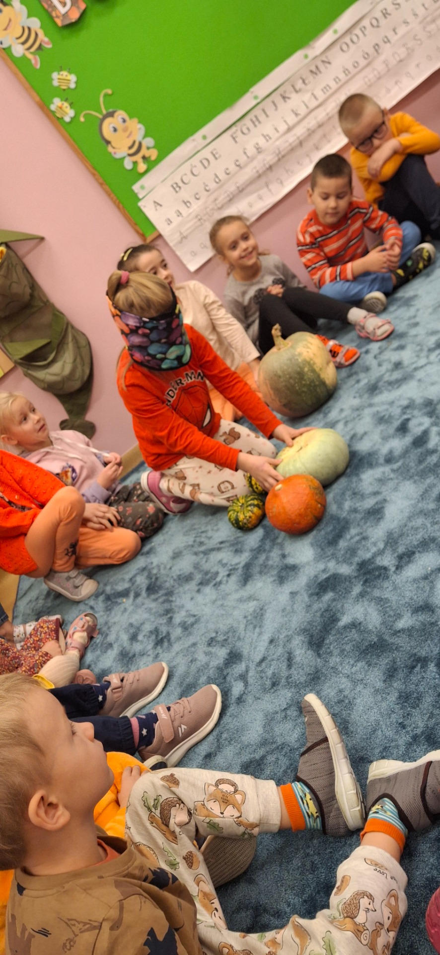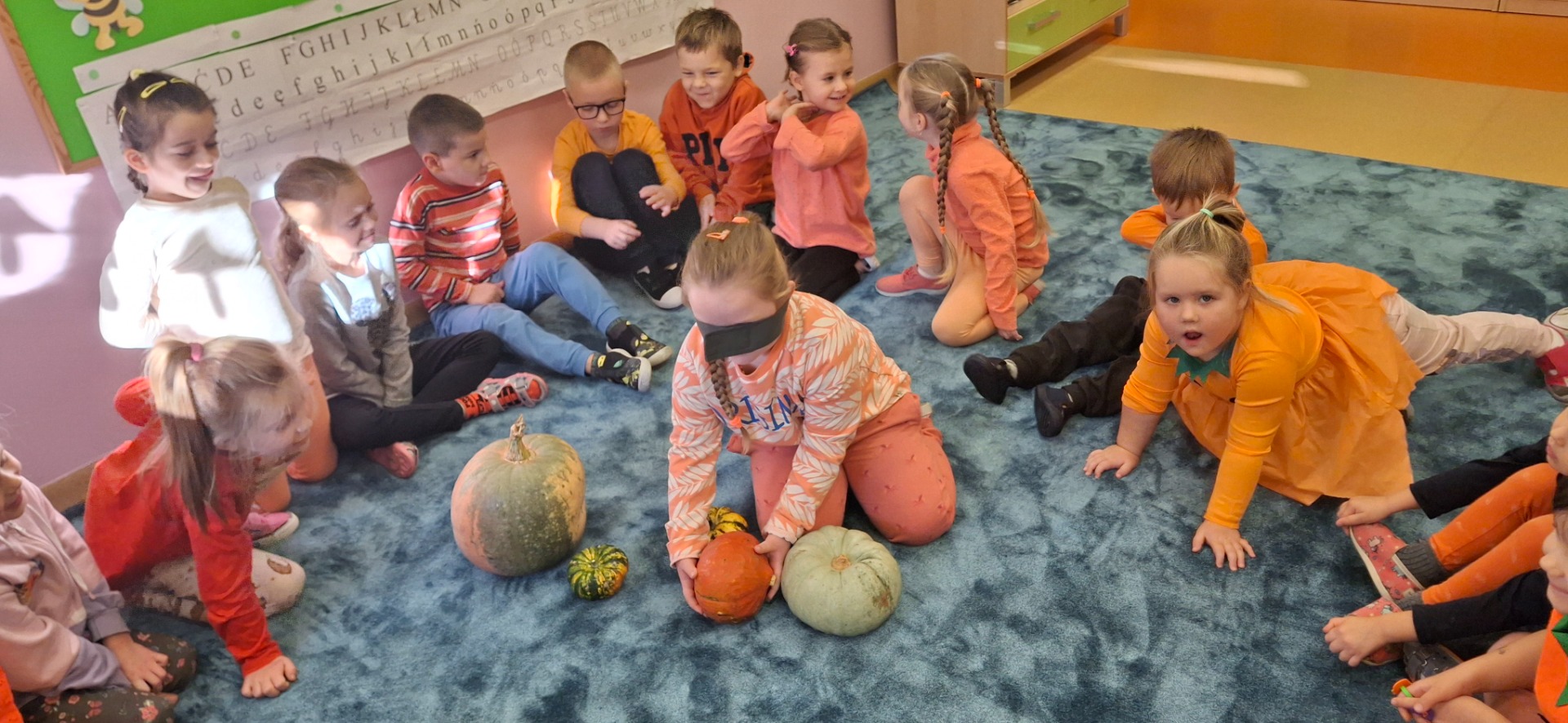Przedszkolaki z grupy ,,Misie” i ,,Pszczółki” tego dnia przyszły ubrane w kolorze pomarańczowym. Niektóre z dzieci przebrały się za dynie, co było wspaniałym wstępem do rozmów, czy dynia to owoc, czy warzywo. Dzieci otrzymały różne odmiany dyń i porównywały je pod względem wielkości, koloru i kształtu, następnie z zawiązanymi oczami układały je od najmniejszej do największej, co było nie lada wyzwaniem. Nie zabrakło też kart pracy, w których dopasowywały cienie do dyń, łączyły warzywa od najmniejszego do największego, kolorowały dynie wg wielkości.