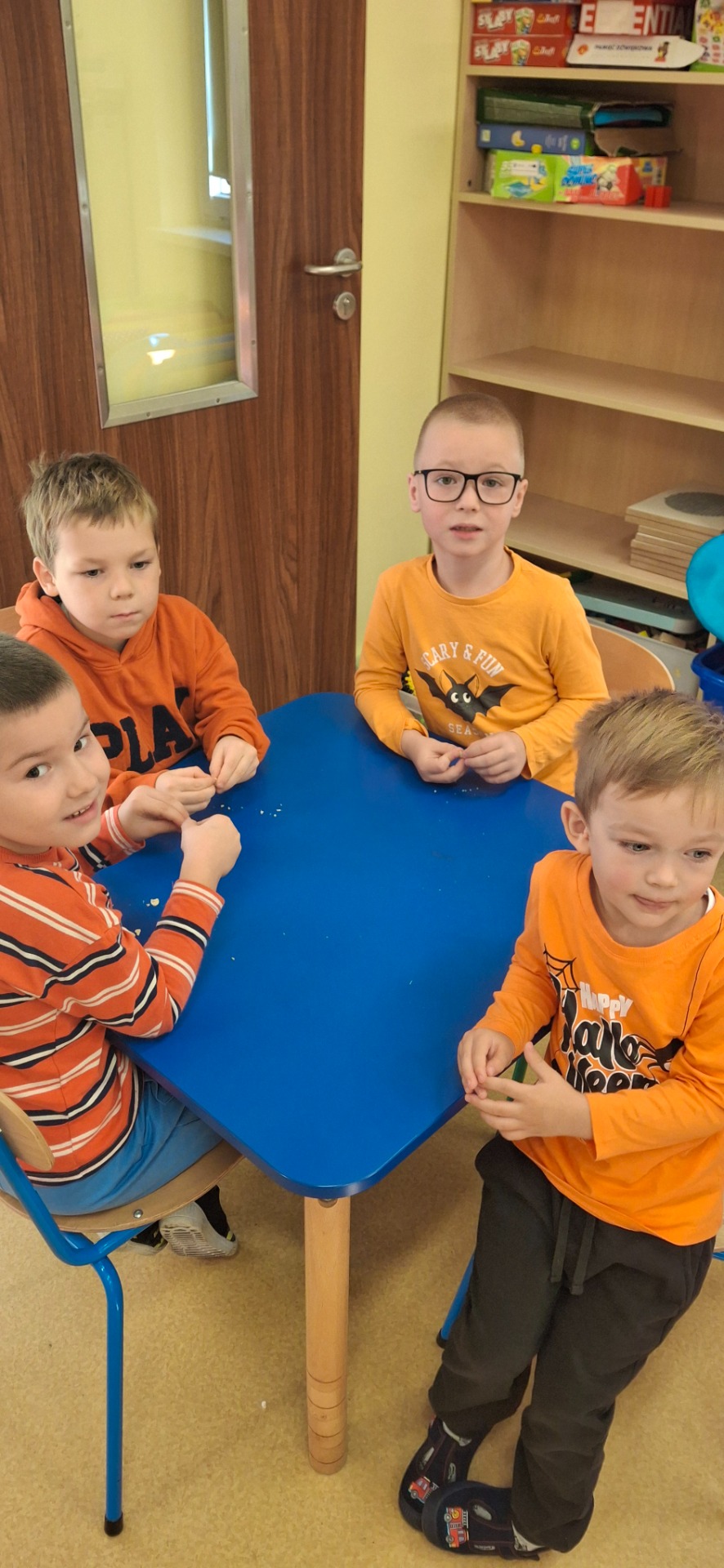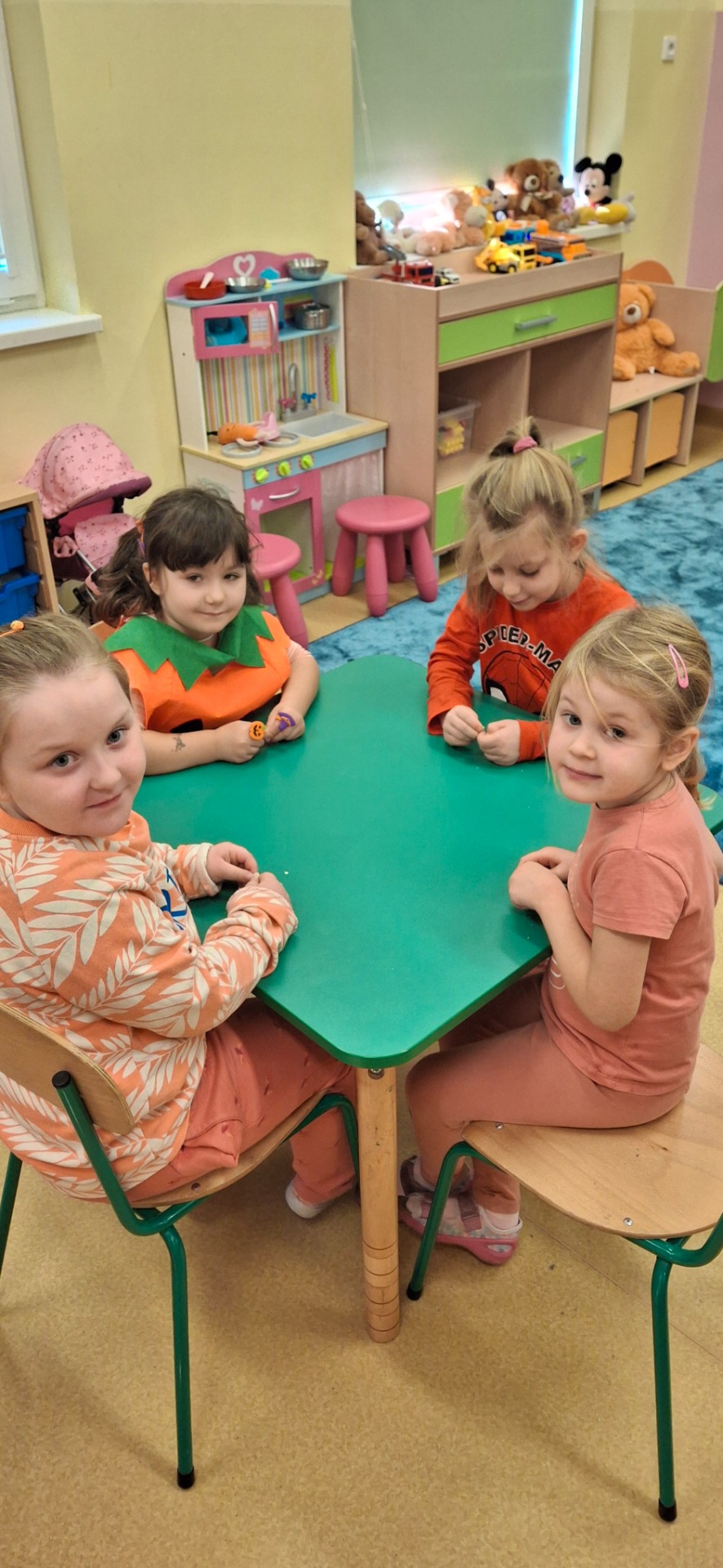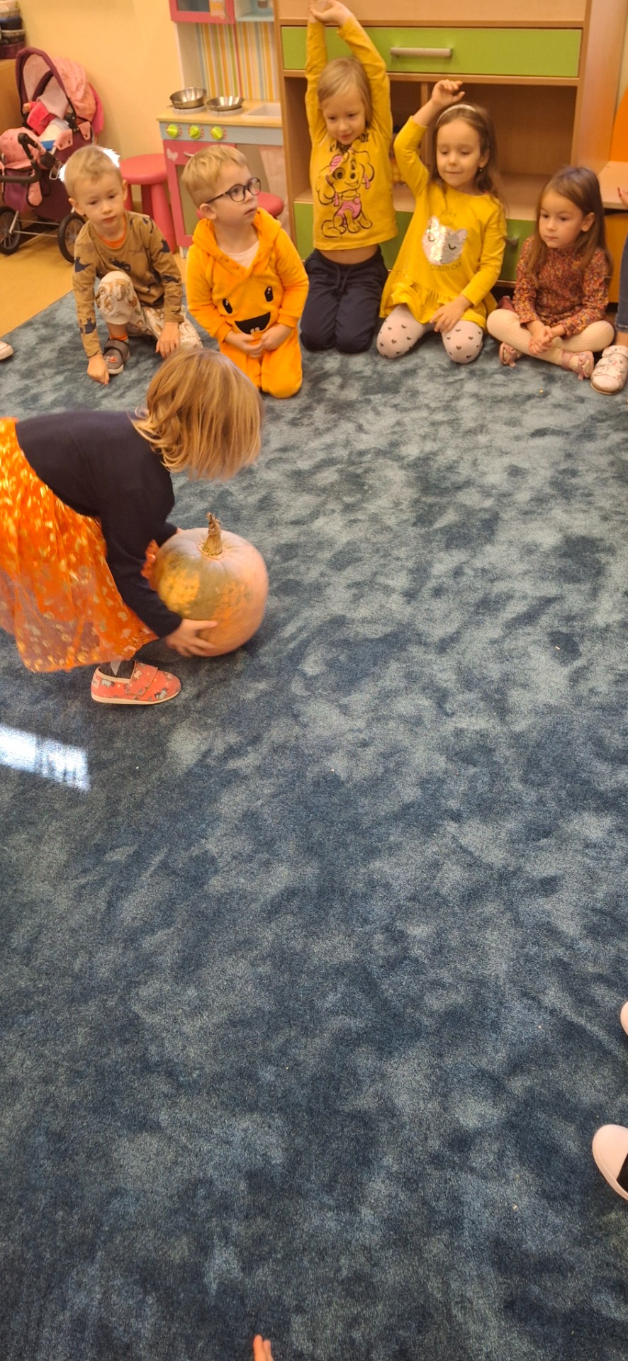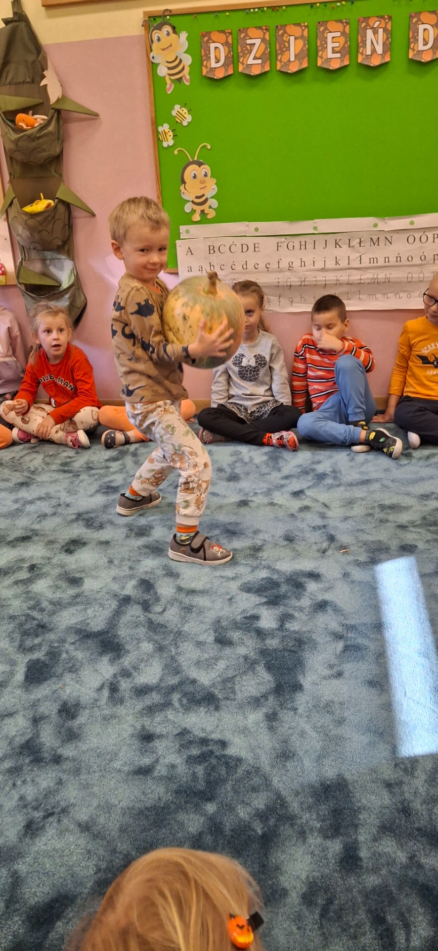 Przedszkolaki z grupy ,,Misie” i ,,Pszczółki” tego dnia przyszły ubrane w kolorze pomarańczowym. Niektóre z dzieci przebrały się za dynie, co było wspaniałym wstępem do rozmów, czy dynia to owoc, czy warzywo. Dzieci otrzymały różne odmiany dyń i porównywały je pod względem wielkości, koloru i kształtu, następnie z zawiązanymi oczami układały je od najmniejszej do największej, co było nie lada wyzwaniem. Nie zabrakło też kart pracy, w których dopasowywały cienie do dyń, łączyły warzywa od najmniejszego do największego, kolorowały dynie wg wielkości.