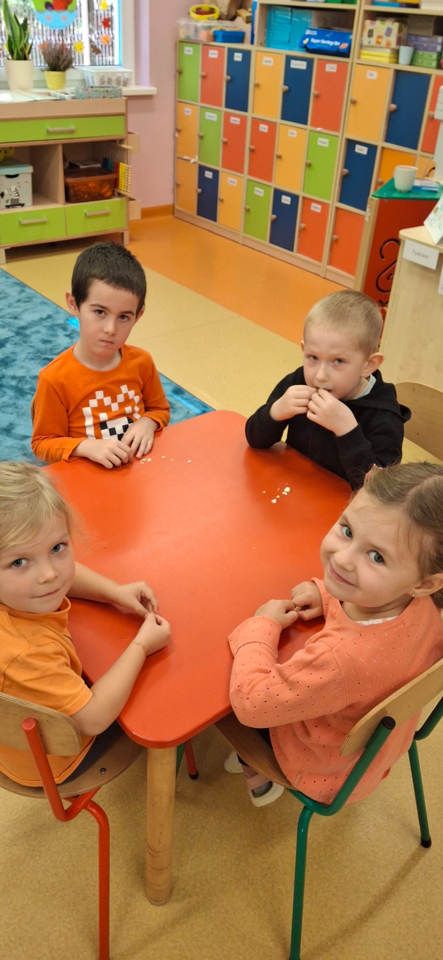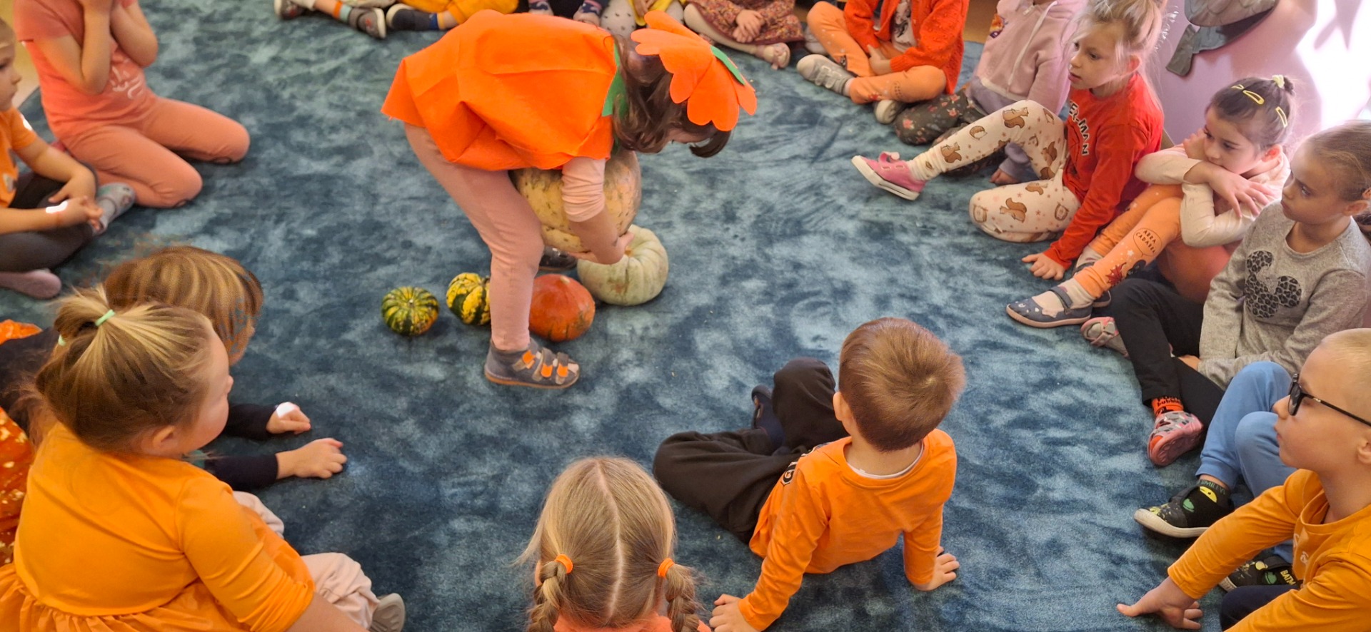 W przerwach pomiędzy zajęciami nie zabrakło gimnastyki i tańców przy dyniowej muzyce. Na zakończenie odbyła się degustacja nasion dyni, które maluchy samodzielnie próbowały obrać,
