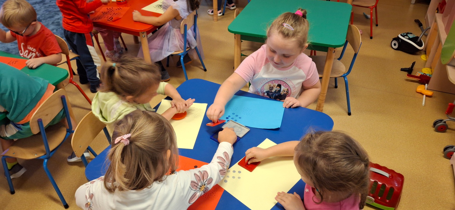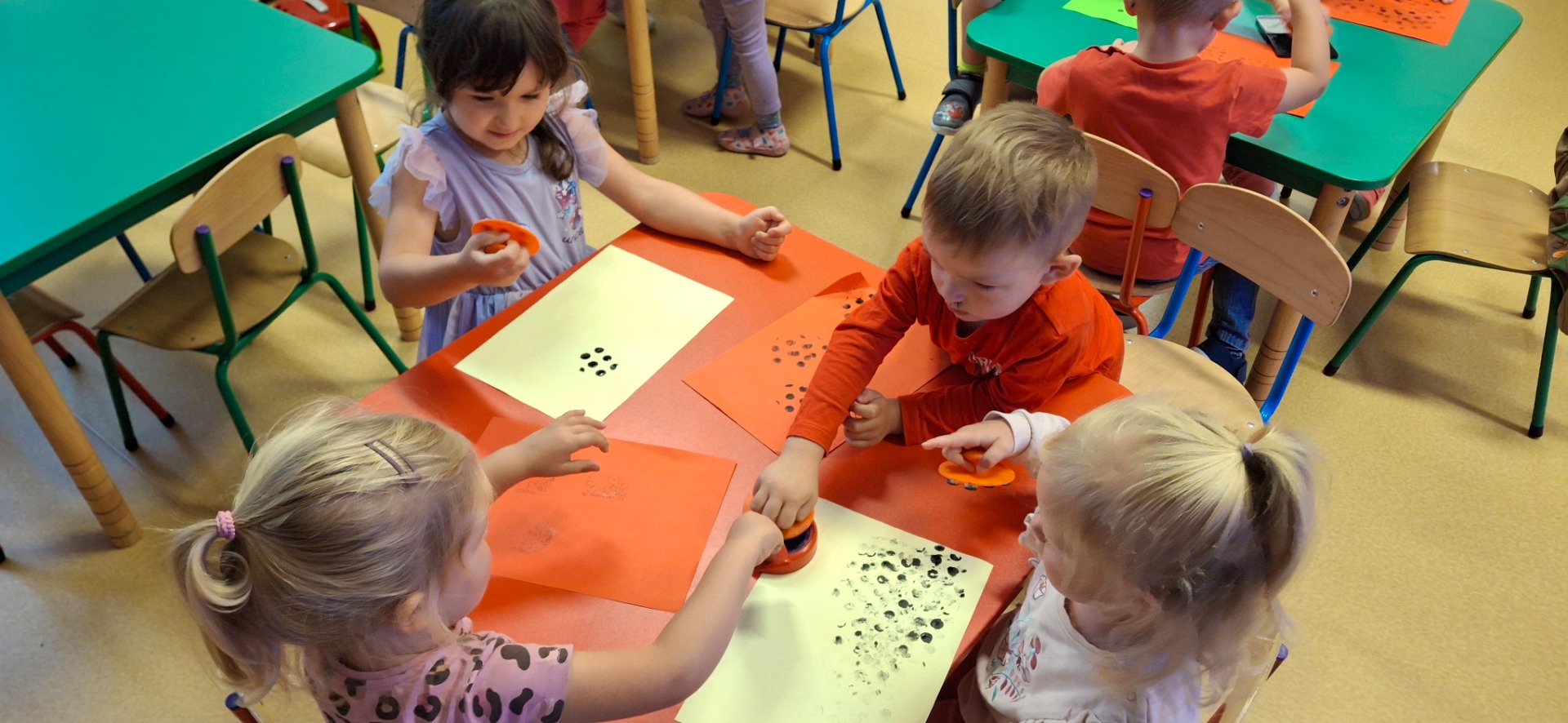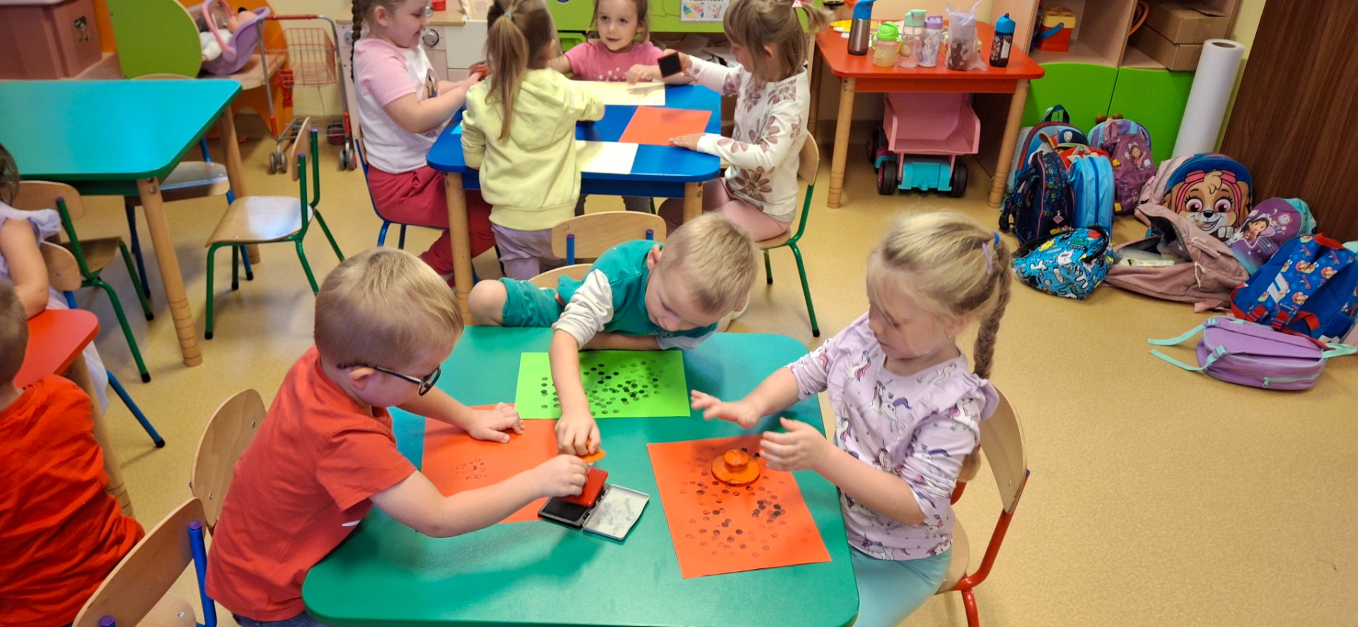 · Dzień Kropki - czy koło to też kropka?- poszukiwania kropek na sali. Wycinanie małych i dużych kropek z papieru. Kropkowe stemplowanie to jedne z ulubionych prac dzieci.