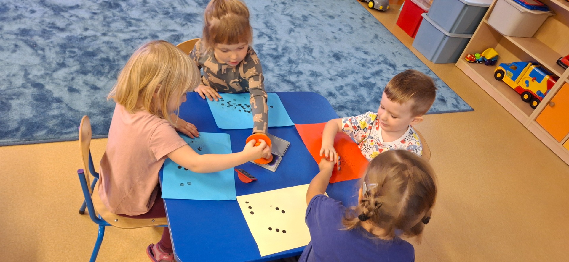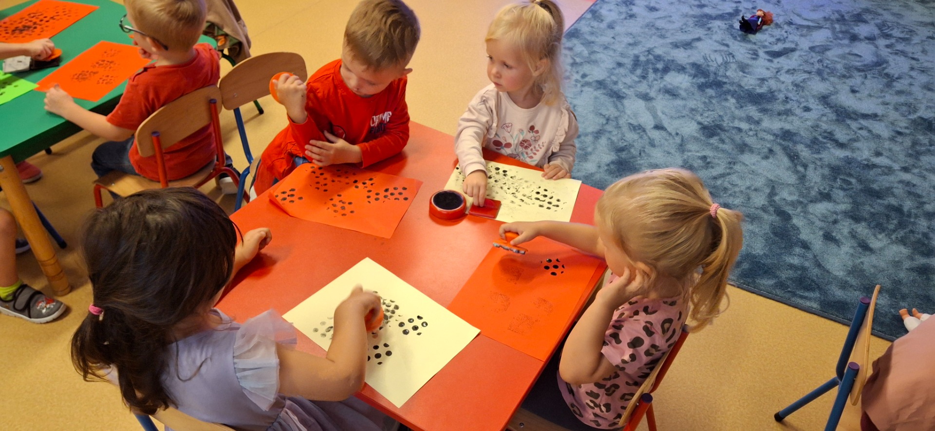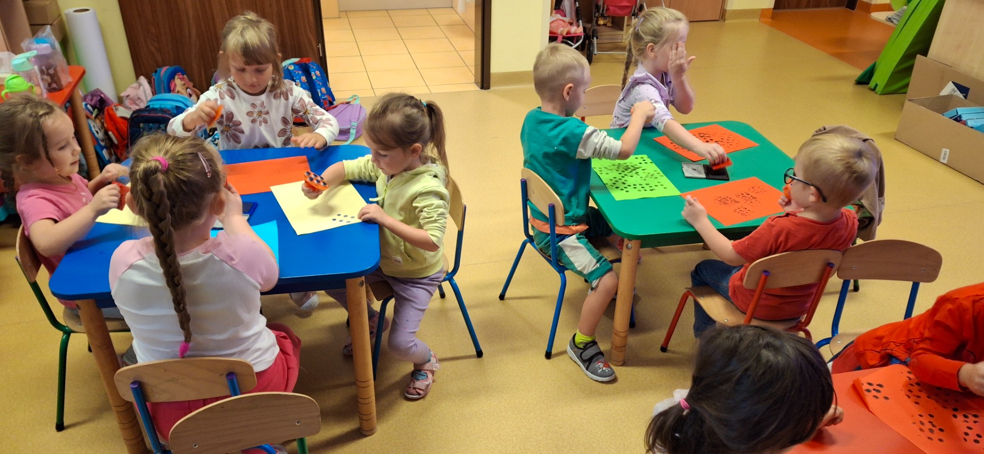 · Dzień Kropki - czy koło to też kropka?- poszukiwania kropek na sali. Wycinanie małych i dużych kropek z papieru. Kropkowe stemplowanie to jedne z ulubionych prac dzieci.
