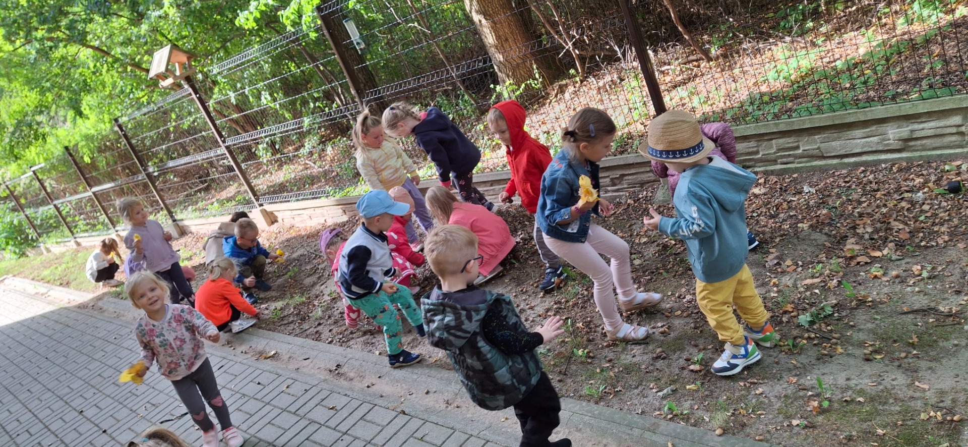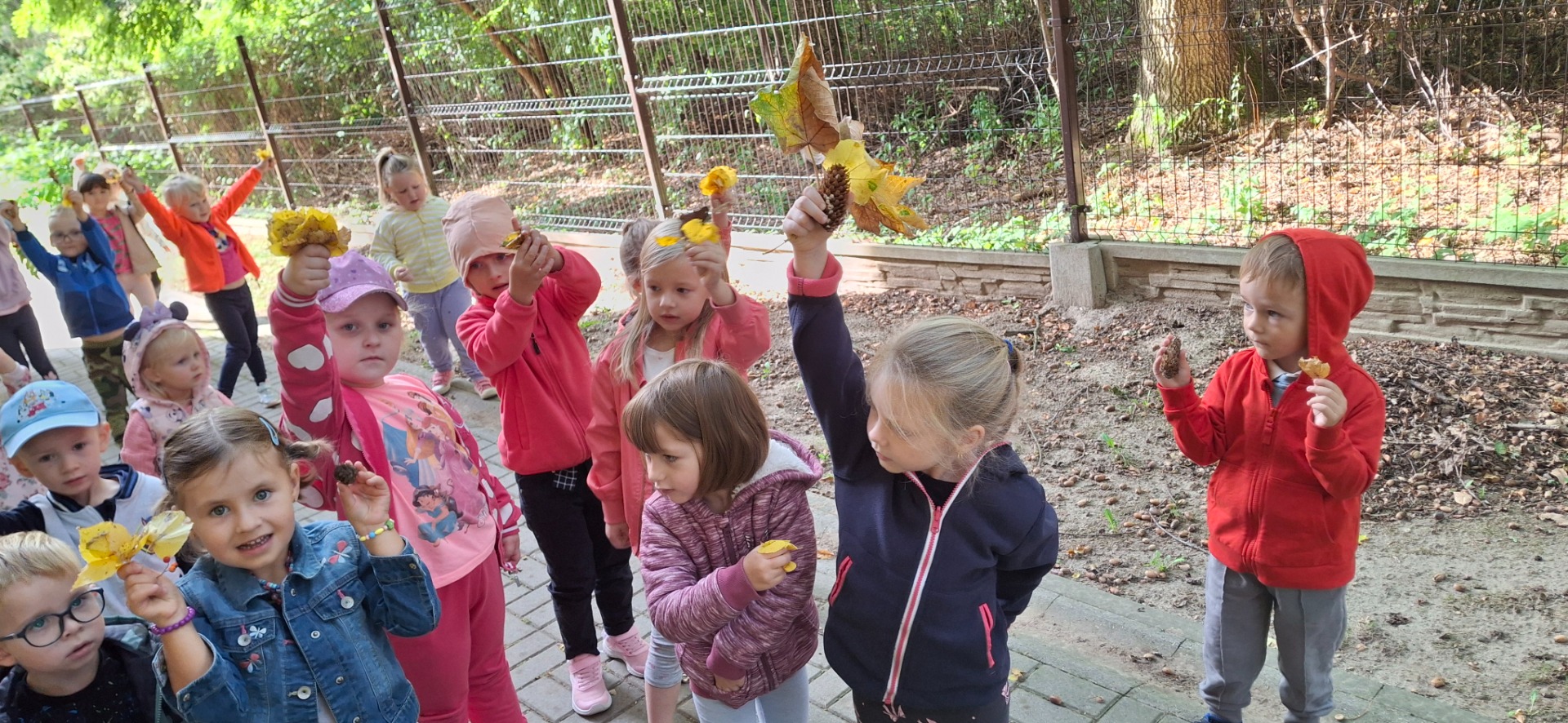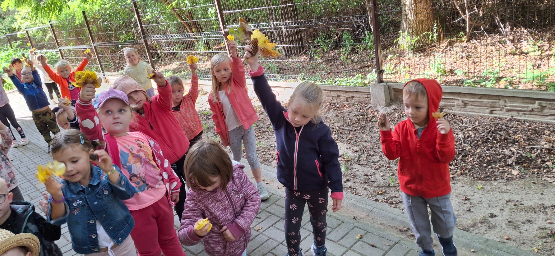 · Dzień Spadającego Liścia - czyli Pierwszy Dzień Jesieni - tego dnia przedszkolaki sprawdzały, co zmienia się w przyrodzie. Wybrały się na spacer, opisywały, jak wyglądają drzewa, nazywały kolory, zbierały liście z których wykonały bukiety, a także sprawdzały, co kryje się w środku żołędzia, kasztana i orzecha laskowego. Dzieci porównywały wygląd oraz twardość łupiny darów jesieni, a także wykonały pracę plastyczną.
