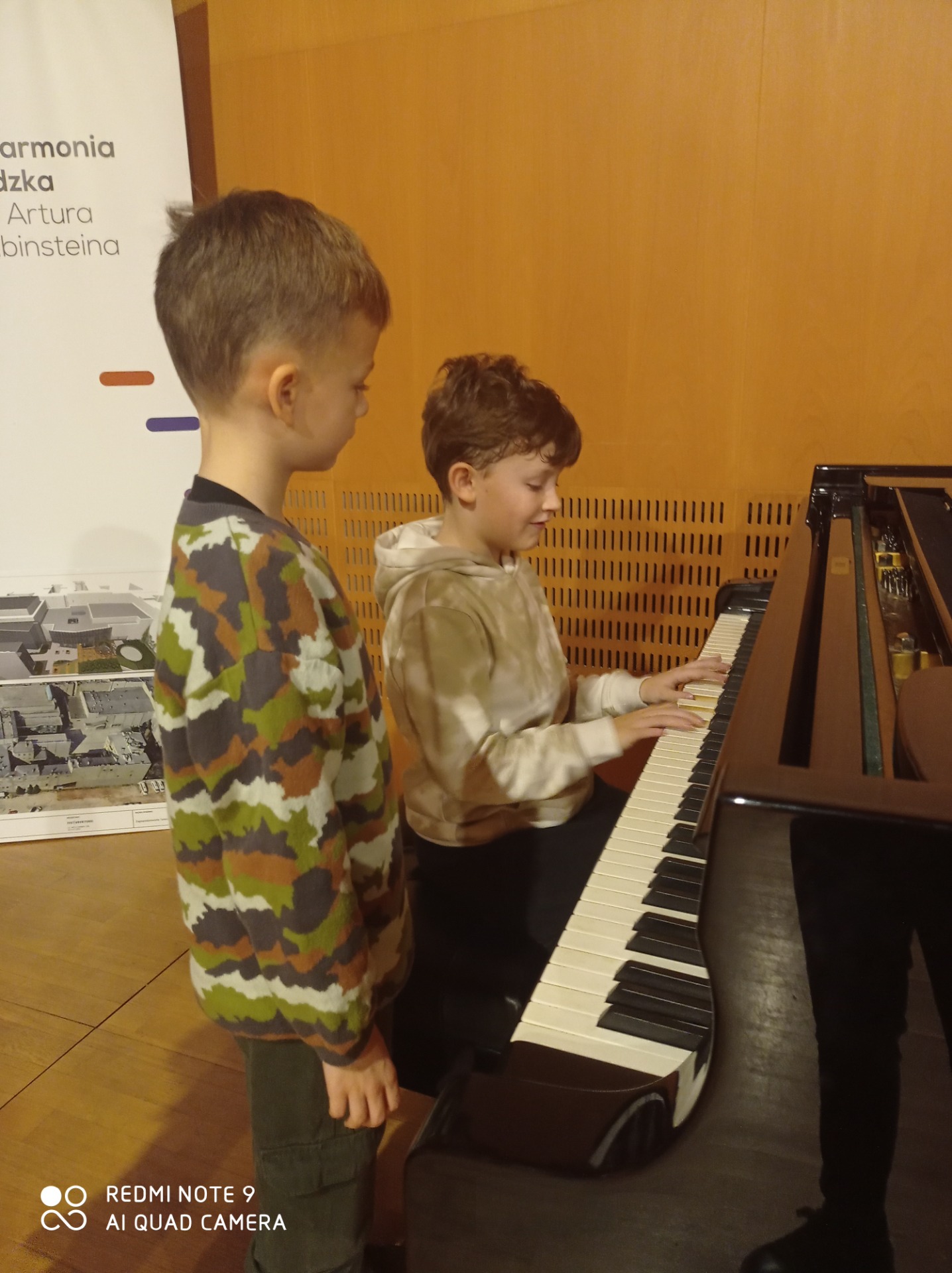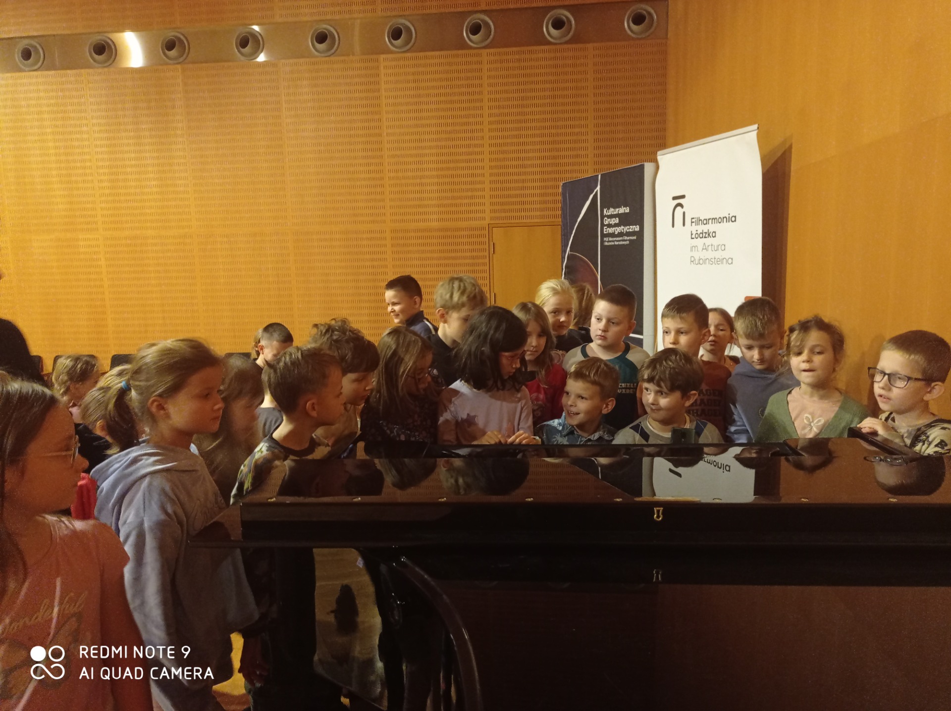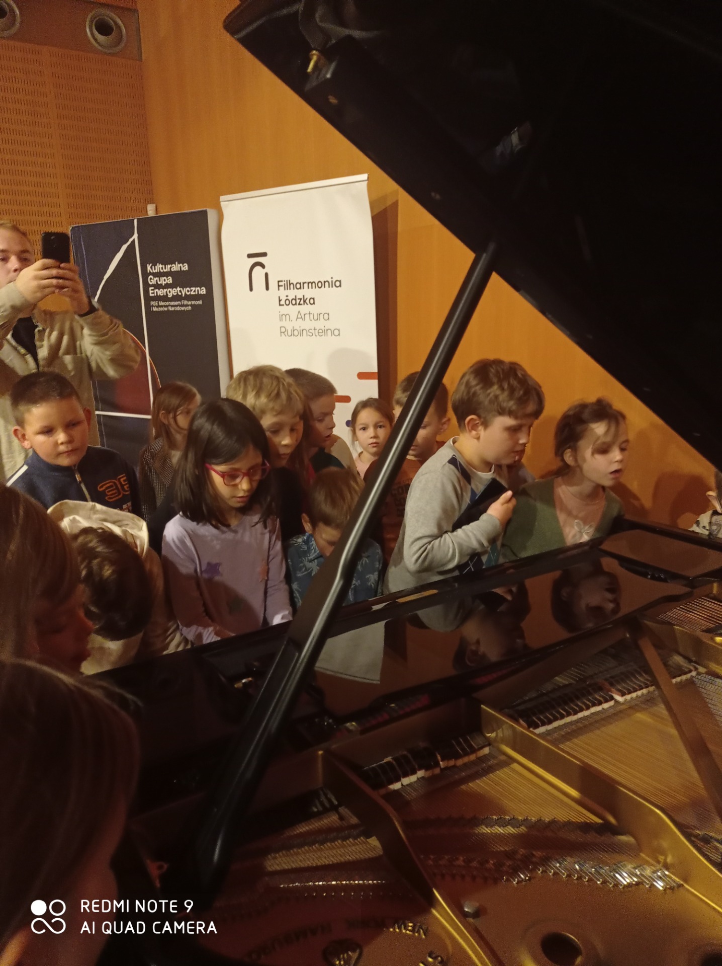 20 listopada br. uczniowie klas drugich wraz z opiekunami uczestniczyli w ciekawych, umuzykalniających zajęciach w Filharmonii Łódzkiej. Pobyt w tym interesującym miejscu dzieci rozpoczęły od obejrzenia próby. Niezwykłym przeżyciem było podpatrywanie muzyków orkiestry i dyrygenta podczas pracy na sali koncertowej. Ciekawą atrakcją było również zwiedzanie budynku i poznanie takich miejsc w filharmonii jak: garderoba artystów, pomieszczenia inspicjentów, zaplecze estrady, a nawet bawialnia dla dzieci. Tam uczniowie poczuli się jak prawdziwi muzycy, ponieważ mogli zagrać na wielu instrumentach muzycznych. Zwieńczeniem pobytu była wieloformatowa gra planszową pt. „Fortepian Rubinsteina”, w którą zagrali uczestnicy wycieczki. Nie zabrakło także pokazu talentów muzycznych uczniów. Mali muzycy zaprezentowali znane utwory na fortepianie.
