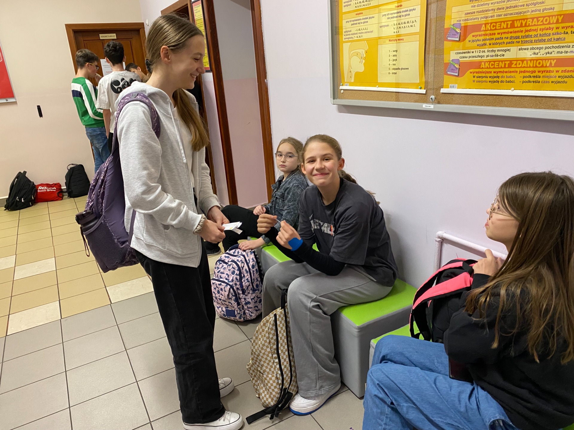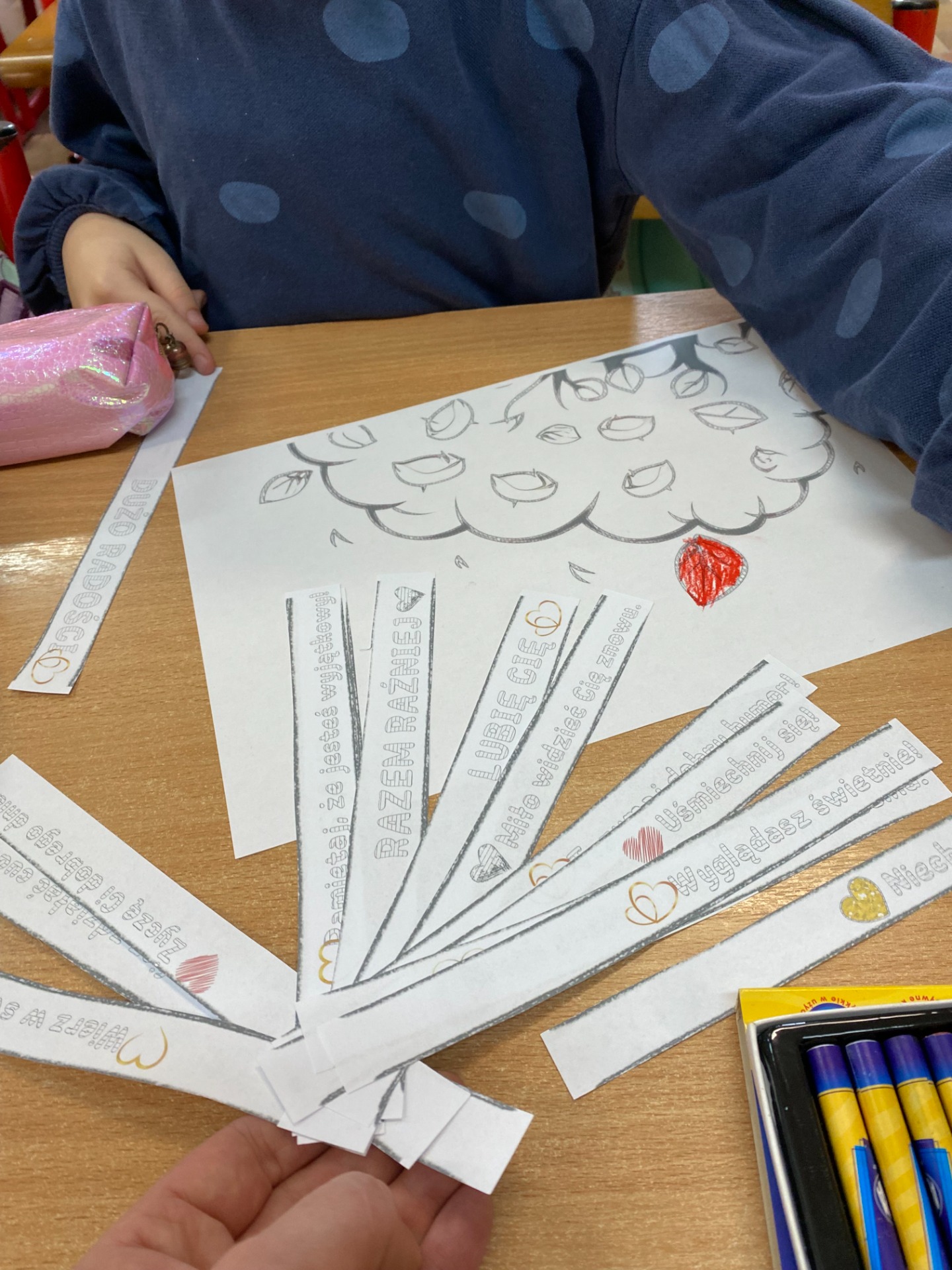 Członkowie Samorządu Uczniowskiego obdarowali swoich kolegów karteczkami, na których widniały komplementy i budujące słowa. Każdy uczeń usłyszał lub przeczytał o sobie coś miłego, co wywołało szczery uśmiech.