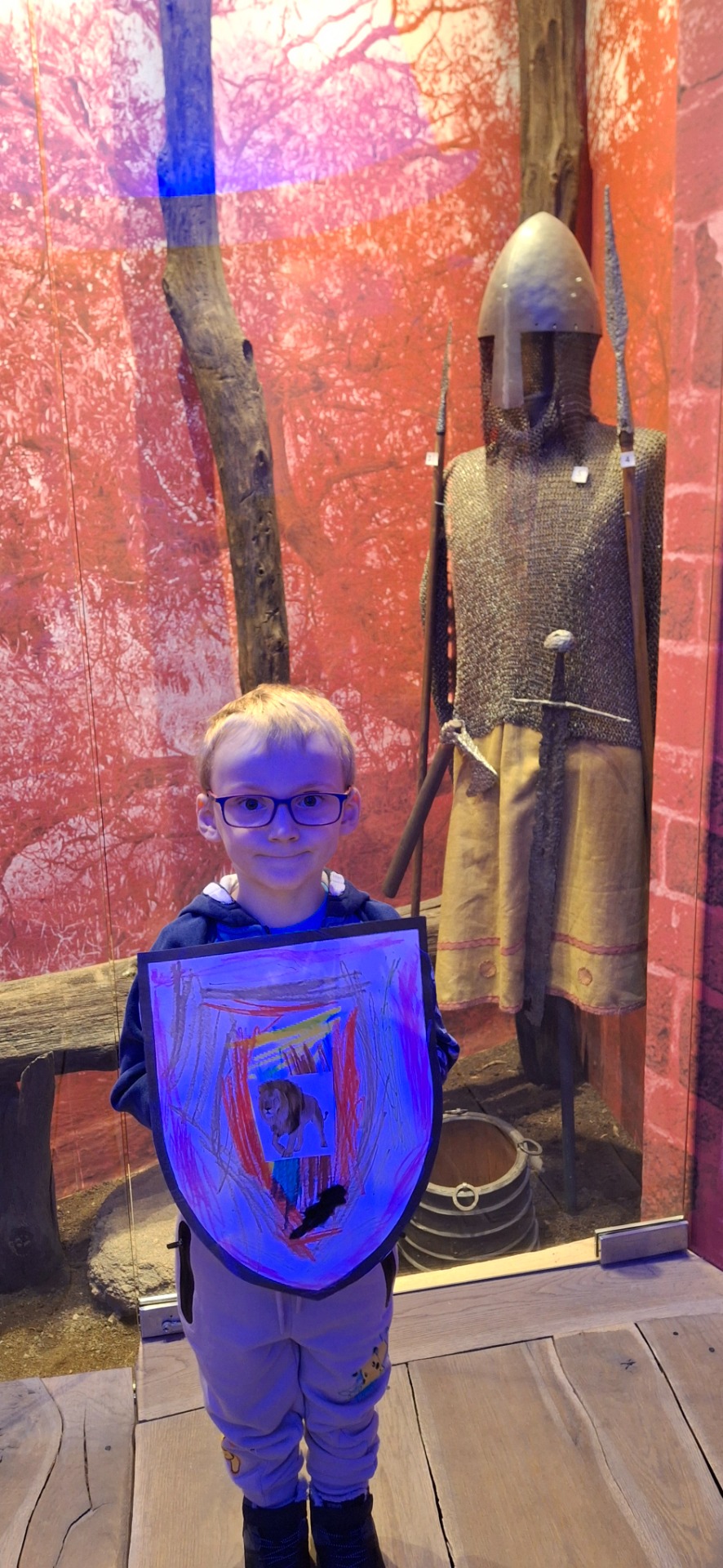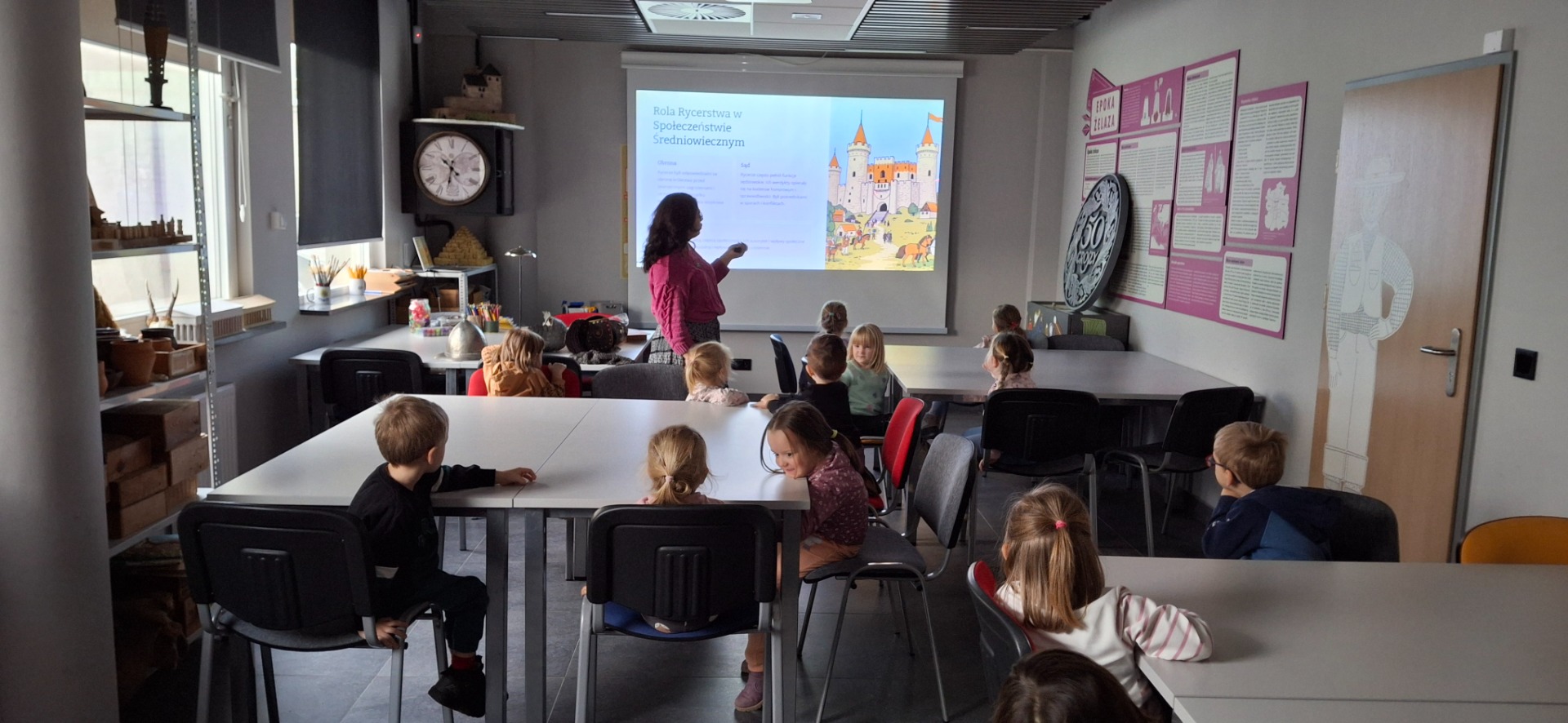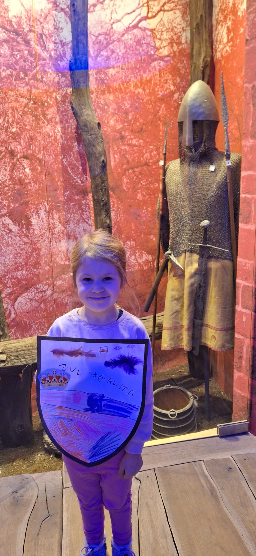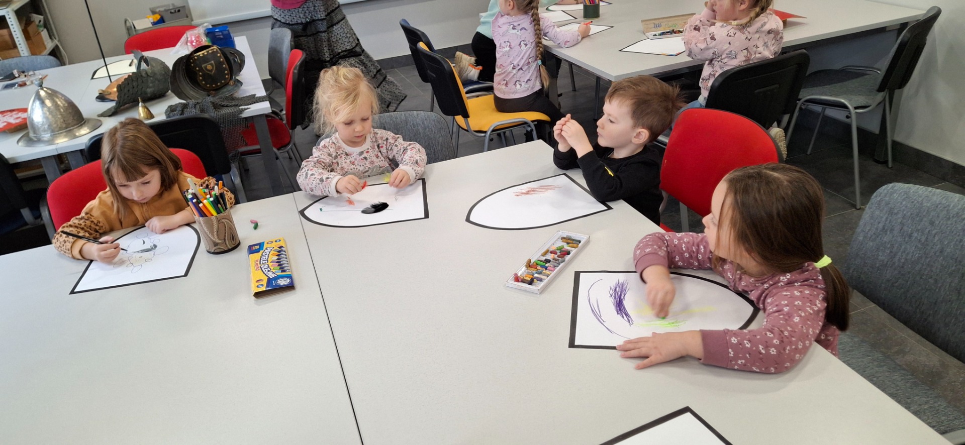 Przedszkolaki z młodszej grupy wzięły udział w zajęciach pt. „W czasach rycerzy”. Podczas wizyty w muzeum dzieci zobaczyły zabytki z czasów średniowiecza. Dowiedziały się, co oznacza być prawdziwym rycerzem i jak wyglądało życie tej grupy społecznej w czasach średniowiecza. Korzystając z przygotowanych szablonów, przedszkolaki tworzyły tarcze, dekorując je według własnego pomysłu.