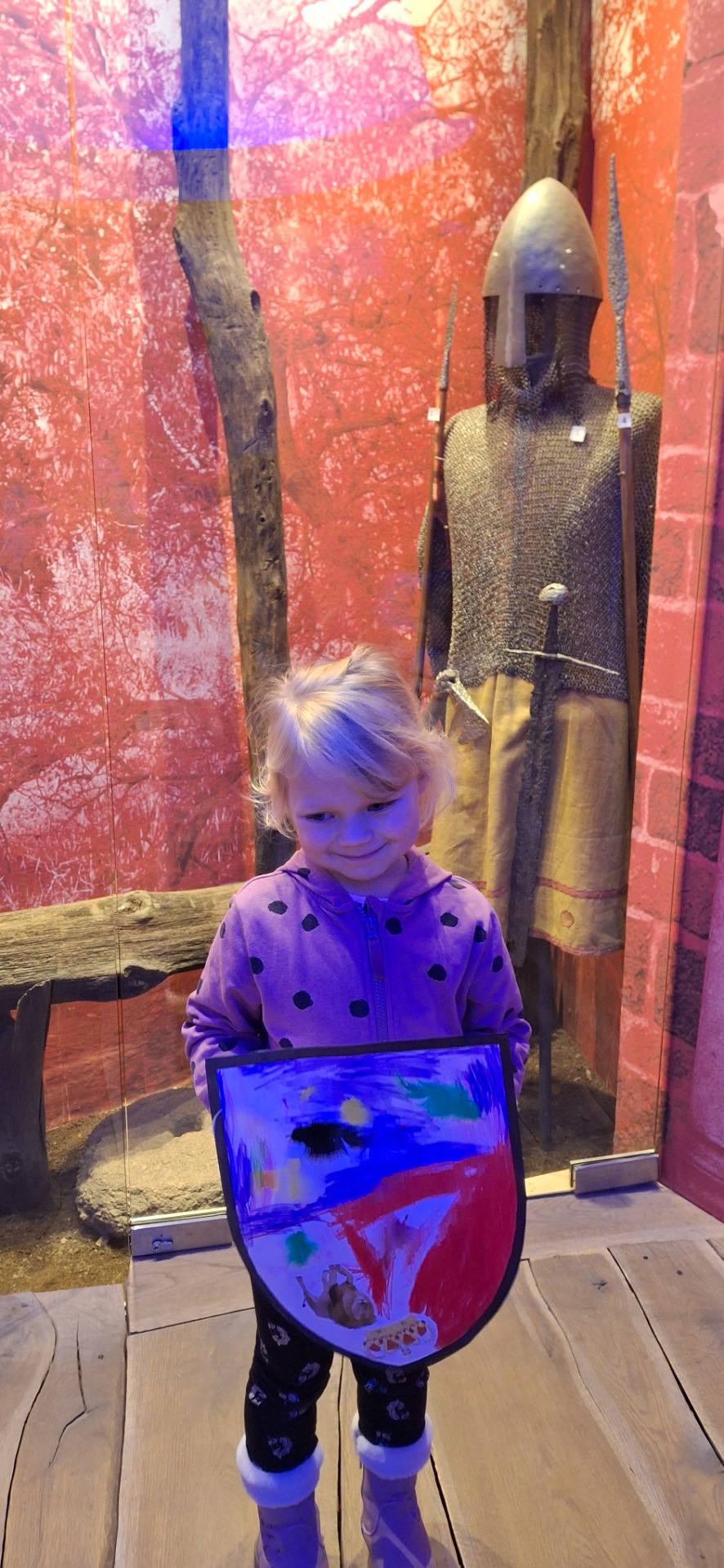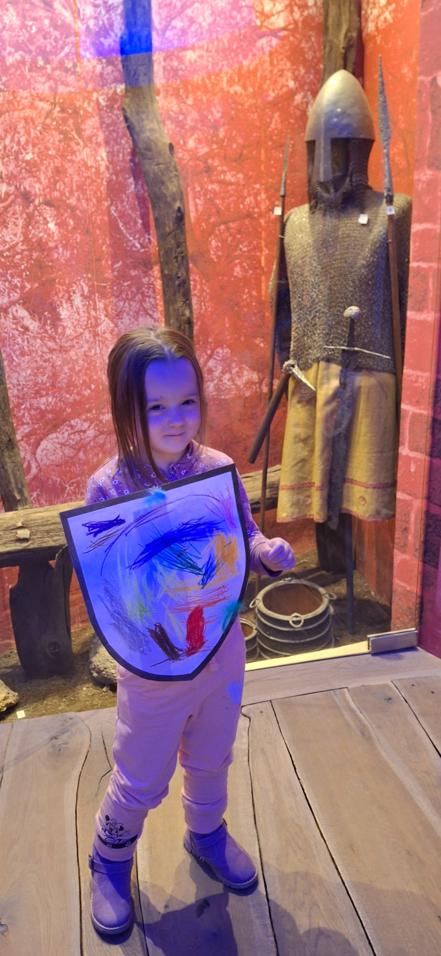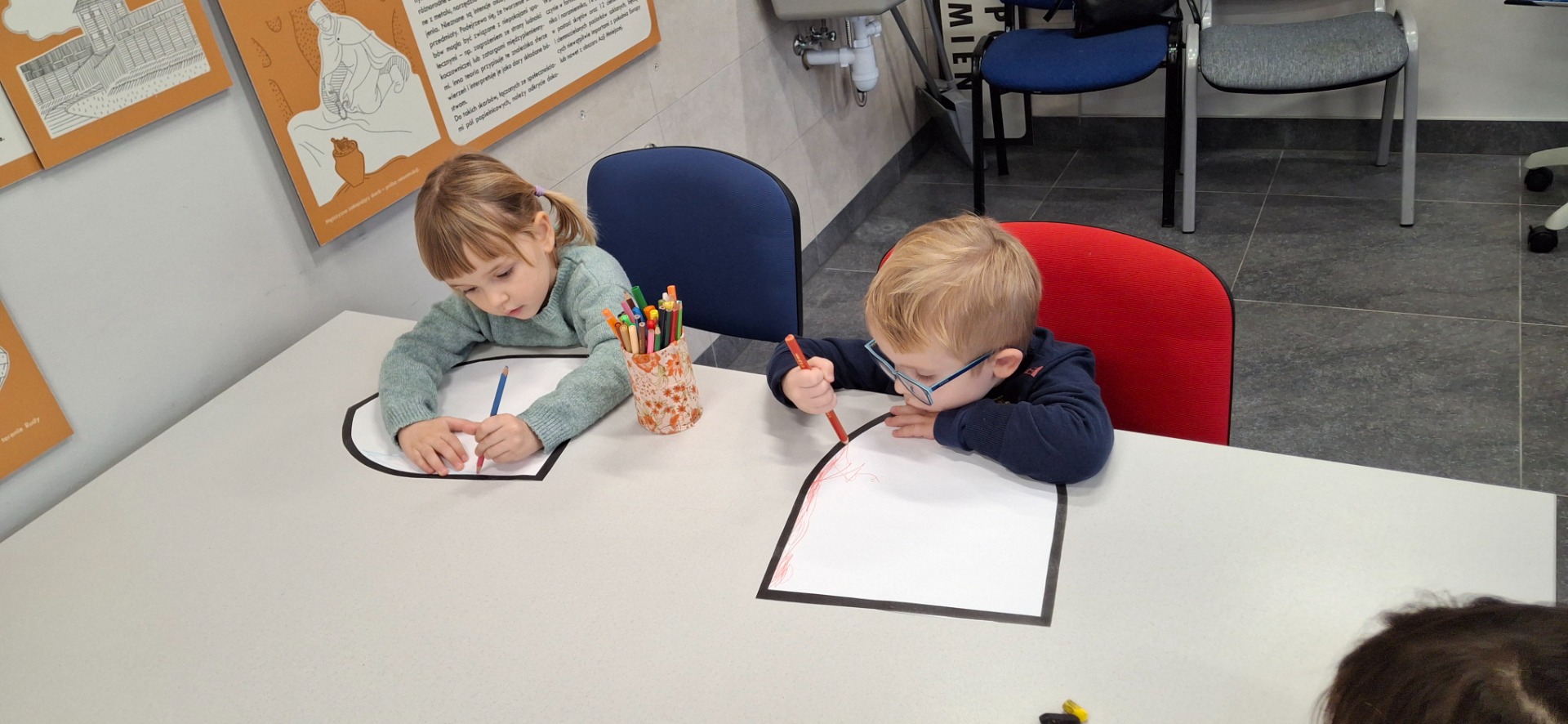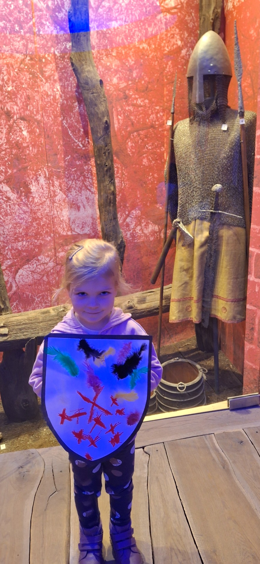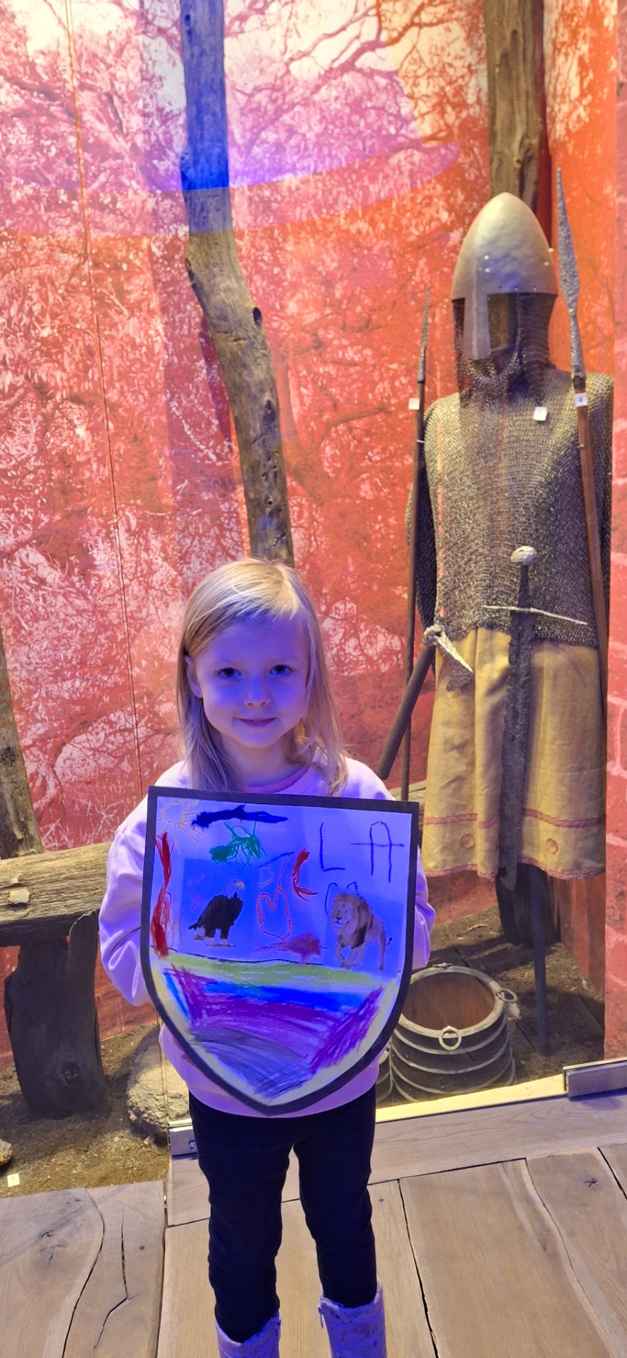 Przedszkolaki z młodszej grupy wzięły udział w zajęciach pt. „W czasach rycerzy”. Podczas wizyty w muzeum dzieci zobaczyły zabytki z czasów średniowiecza. Dowiedziały się, co oznacza być prawdziwym rycerzem i jak wyglądało życie tej grupy społecznej w czasach średniowiecza. Korzystając z przygotowanych szablonów, przedszkolaki tworzyły tarcze, dekorując je według własnego pomysłu.