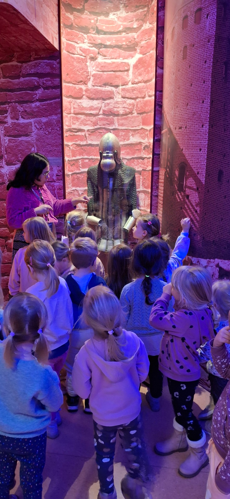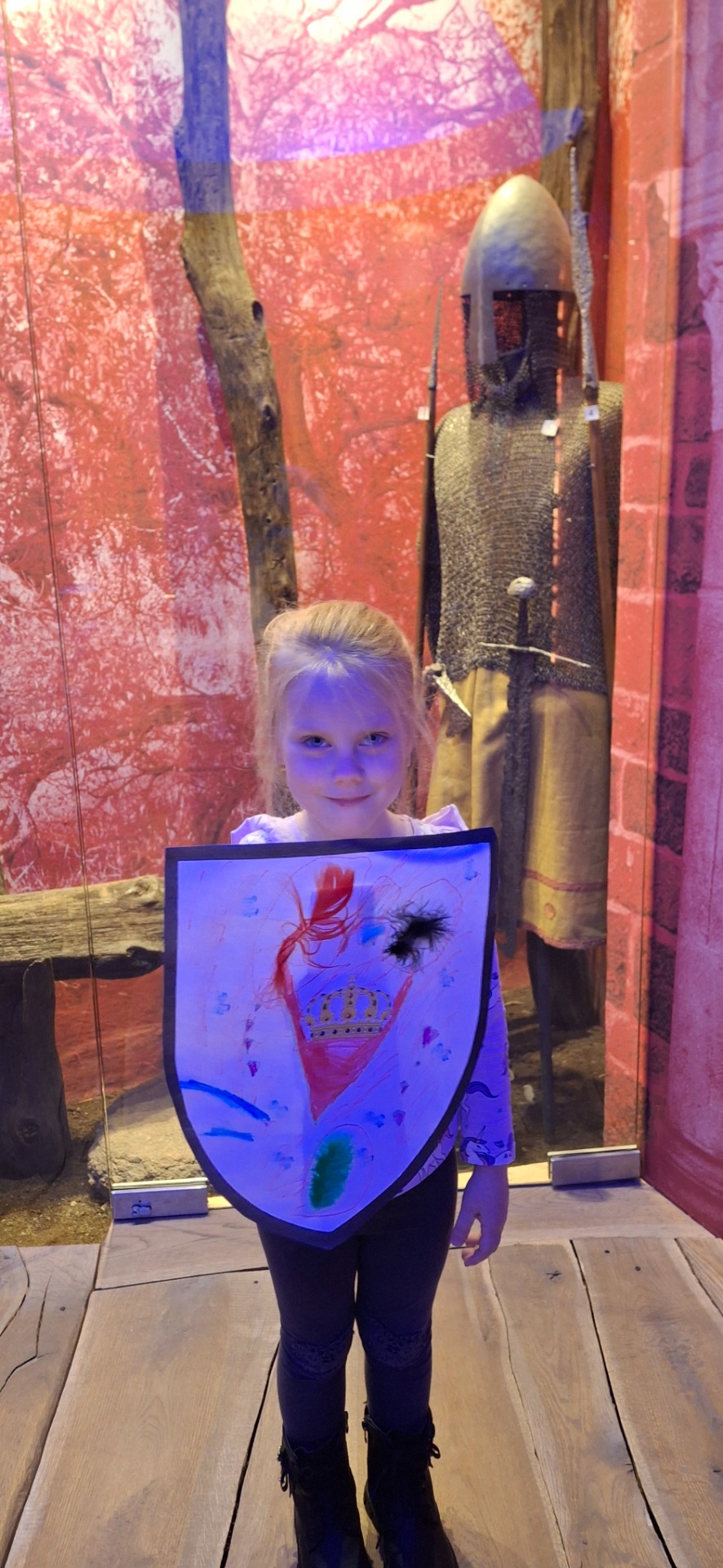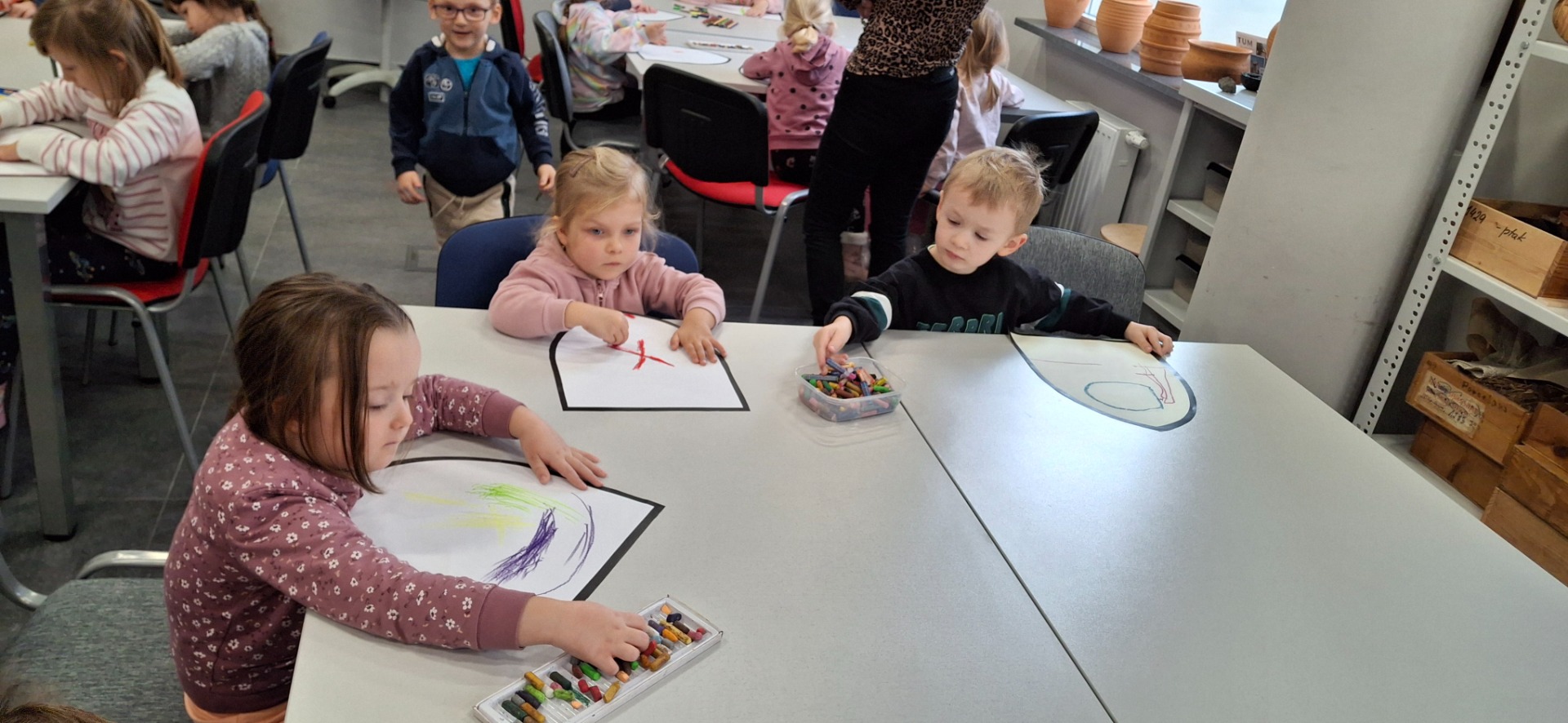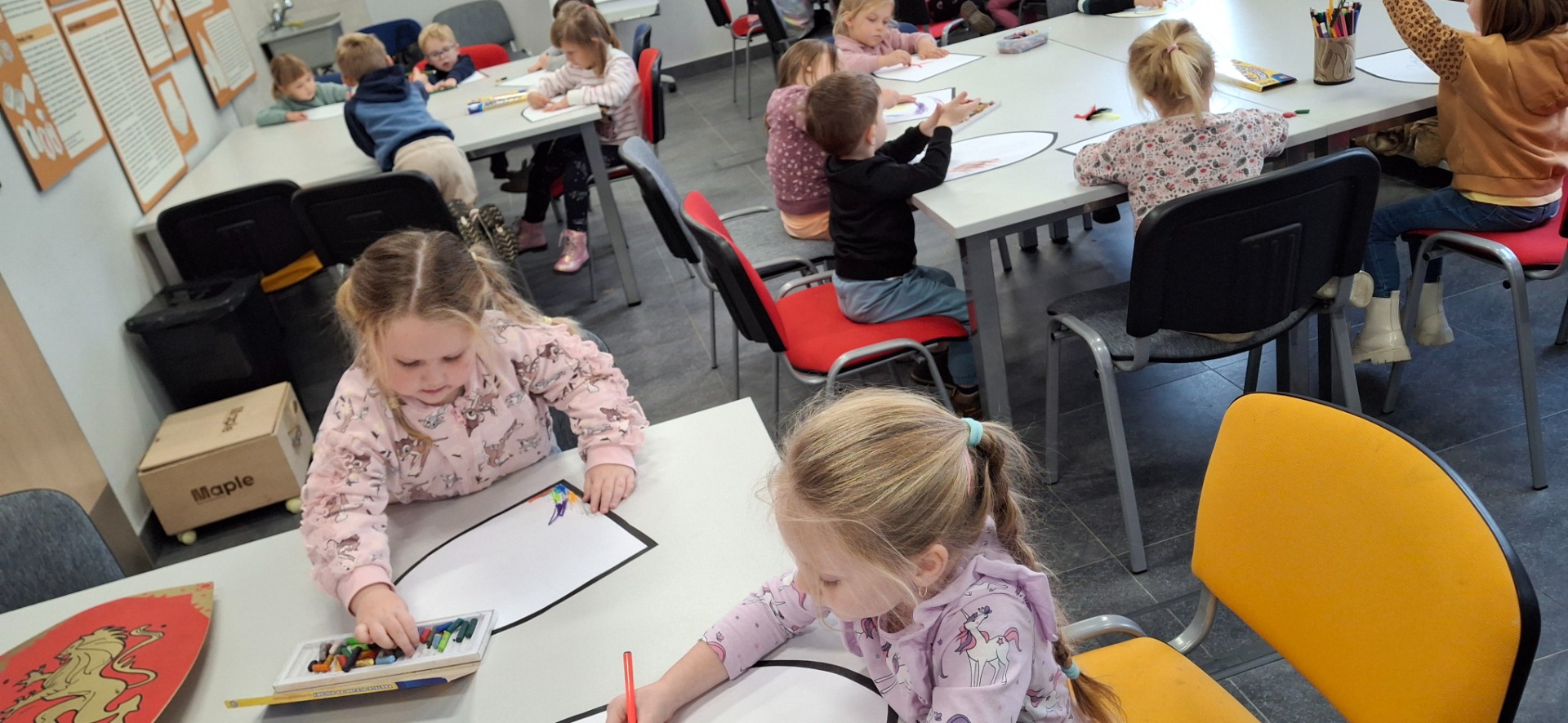 Przedszkolaki z młodszej grupy wzięły udział w zajęciach pt. „W czasach rycerzy”. Podczas wizyty w muzeum dzieci zobaczyły zabytki z czasów średniowiecza. Dowiedziały się, co oznacza być prawdziwym rycerzem i jak wyglądało życie tej grupy społecznej w czasach średniowiecza. Korzystając z przygotowanych szablonów, przedszkolaki tworzyły tarcze, dekorując je według własnego pomysłu.