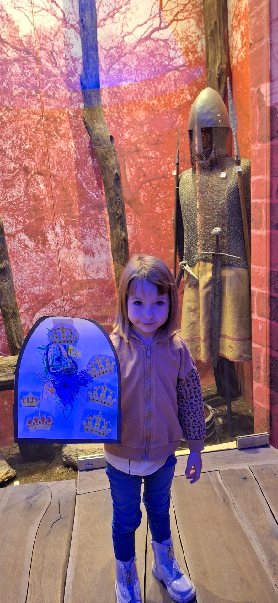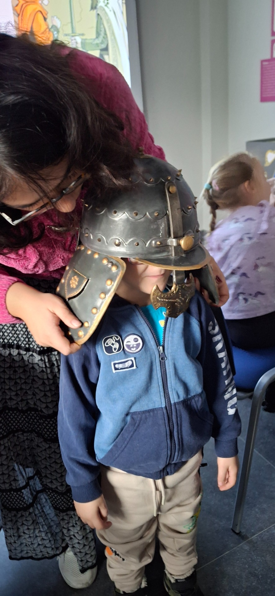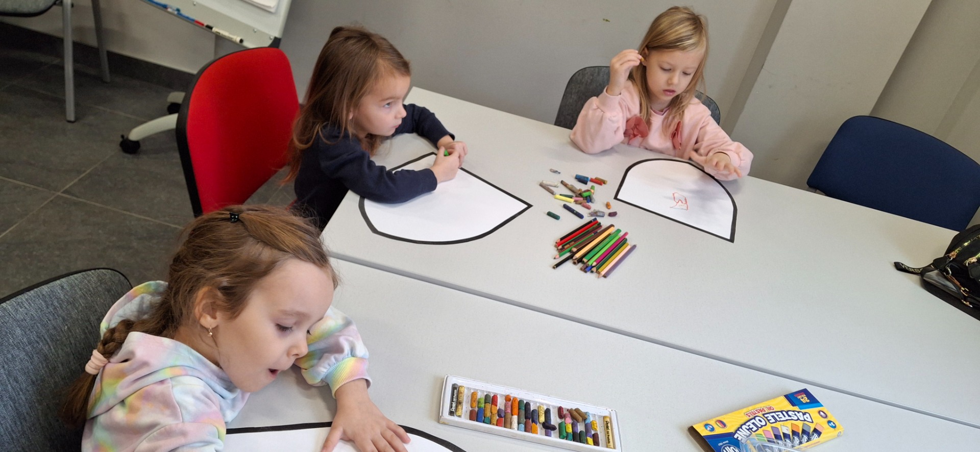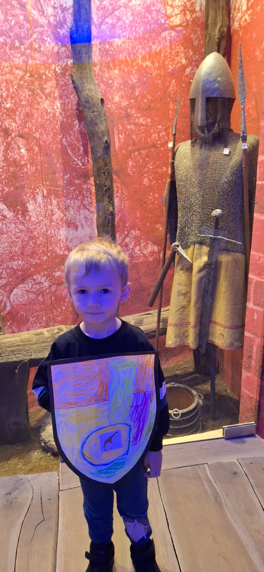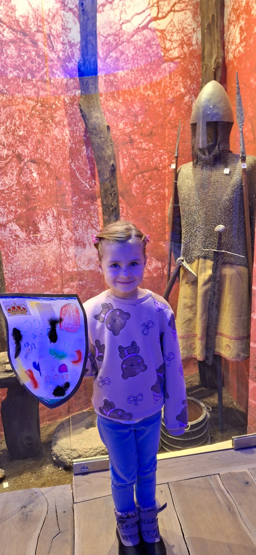 Przedszkolaki z młodszej grupy wzięły udział w zajęciach pt. „W czasach rycerzy”. Podczas wizyty w muzeum dzieci zobaczyły zabytki z czasów średniowiecza. Dowiedziały się, co oznacza być prawdziwym rycerzem i jak wyglądało życie tej grupy społecznej w czasach średniowiecza. Korzystając z przygotowanych szablonów, przedszkolaki tworzyły tarcze, dekorując je według własnego pomysłu.