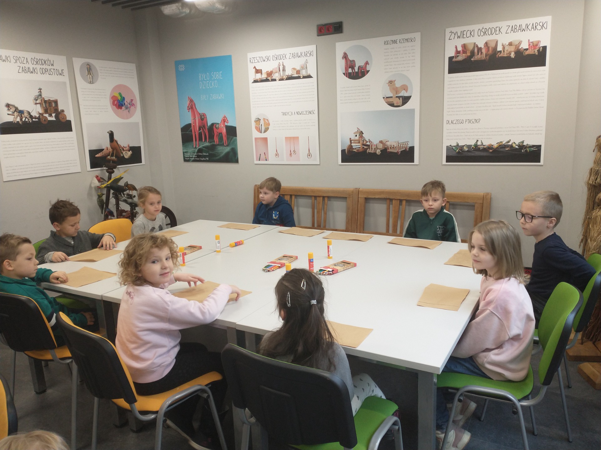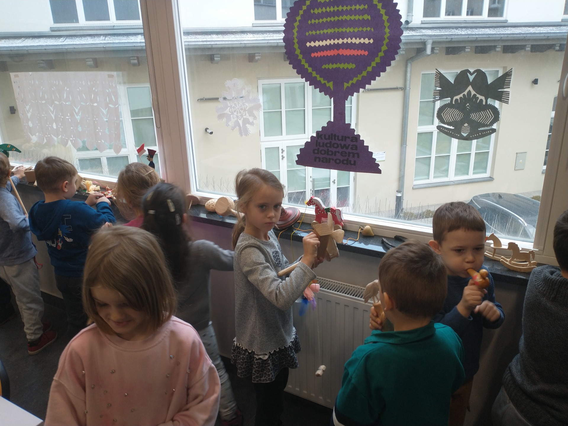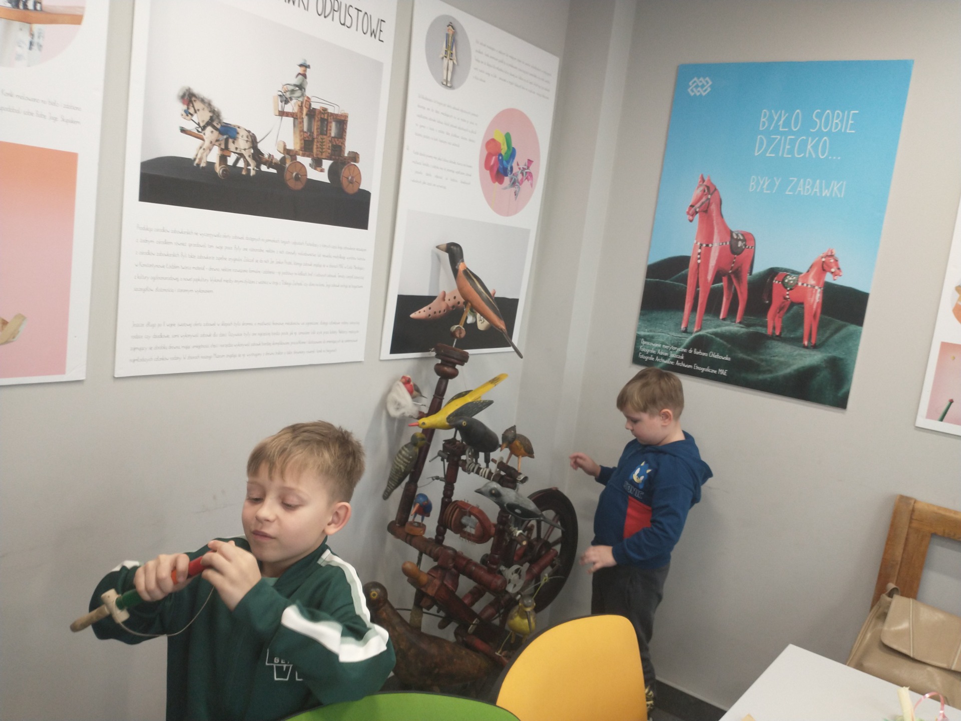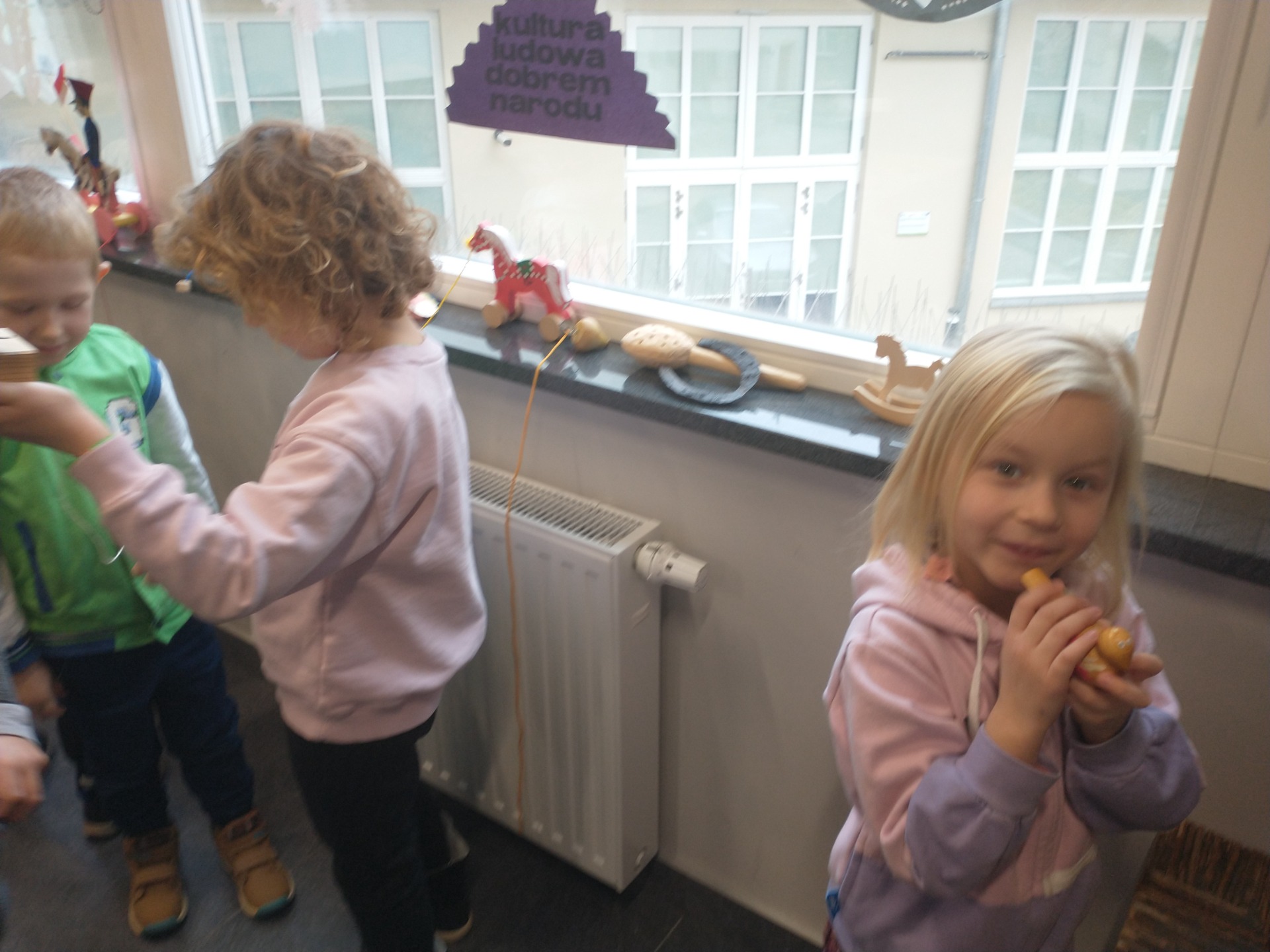 Starsze dzieci uczestniczyły w warsztatach pt. „Dawne zabawy i zabawki”. Dzieci obejrzały fragment wystawy etnograficznej, gdzie zobaczyły, jak wyglądało życie na wsi 100 lat temu i jaką rolę pełniły zabawy, a jaką obowiązki w codziennym życiu dzieci. Przedszkolaki miały okazję wziąć do rąk dawne, drewniane zabawki jarmarczne i poczuć ich magię.