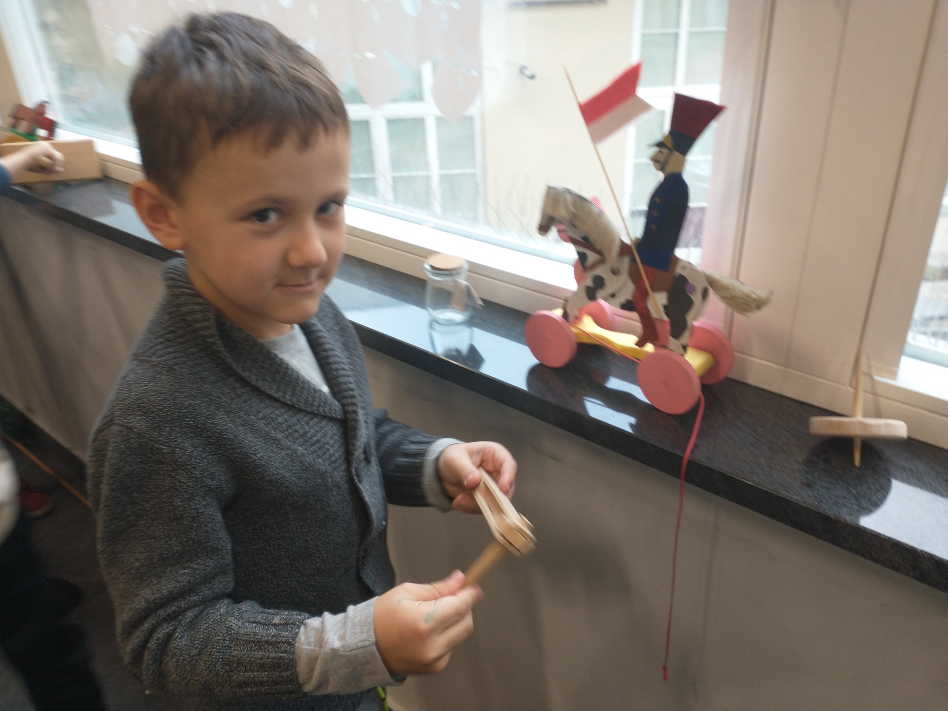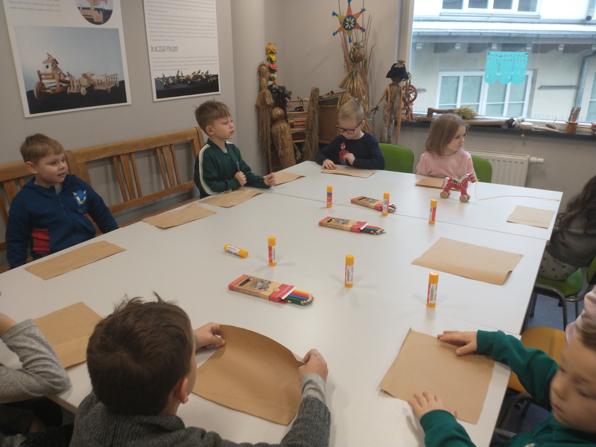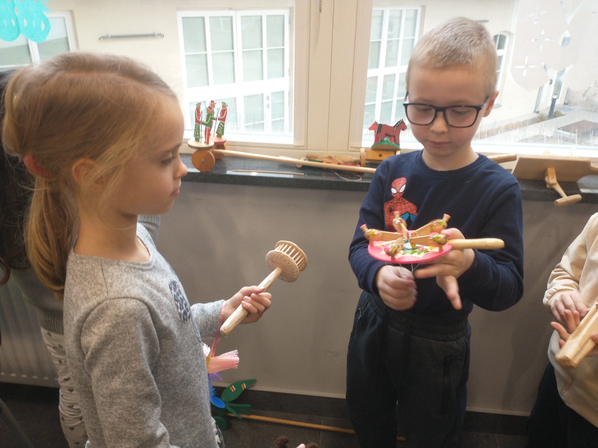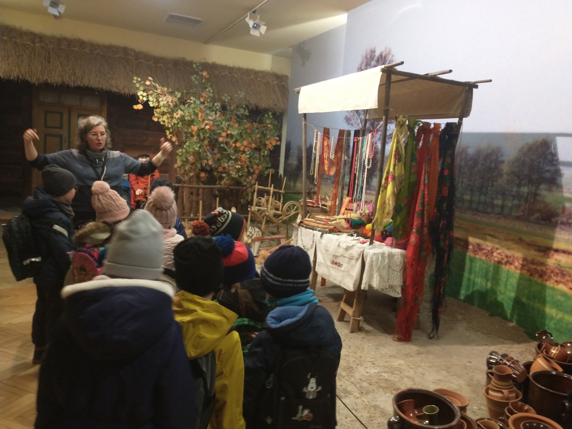 Starsze dzieci uczestniczyły w warsztatach pt. „Dawne zabawy i zabawki”. Dzieci obejrzały fragment wystawy etnograficznej, gdzie zobaczyły, jak wyglądało życie na wsi 100 lat temu i jaką rolę pełniły zabawy, a jaką obowiązki w codziennym życiu dzieci. Przedszkolaki miały okazję wziąć do rąk dawne, drewniane zabawki jarmarczne i poczuć ich magię.